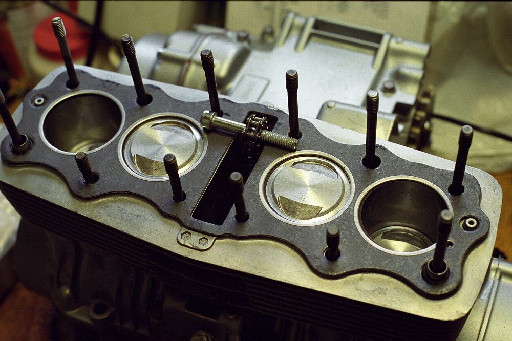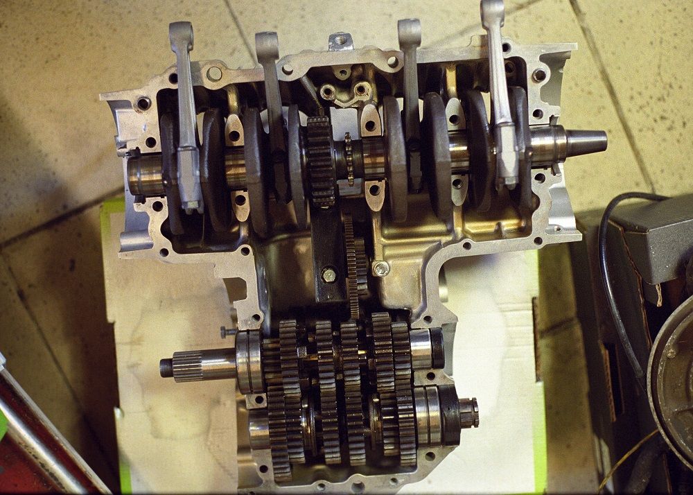 Beim Aufbau des Motors war hilfreich, dass ich einige Zeit zuvor einen Ersatzmotor für meine Straßen-400-Four zusammengeschraubt hatte, mit der Technik also bereits vertraut war. Allerdings war bei dem Rennmotor sehr viel Sorgfalt und Präzision erforderlich. Außerdem war die Basis in einem miserablen Zustand. Nicht nur gründlichste Reinigung, Glasperlstrahlen und Lackieren waren angesagt. Ein Stehbolzen fehlte, da er samt Gewinde im Kurbelgehäuse weggebrochen war. Ein klarer Fall für den Alu-Schweißer meines Vertrauens. Nach dem Schweißen war sorgfältiges Verputzen und Planen auf meiner kleinen Tischfräse und Bohren und Schneiden eines neuen Gewindes angesagt. Scheint funktioniert zu haben, hat immerhin zwölf Jahre Rennstrecke überstanden.