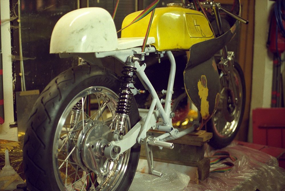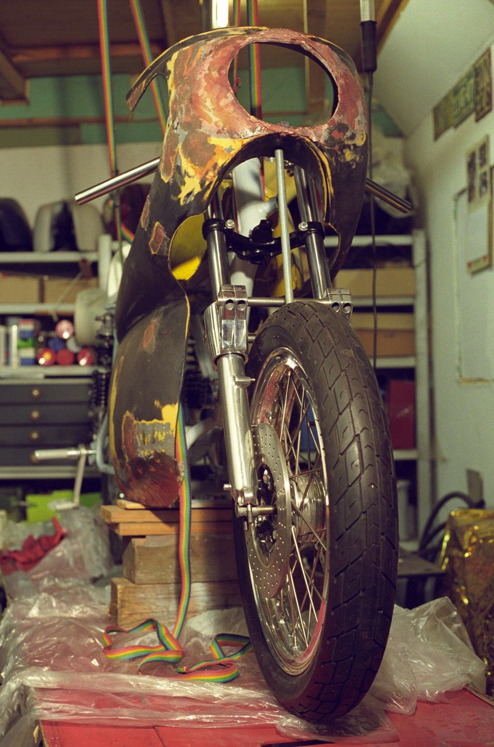 Geduld und regelmäßiges Suchen auf Märkten, bei Hobby-Kollegen und im Internet können aber erhebliches Einsparpotenzial entwickeln, was in meinem Fall unumgänglich war. Der Rahmen und einige andere Teile, wie ein völlig ruinierter Motor einer preiswerten Schlachtmaschine, lagen noch in meinem Fundus, die sehr seltene Bimota-Schwinge (die dann doch einige Nacharbeit erforderlich machte, da die nachgebaute Achsklemmung fehlerhaft war) kam von einem Clubkollegen, der handgearbeitete Tank lag bei einem Freund noch im Regal. Und die Habermann-Verkleidung einer CB 450 K war dreißig Jahre lang mit mir viele Male umgezogen. Und bei jedem Umzug hab ich überlegt, ob ich sie entsorge …