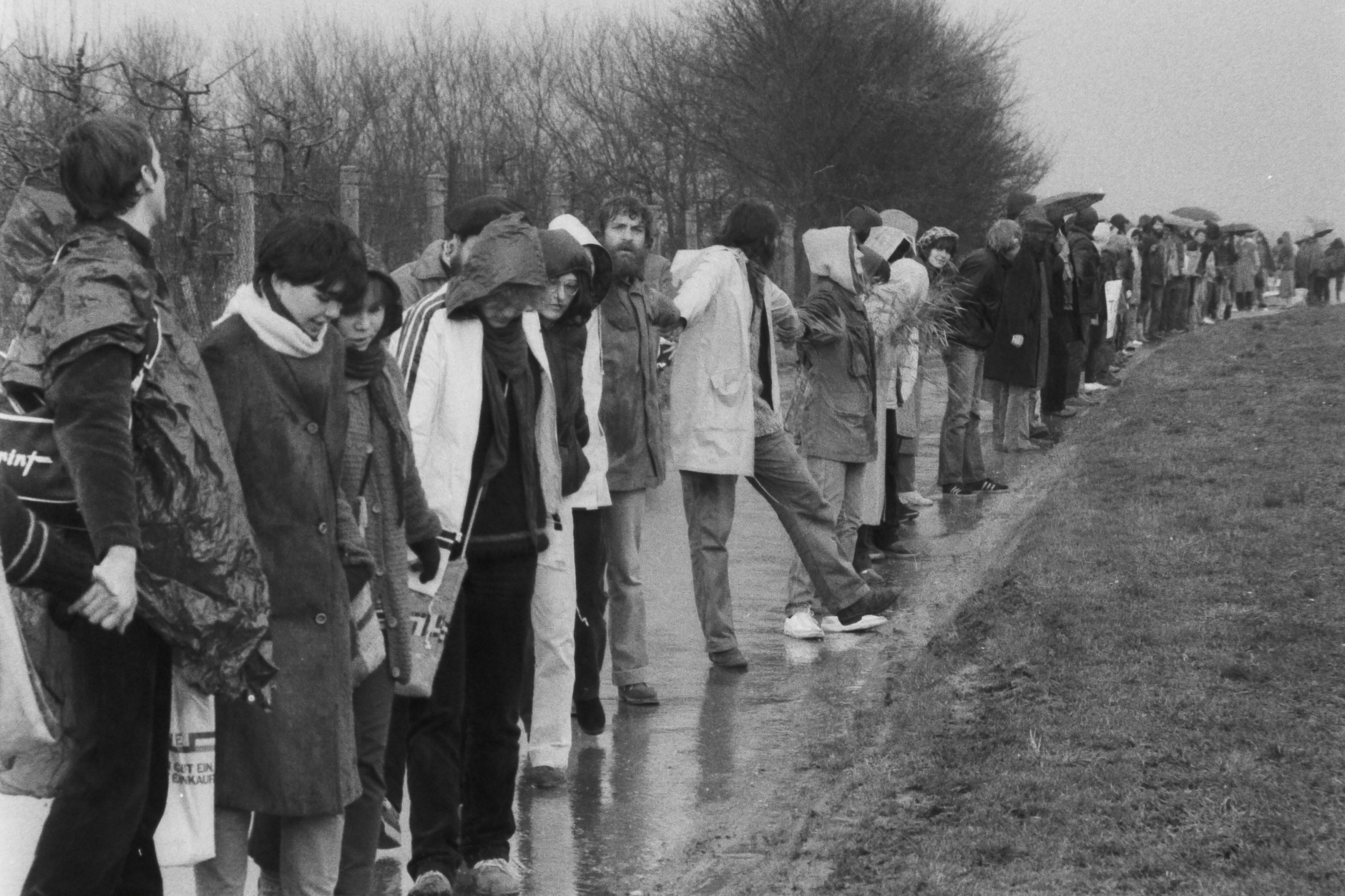 Mutlangen: Den Vorlauf machten einige Dutzend Blockierer in den Ostertagen 1983, die für ein paar Stunden eine Menschenkette mit Sitzblockade organisierten.