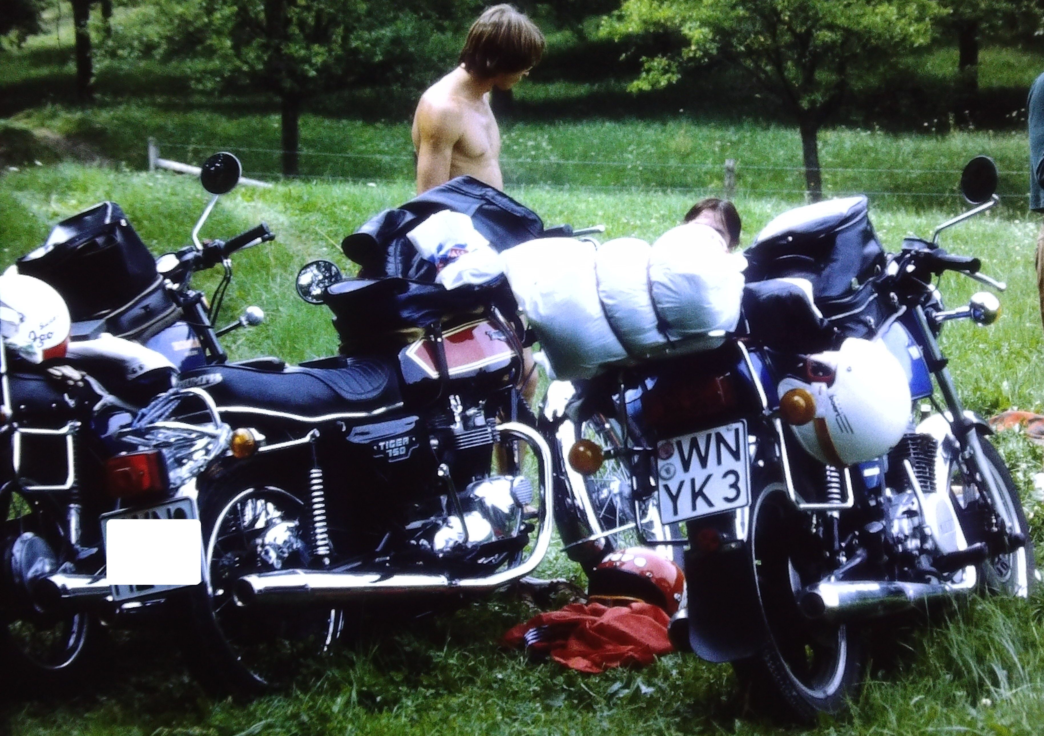 Und so, wie wir uns auf unsere Motorräder verlassen konnten, so zuverlässig funktionierten auch gemeinsame Touren. Albert hatte die XT an einen gemeinsamen Freund verkauft, der mit einem Motorschaden in Südfrankreich gestrandet war. Kurzerhand packte er Werkzeug ein und dirigierte die Tiger Richtung Südwesten. Die XT wurde auf dem Campingplatz repariert und Albert trudelte absolut pünktlich zu unserer geplanten Sommerfete am Zwiebelberg wieder ein: Er war vom französischen Mittelmeer nonstop bis nach Backnang durchgebrummt.