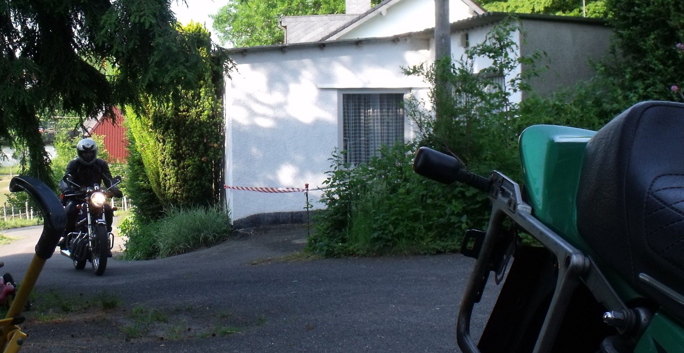 Tatsächlich bin ich im Sommer viele Jahre lang an schönen Tagen über Landstraßen im Bergischen Land mit dem Motorrad zur Arbeit gefahren. Und einmal hat mir Albert mit der Kamera in unserer Garageneinfahrt aufgelauert, als ich nach Hause kam.