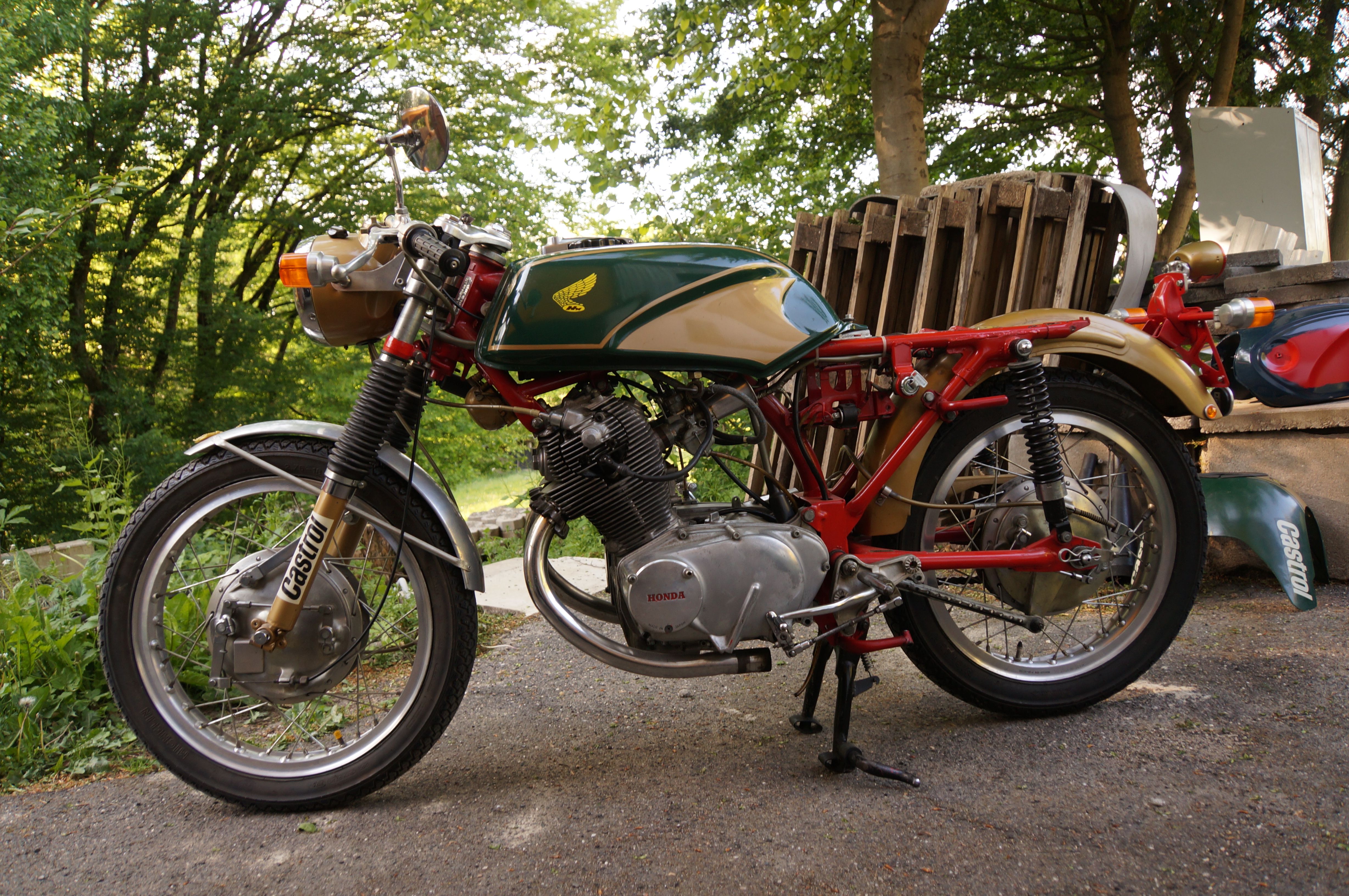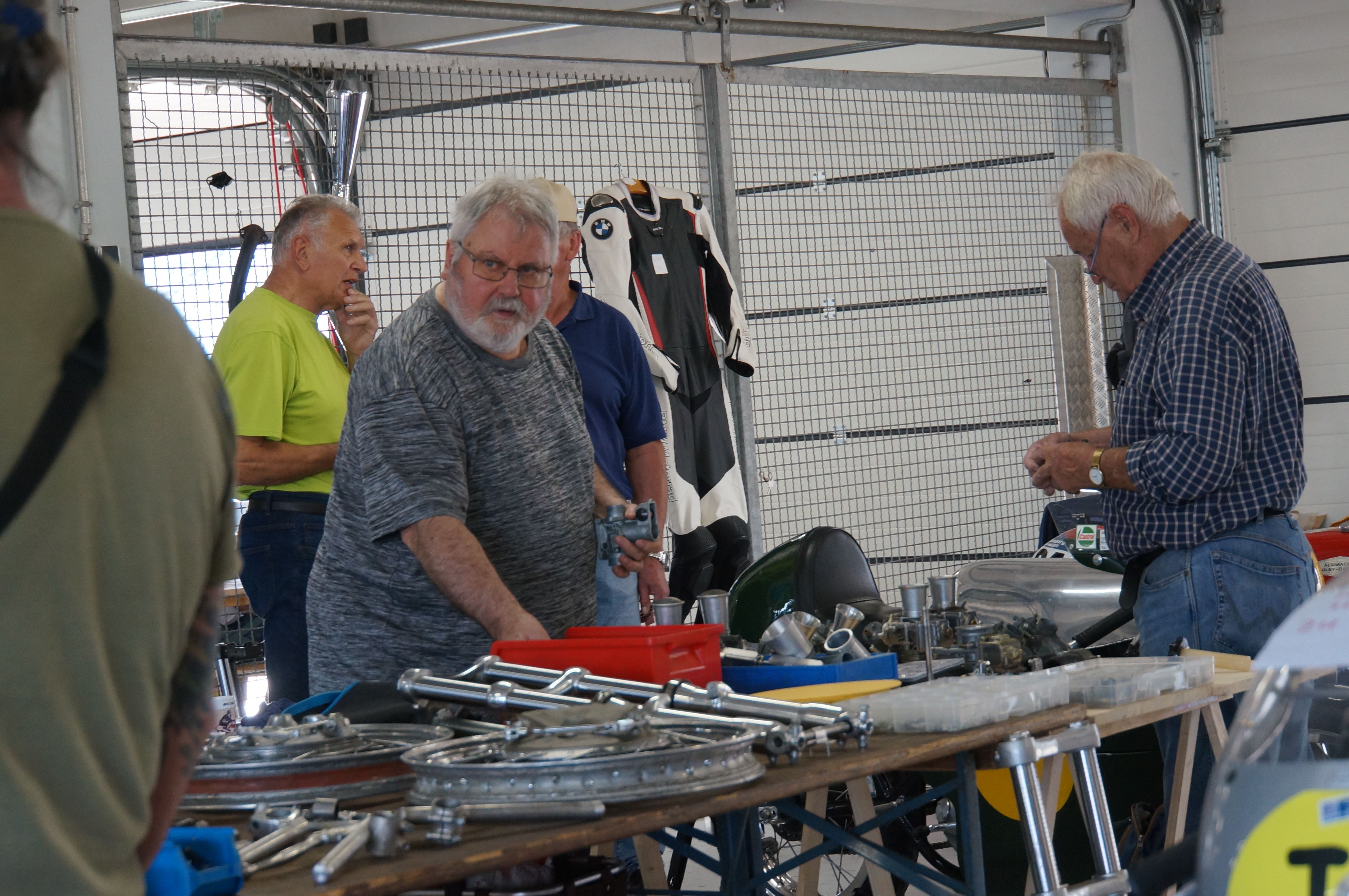 Eine wirklich schöne und anrührende Begegnung hatte kurz danach. Ago zupfte plötzlich an meinem Ärmel und meinte: „Da drüben ist ein Verkaufsstand für Dich.“ Und tatsächlich lagen da mehrere Meter Verkaufstisch mit allerlei CB72 und CB77-Teilen voll. Gebrauchtes, piekfein aufbereitetes und neues Material, bis hin zu Racing-Nockenwellen. Und ganz hinten links lag ein alter Tank mit einer Lackierung die nicht serienmäßig, aber mir bestens bekannt war. Das Motorrad dazu steht nämlich in meiner Garage bei den Projekten.
