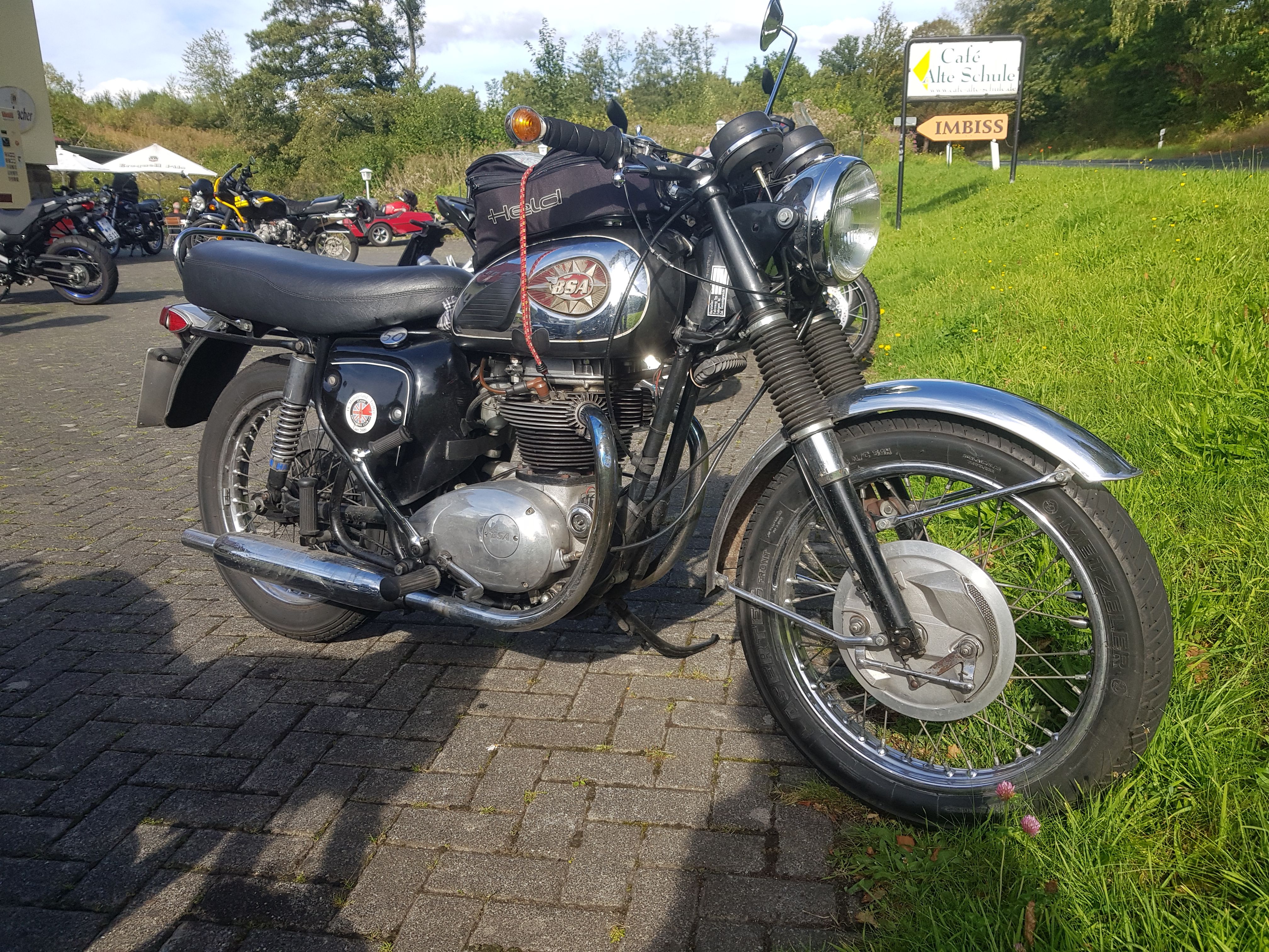 Im Juli am Nürburgring beim Kölner Kurs war mir eine 500er Weslake aufgefallen, Motoren aus diesem Hause bekommt man nicht so oft zu sehen. Und besonders beeindruckend war die hohe Zahl an Abnahme-Aufklebern des Manx Grand Prix. Einige Zeit später drehte ich noch eine kleine Runde mit der Clubman und legte eine Kaffeepause an der Alten Schule ein. Der Parkplatz war wie meist recht voll und ausschließlich mit aktuellen Motorrädern belegt. Einzige Ausnahme war eine Zweizylinder-BSA. Und was mir besonders gefiel: Sie war nicht hochglanzpoliert und zeigte deutliche Spuren einer Regenfahrt.