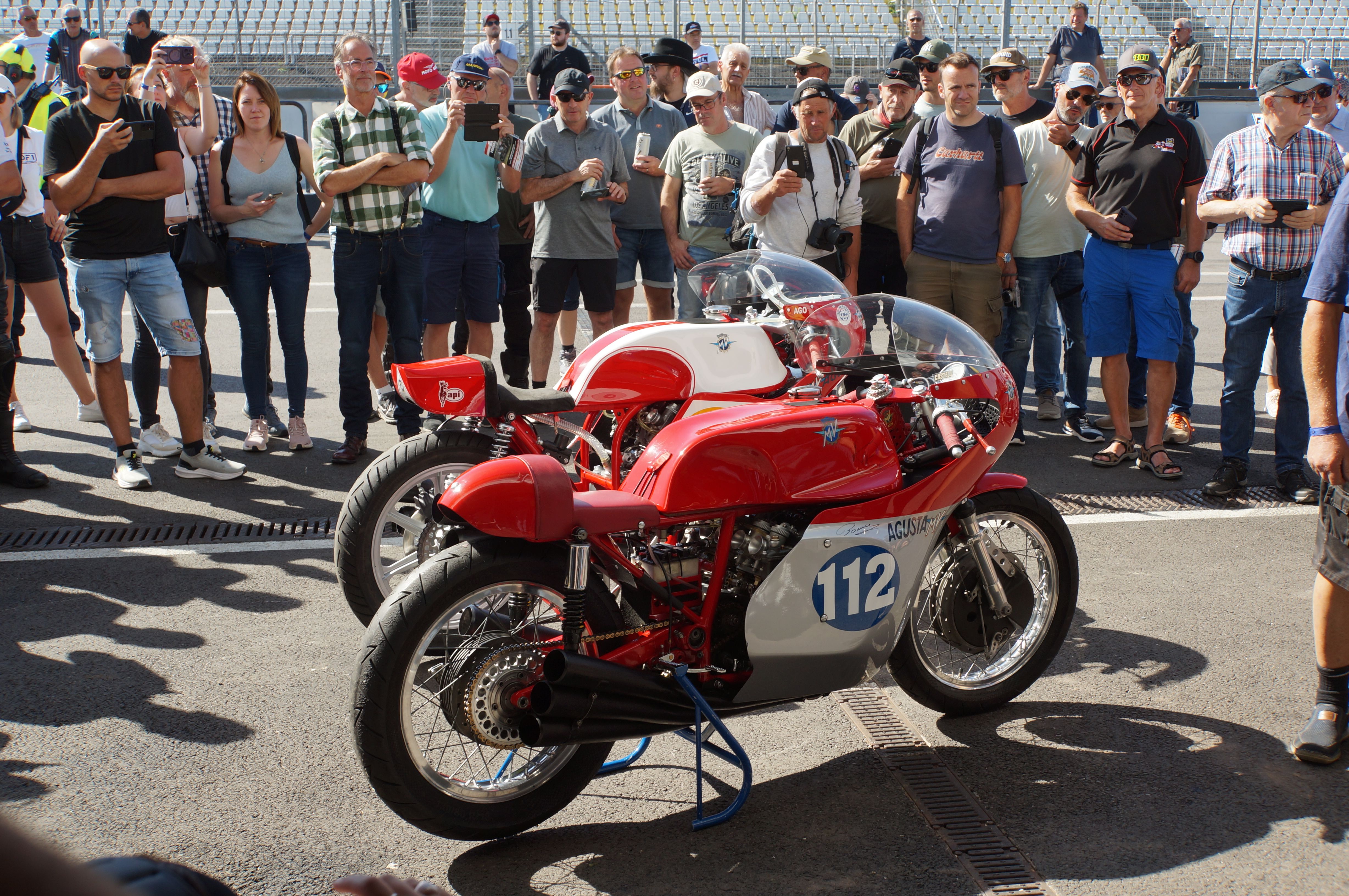Als ich mit Torsten (von uns immer Ago genannt) bei den Hockenheim-Classics durch die Boxen lief, um die Maschinen des Sonderlaufs anzusehen, blieben wir zwangsläufig an einer ganz bestimmten originalen Werks-Renn-MV-Agusta hängen. Es war die MV, auf der Giacomo Agostini (genannt Ago) gegen die Zweitakt-Übermacht 1976 auf dem Nürburgring ein letztes Mal einen Grand-Prix-Sieg mit einem Viertakter, und den letzten Sieg für MV holte. Daneben stand die MV-Sechszylinder und eine weitere Werks-MV. Und bald kamen wir mit dem Besitzer ins Gespräch. Die Sieger-Maschine hatte er Rob Iannuchi abgekauft, und aufwendig restauriert, wie alle MV-Werksrenner seiner Sammlung. Und sein Sohn ließ sie dann im Sonderlauf entsprechend brüllen.