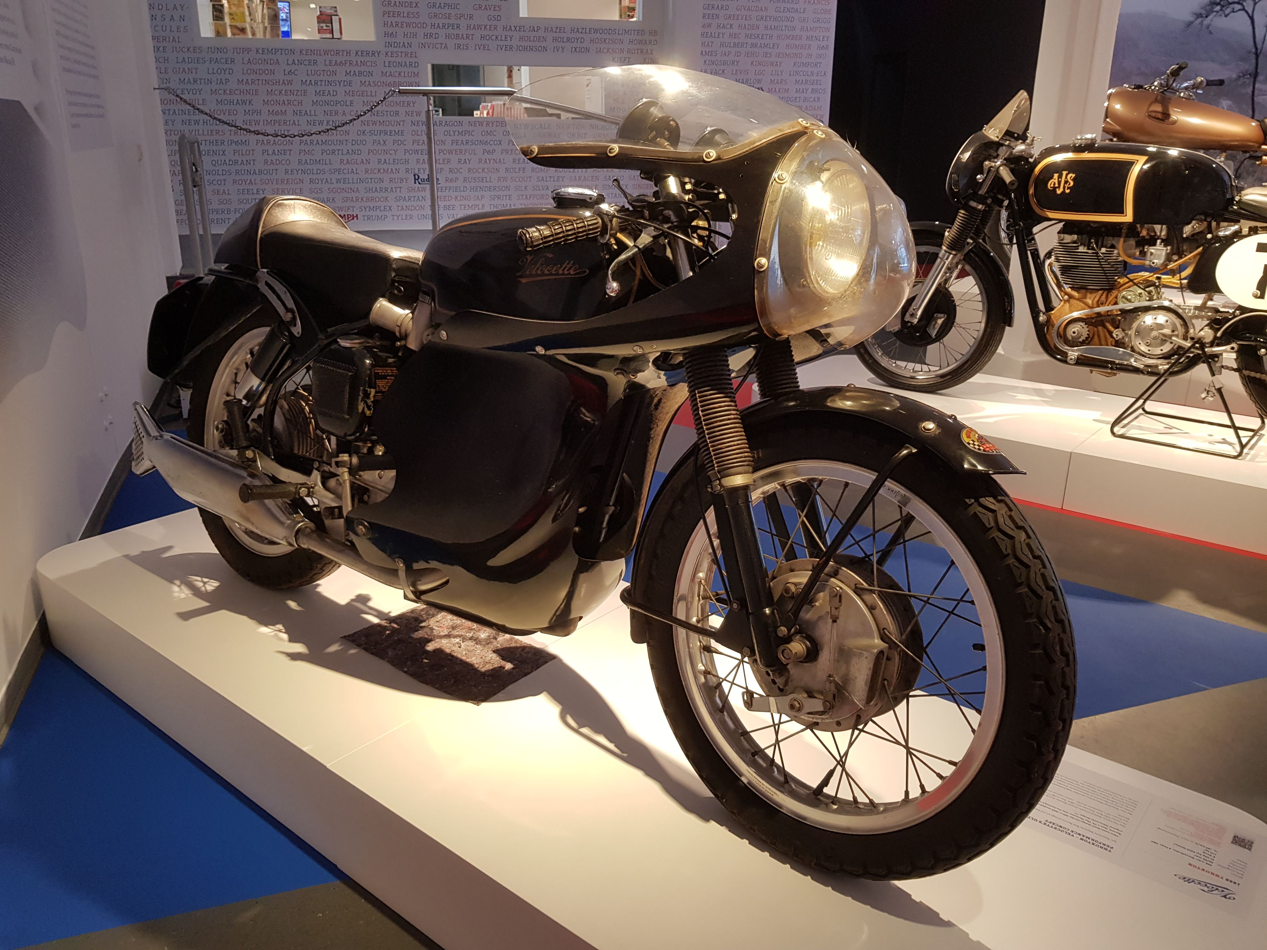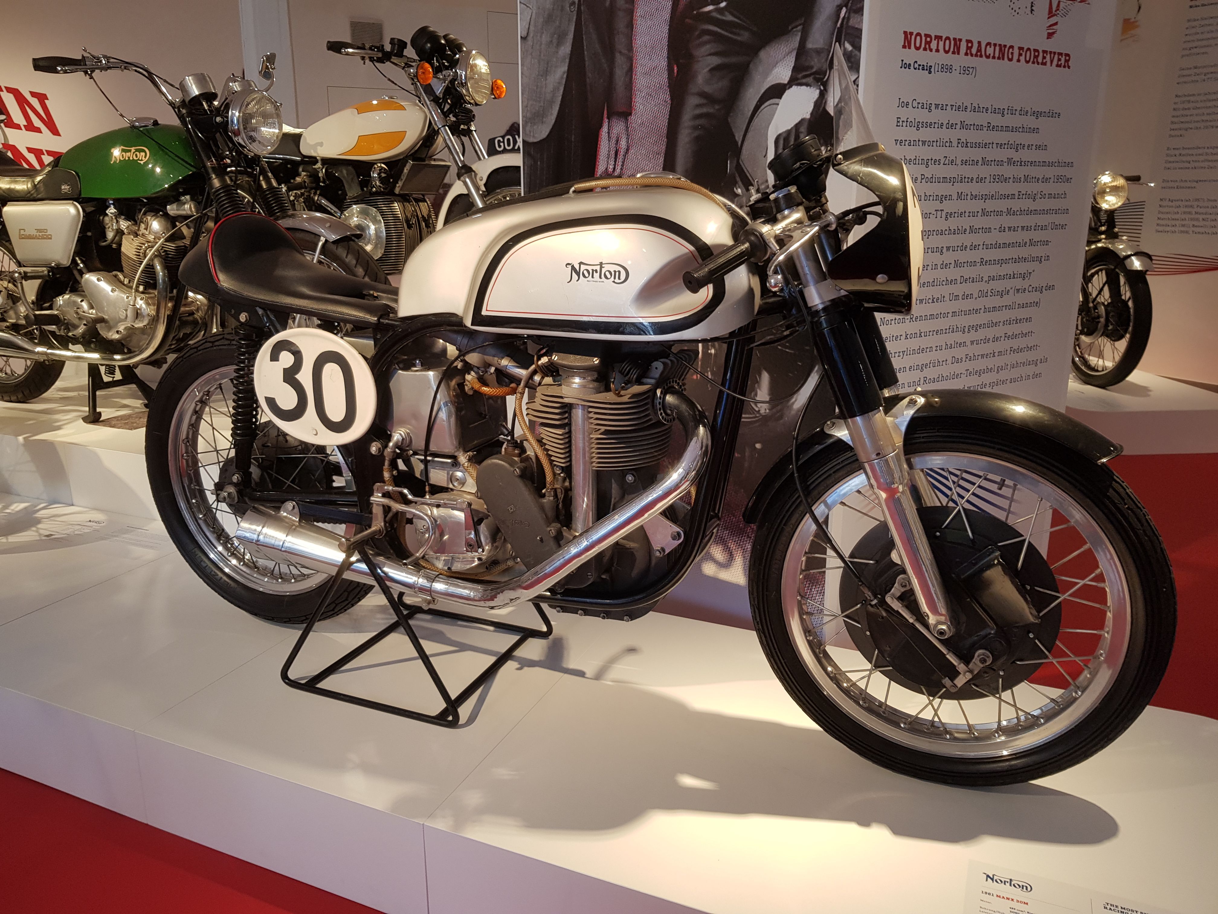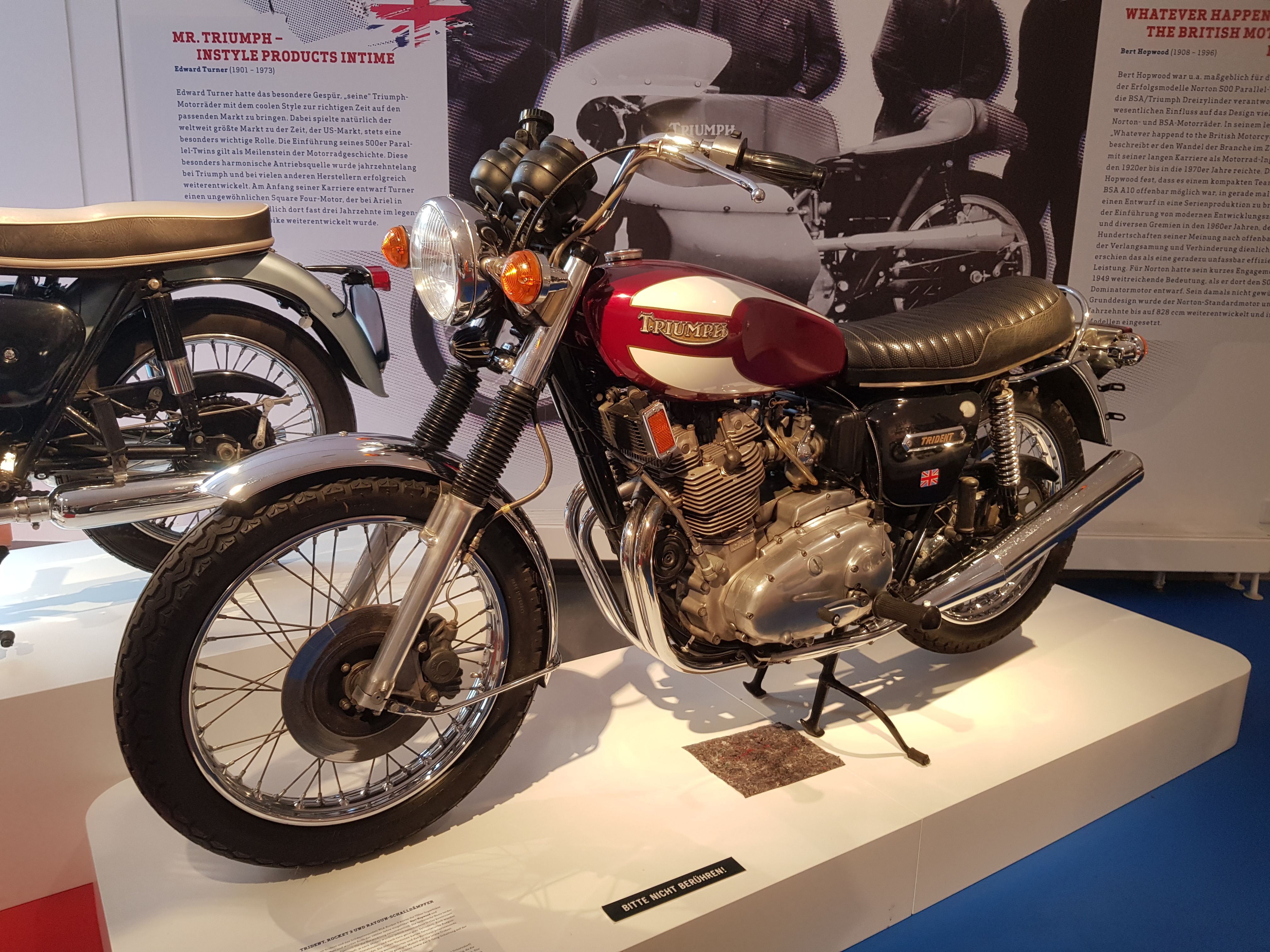 Auch sowas finde ich immer interessant: Fahrzeuge, mit denen sehr lange Reisen unternommen wurden.Die Reiseroute kann man hier nachlesen.In der Sonderausstellung wurden die üblichen englischen Juwelen gezeigt. Brough Superior (Lawrence von Arabien lässt grüßen)……Vincent……Norton Manx……Velocette……AJS……Triumph……und eine Norton Fastback. Besonders interessant aber ist die Norton Wankel im Hintergrund. Ihr Motor steckt in einem Triumph-Trident-T160-Fahrwerk. Was wohl Alois dazu sagt?Tatsächlich fand sich die T160, der letzte englische Triple klassischer Bauart, auch in der Ausstellung.
