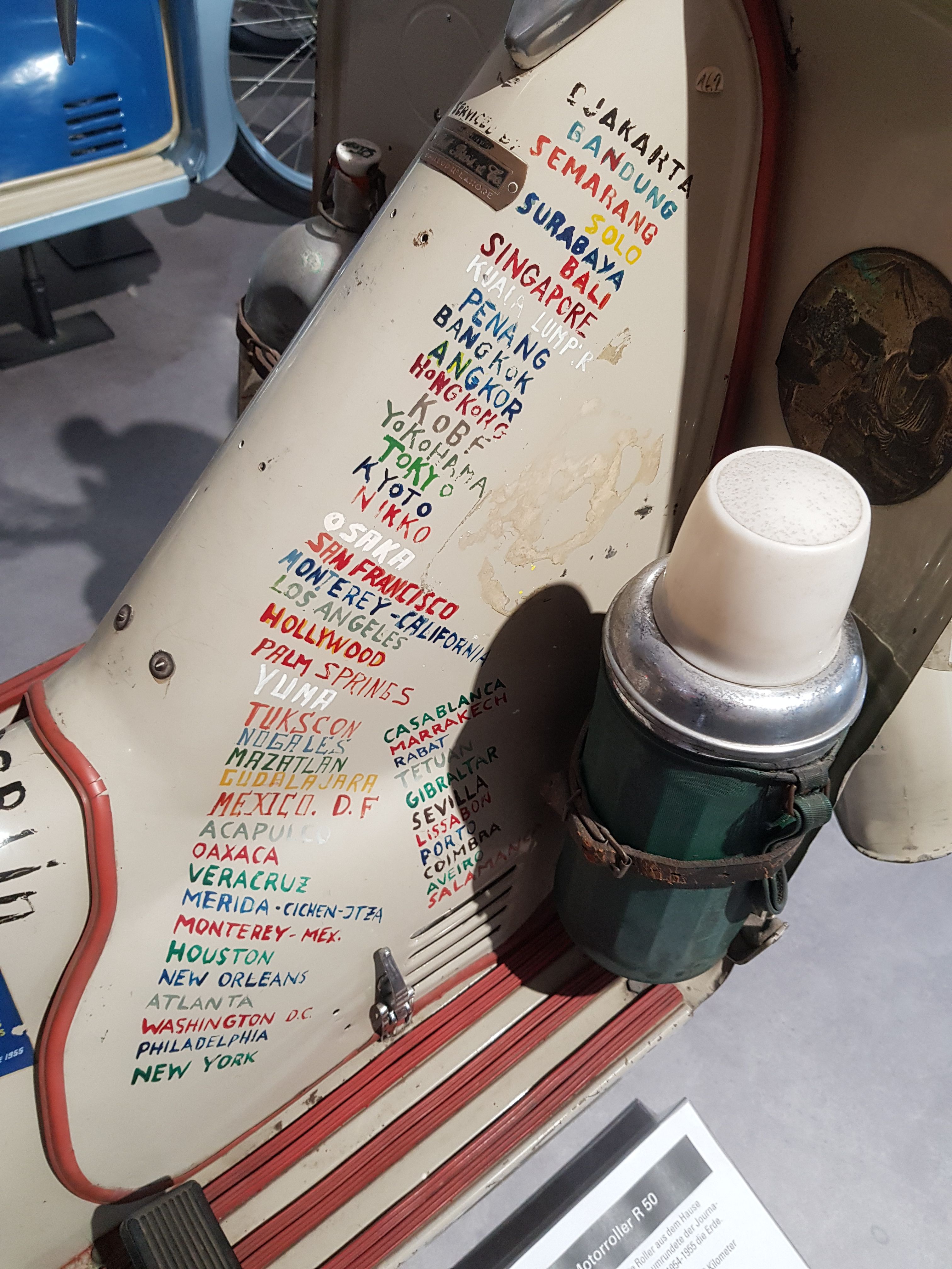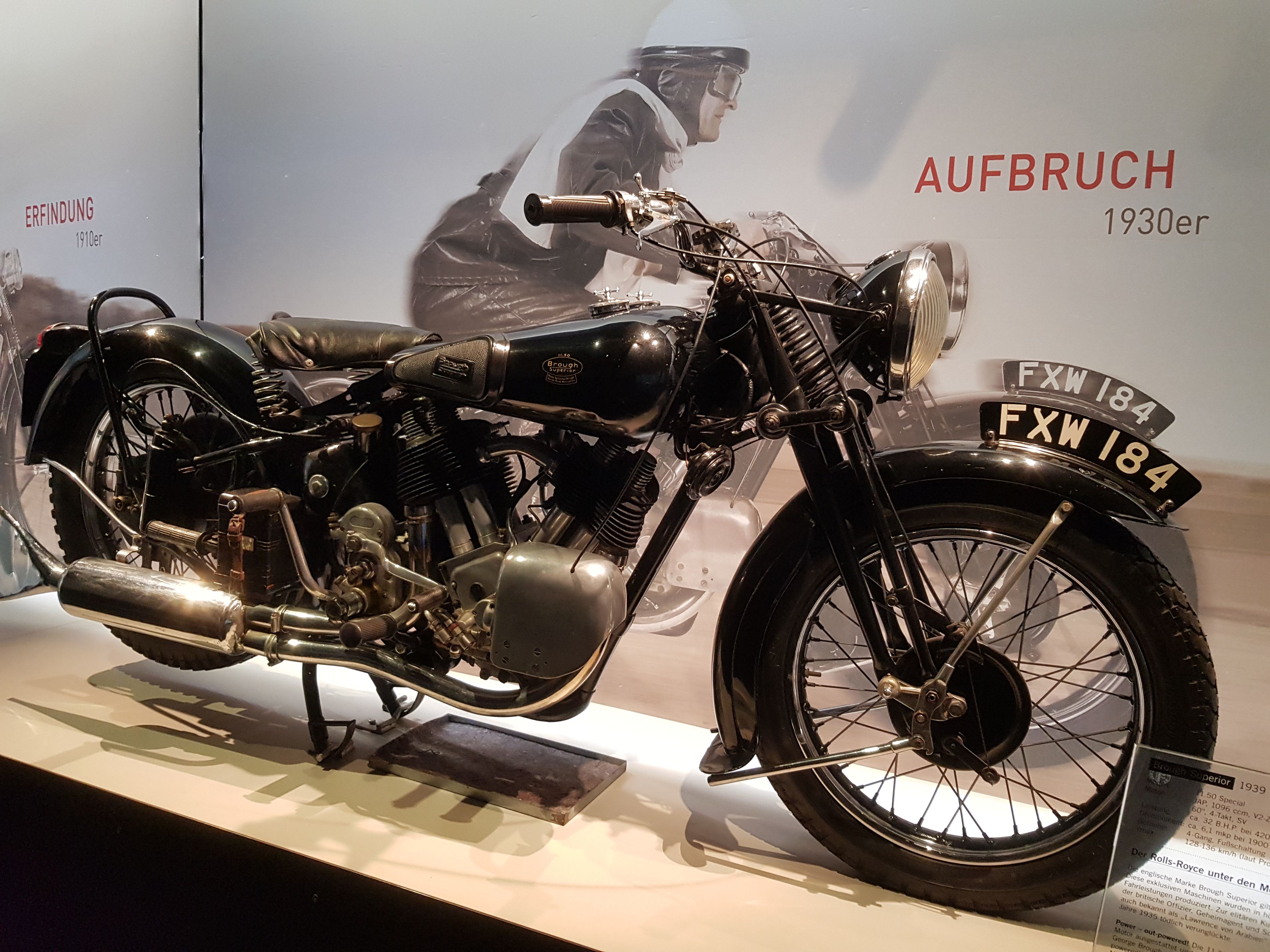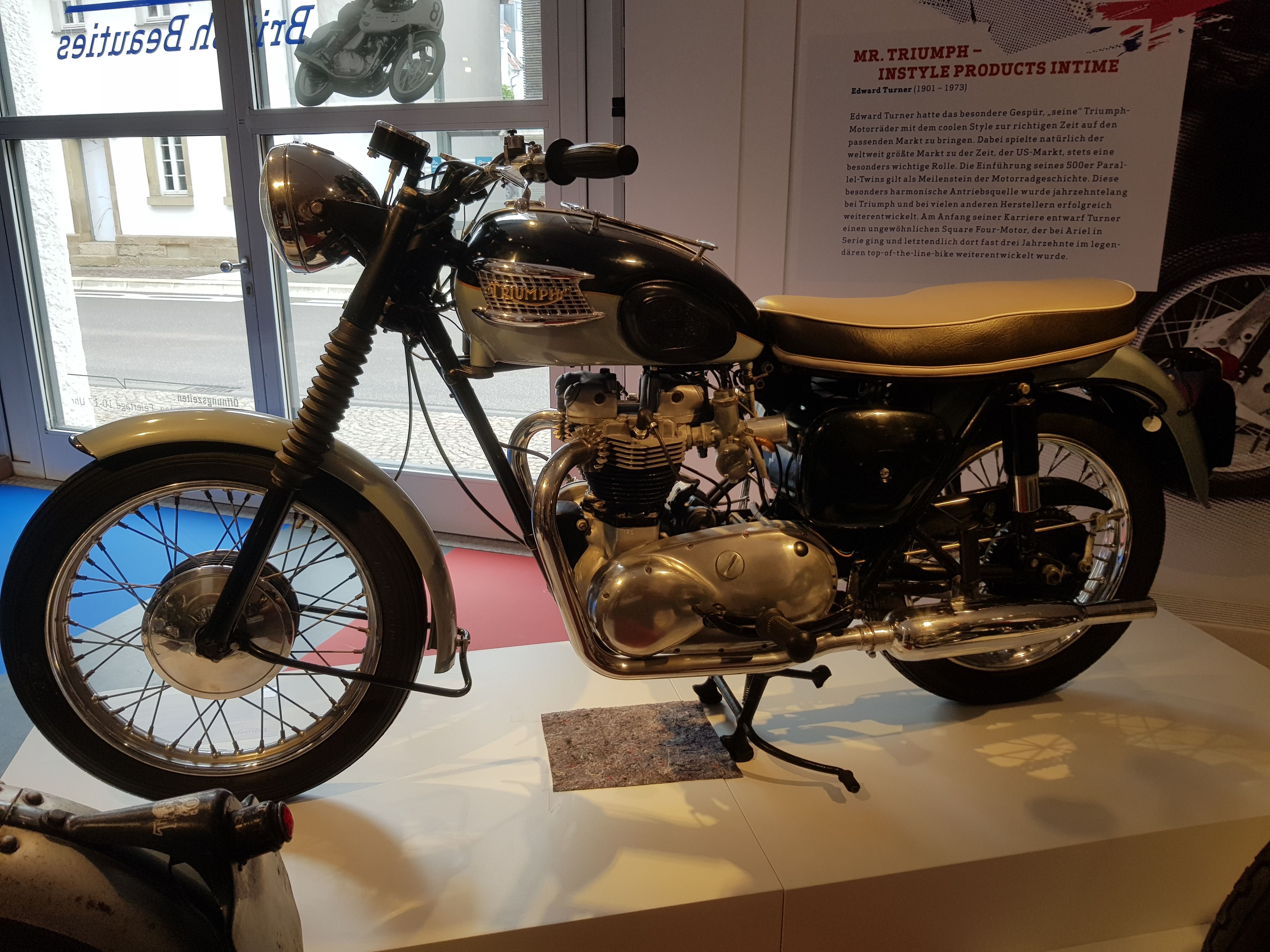 Auch sowas finde ich immer interessant: Fahrzeuge, mit denen sehr lange Reisen unternommen wurden.Die Reiseroute kann man hier nachlesen.In der Sonderausstellung wurden die üblichen englischen Juwelen gezeigt. Brough Superior (Lawrence von Arabien lässt grüßen)……Vincent……Norton Manx……Velocette……AJS……Triumph……und eine Norton Fastback. Besonders interessant aber ist die Norton Wankel im Hintergrund. Ihr Motor steckt in einem Triumph-Trident-T160-Fahrwerk. Was wohl Alois dazu sagt?Tatsächlich fand sich die T160, der letzte englische Triple klassischer Bauart, auch in der Ausstellung.