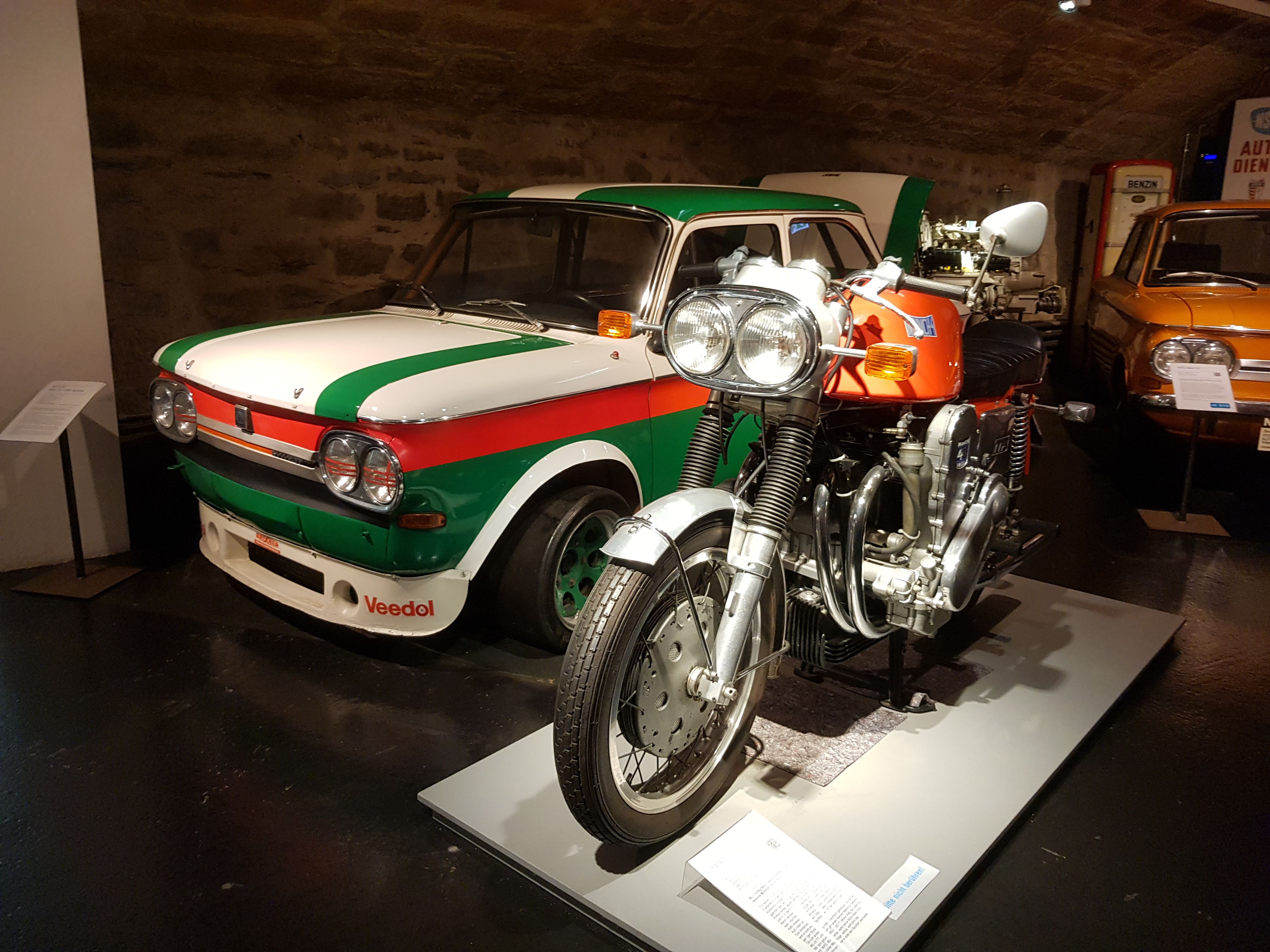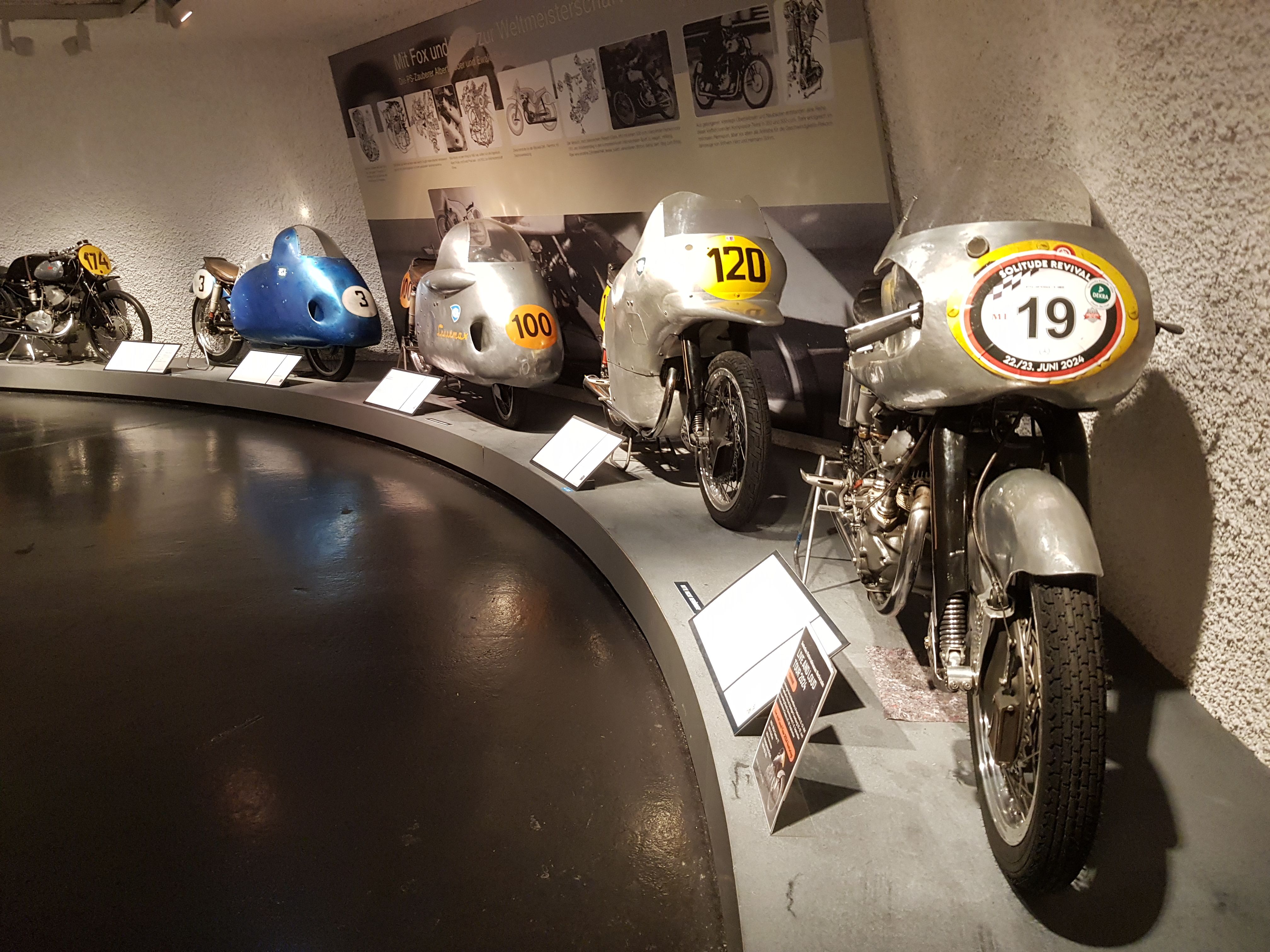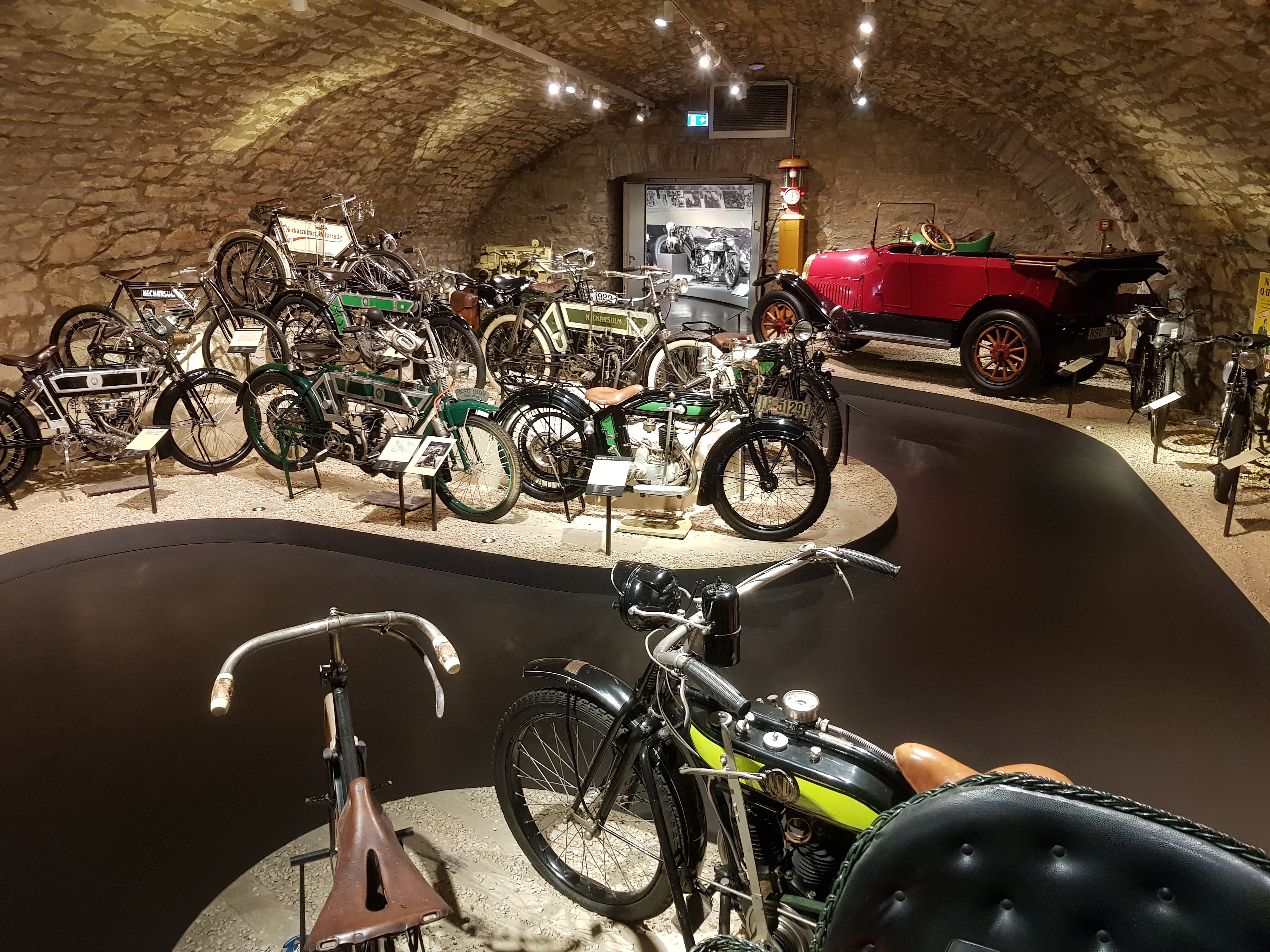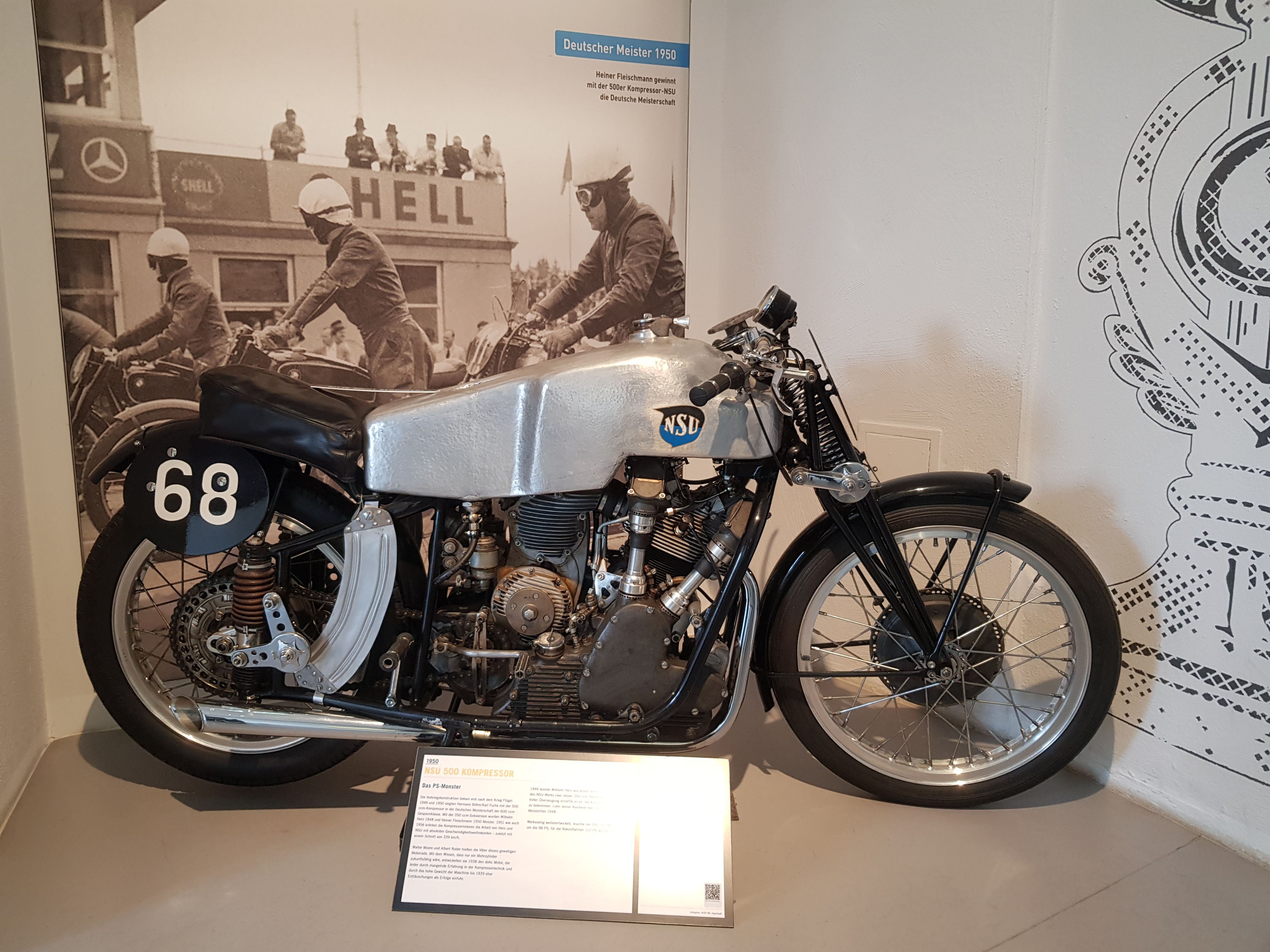 Der Rundgang beginnt bei den sehr frühen Fahrzeugen im alten Gewölbekeller, einem wie dafür geschaffenen Raum. Ich spare mir hier, viel Text zu schreiben, Fotos sagen da sehr viel mehr. Außerdem lässt sich die NSU-Geschichte nicht in wenig Worte zusammenfassen. Der ehemals weltgrößte Motorradhersteller, dessen Fahrer auch diverse Weltmeisterschaften gewannen und Weltrekorde aufstellten, bietet zu viel Erzählenswertes. Wer sich mehr informieren möchte, dem sei das Buch „NSU – Der Weg zur Motorrad-Weltmeisterschaft“ von Jürgen Nöll und Wolfgang Schneider empfohlen. Es erzählt zwar nicht die ganze Geschichte von NSU, aber die sicherlich spannendste Zeit der Fünfziger Jahre.