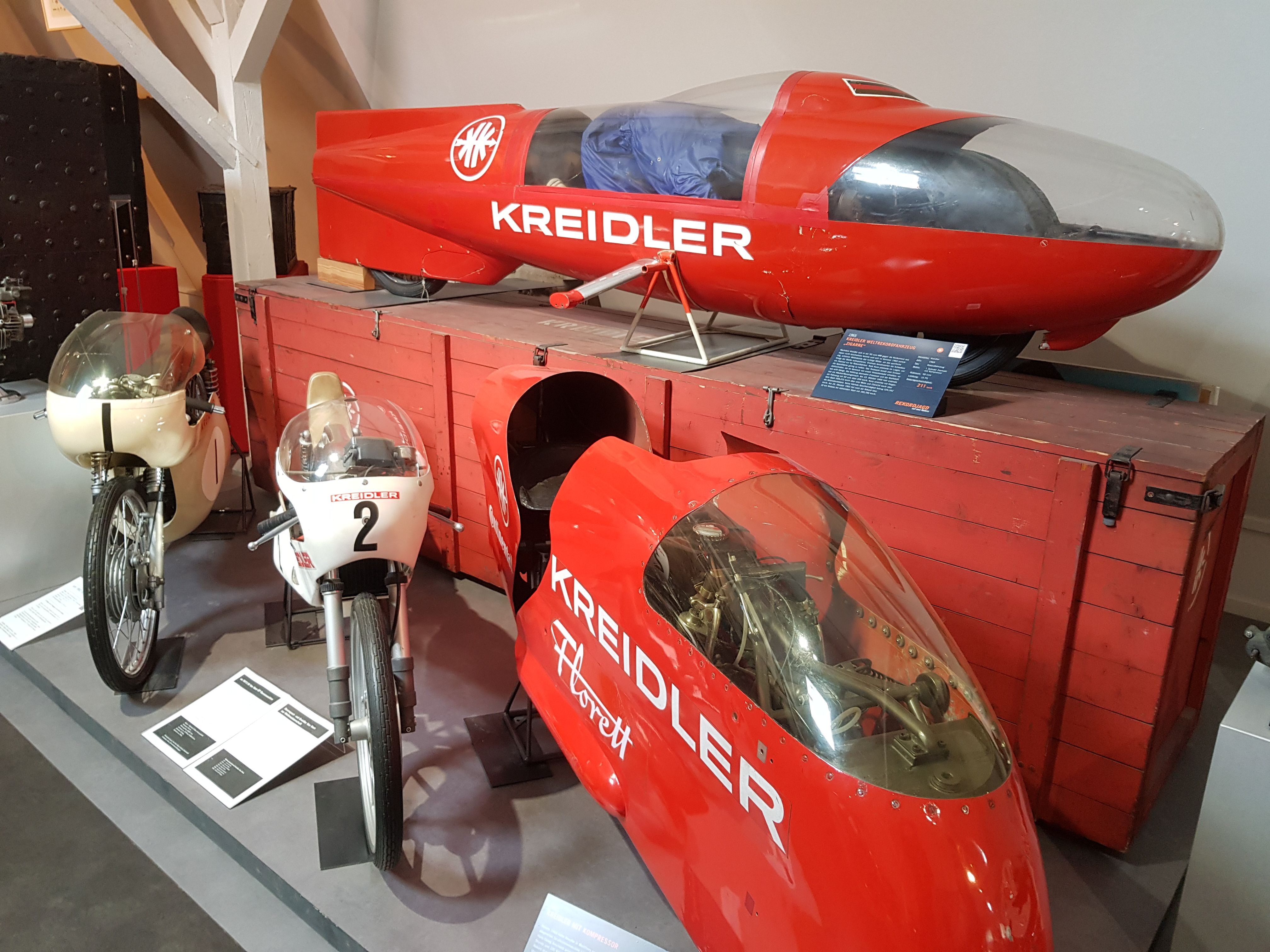 Auch wenn Peter den Motor in diesen beiden Fahrzeugen für den wichtigsten NSU-Motor hält (und es sei ihm gegönnt), ich finde……dieses Exponat interessanter: Der 4-Zylinder-Motorrad-Rennmotor nach dem Gilera-Vorbild. Den soll ein gewisser Soichiro Honda bei seinem Werksbesuch sehr aufmerksam studiert haben……das Layout hat durchaus viel Ähnlichkeit zu der von ihm entwickelten Version, die auch ausgestellt wird.Ebenfalls sehr beeindruckend: 500-ccm-Kompressor-Rennmaschine von 1938 mit V-förmig angeordneten Königswellen. Wunderschön! Für damalige Verhältnisse sagenhafte 85 PS und 240 Sachen Spitze. Die Jungs waren mutig…Mit 339 km/h mit der Delphin III auf dem Salzsee von Bonneville: Weltrekord.Das Museum ist im Besitz der Kreidler-Werks-Sammlung und zeigt auch deren Rekord-Fahrzeuge.