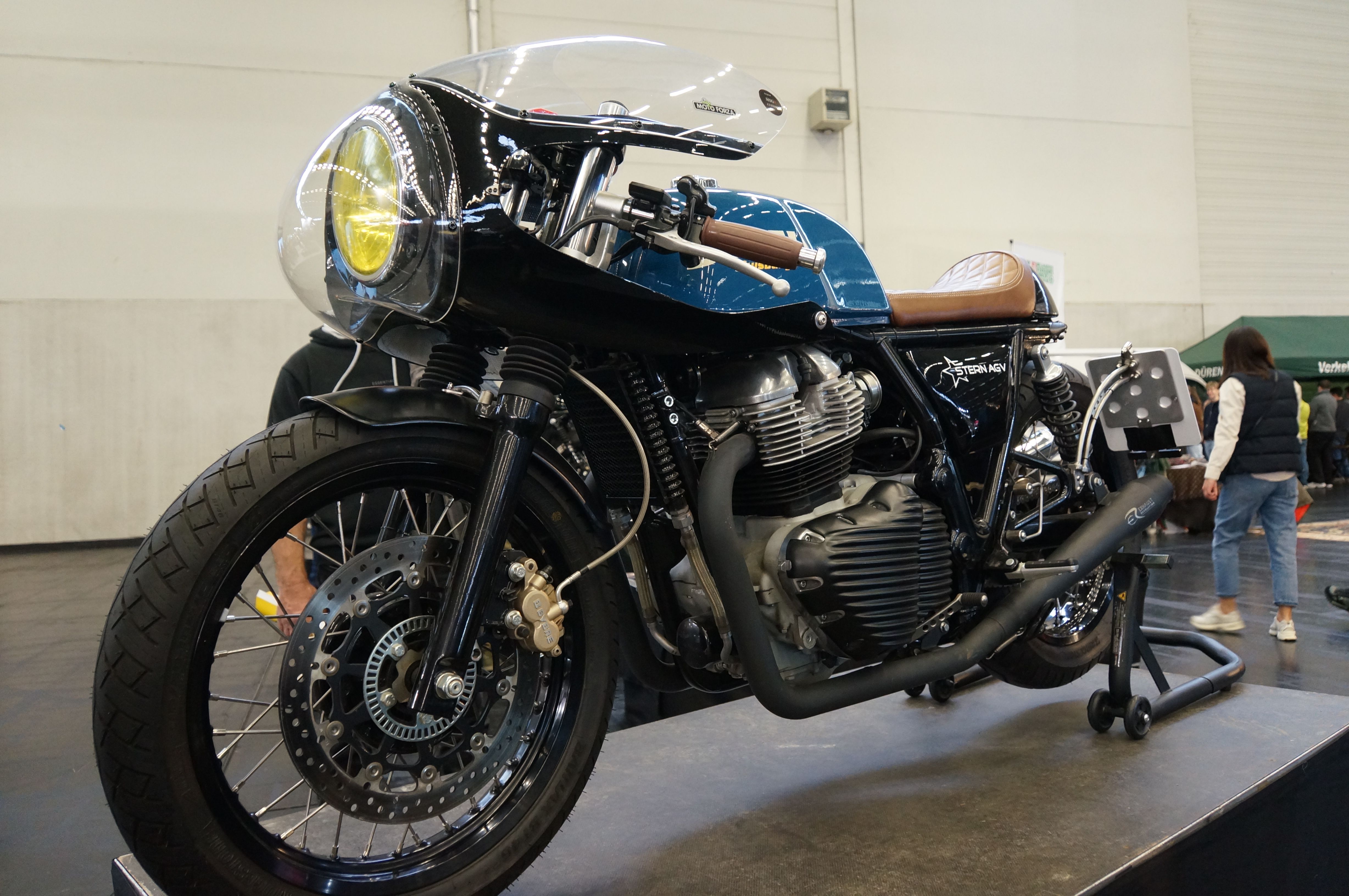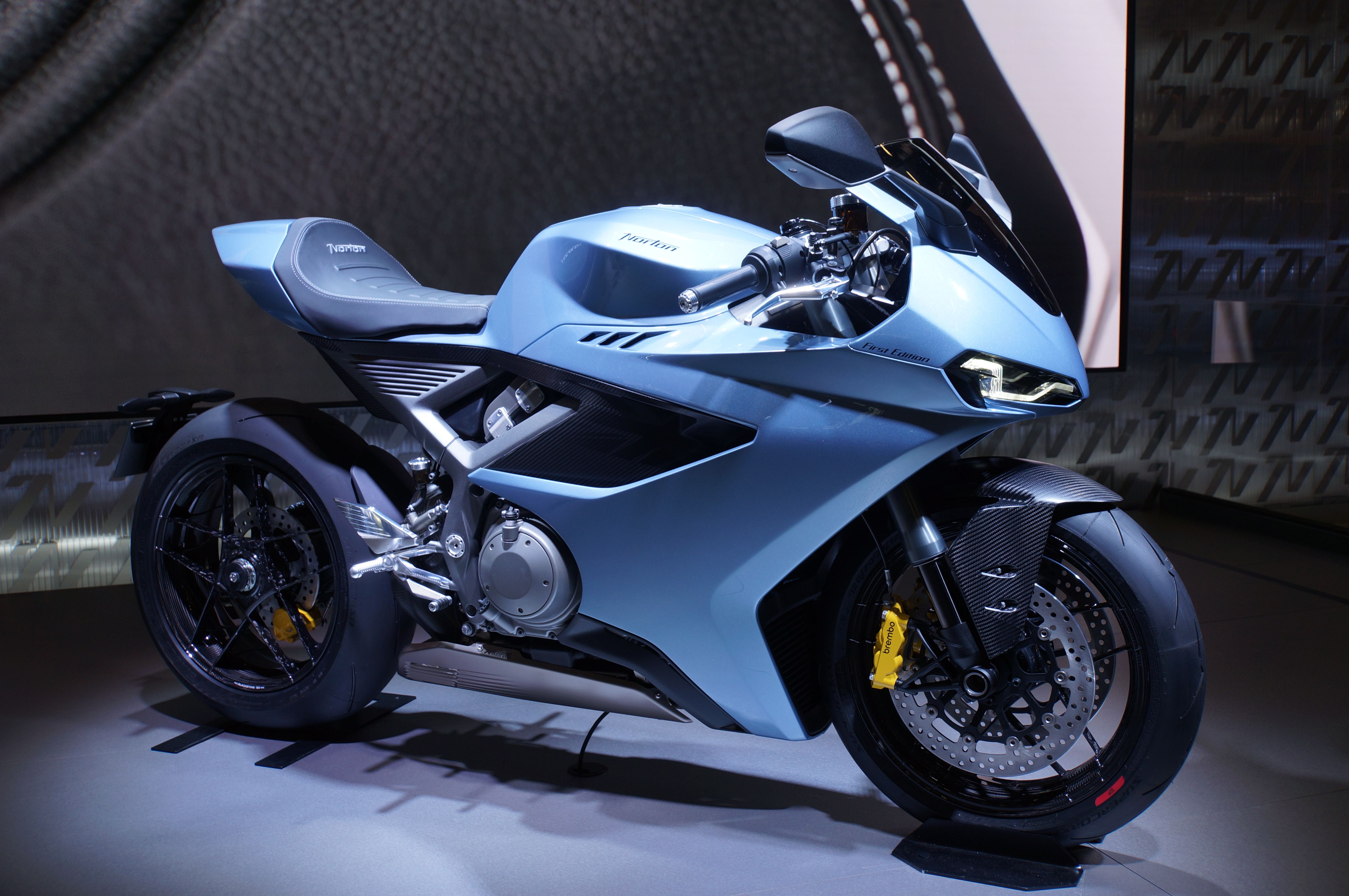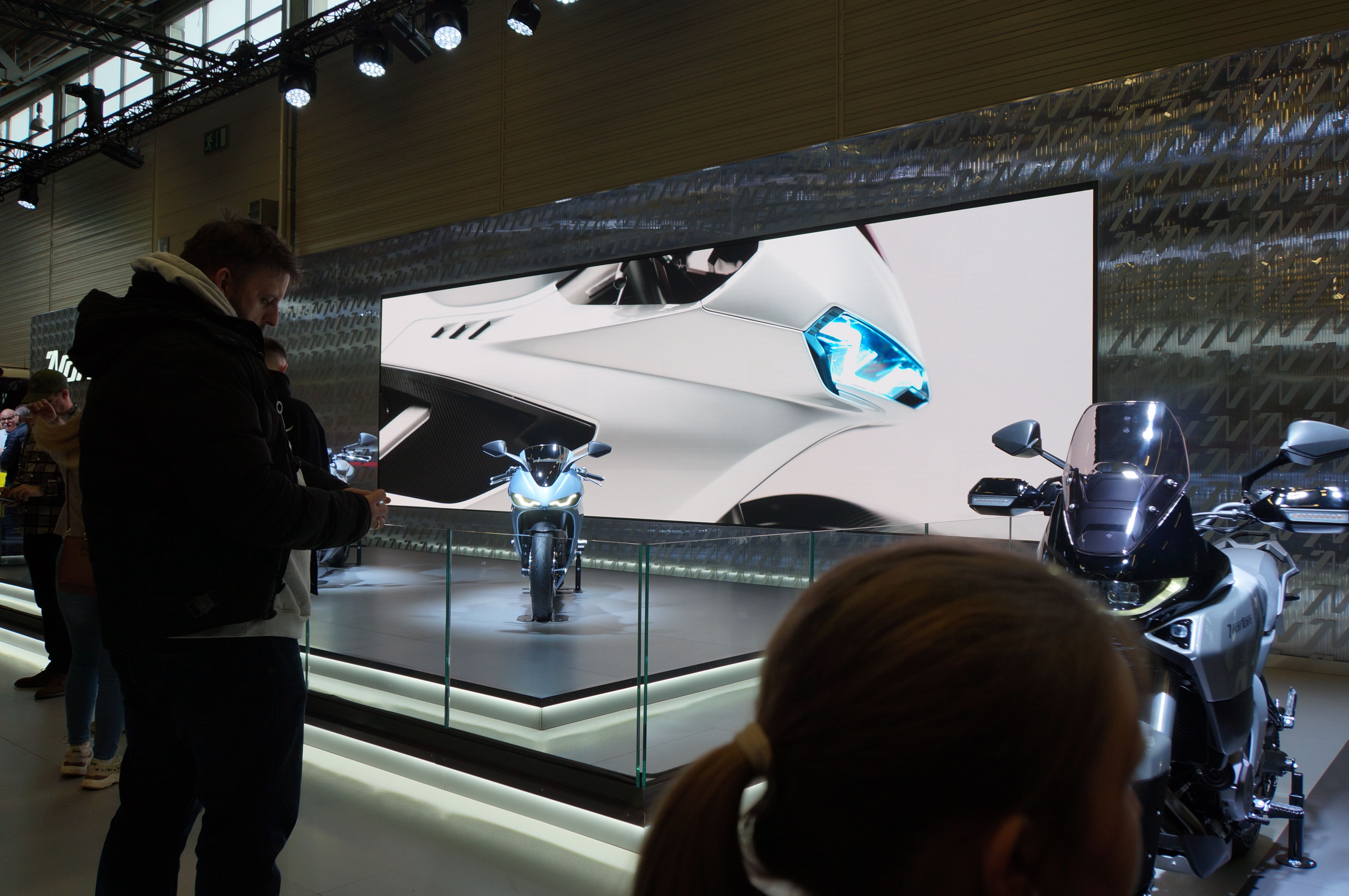 Schon über dem Haupteingang zu Messe wurde auf einem riesigen Bildschirm permanent Werbung für die neuen Norton-Modelle gezeigt. In den Hallen hat dann der Norton-Stand alles andere ganz klar in den Schatten gestellt. Größe, Design, Licht, alles hat sich deutlich abgehoben, war komplett durchgestylt. Selbst die Barbie-Models am Stand passten dazu, was mich eher abgeschreckt hat, weil es wirklich die billigsten alten Klischees angesprochen hat.