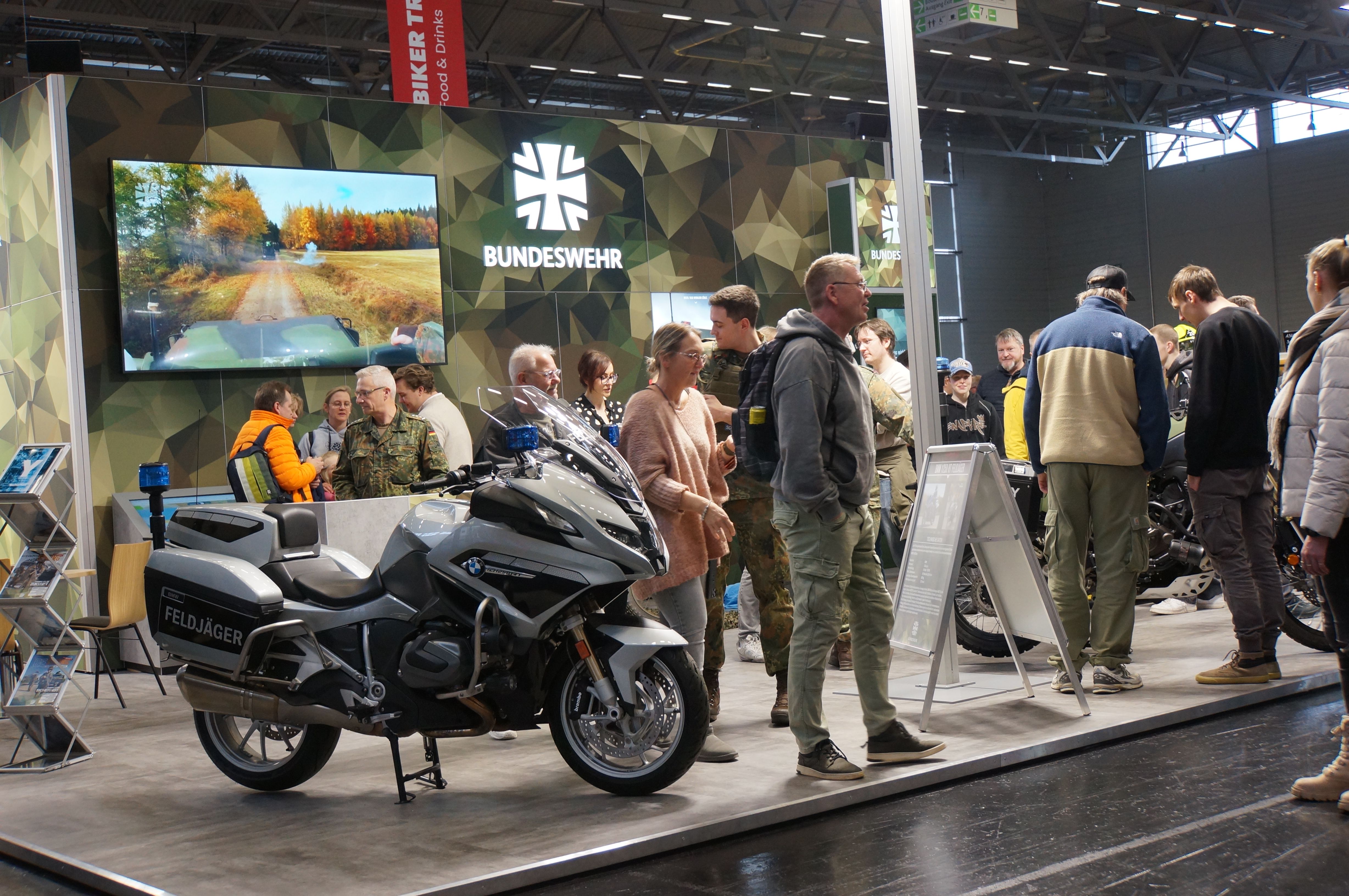 Schade, DHM und FOUR-Club hatten keinen Stand. Und die Clubs der britischen Alteisen tauchen auch kaum noch auf. Dafür hat die Bundeswehr hat das Thema Motorrad (Feldjäger) genutzt, um hier Personal zu werben. Allerdings mit einem deutlich kleineren Stand, als im Vorjahr, wie Guido berichtete. Ob das mit der Verabschiedung des neuen Wehrdienstgesetzes just an diesem Tag zu tun hatte? Schließlich wird damit an der Freiwilligkeit gesägt. Dass direkt daneben ein Stand von ‚Kuhle Wampe‘ war, ließ mich schmunzeln. Denn dort wurde nicht nur deutlich gegen rechtsradikale Tendenzen Stellung bezogen, sondern auch Material der DFG-VK ausgelegt.