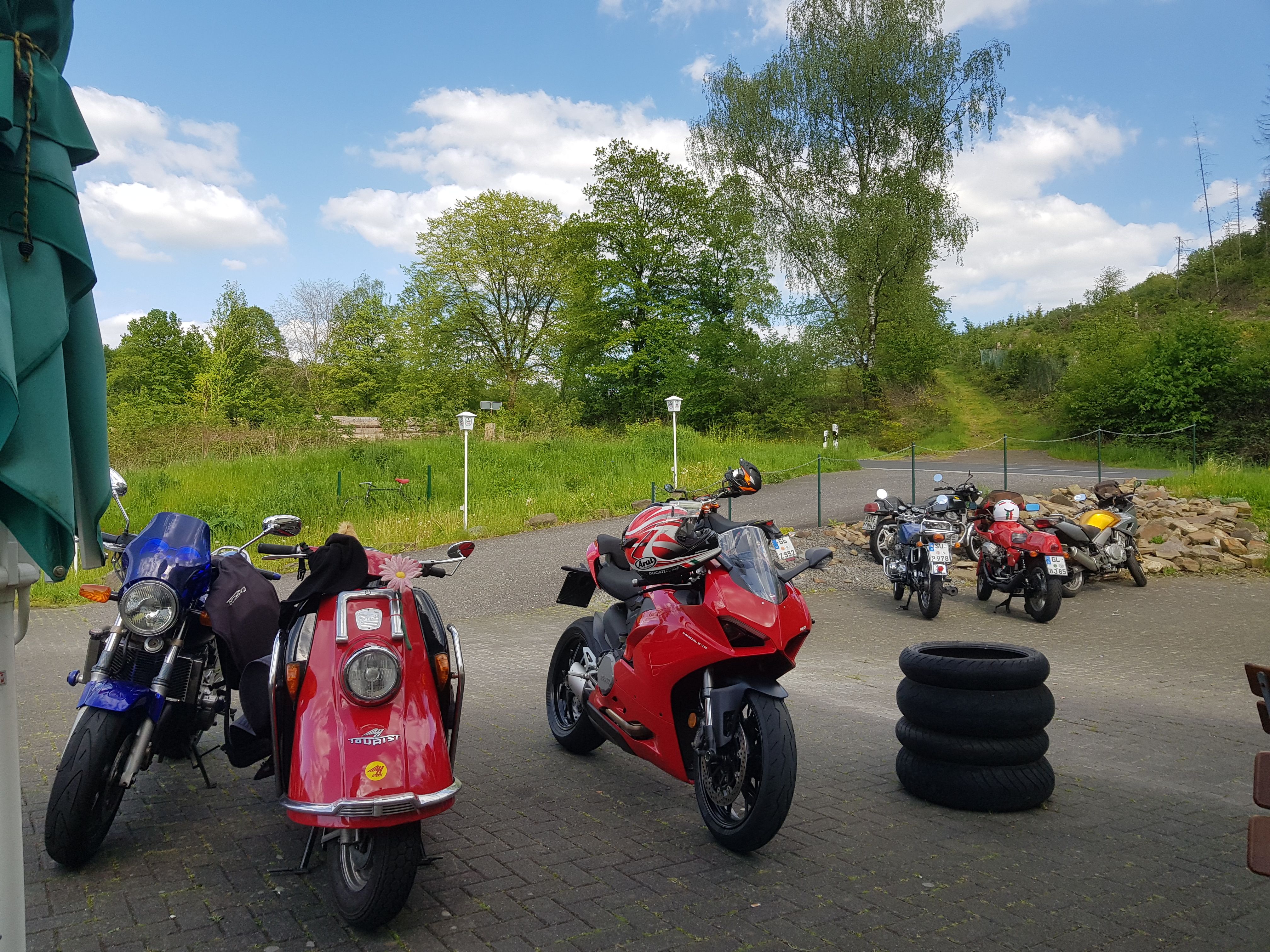 Die Honda springt nach der Winter-Standzeit eigentlich stets an. Diesmal ziert sie sich aber. Alter Sprit und alte Kerzen – das funkt nicht gut, lässt sich aber kurieren. Eine der ersten Ausfahrten führt dann auch an der alten Schule vorbei. Noch ist wenig los, aber eine Moto Guzzi Le Mans, eine Ducati SS 900 und ein Heinkel-Roller stehen zwischen den ganzen aktuellen Motorrädern.