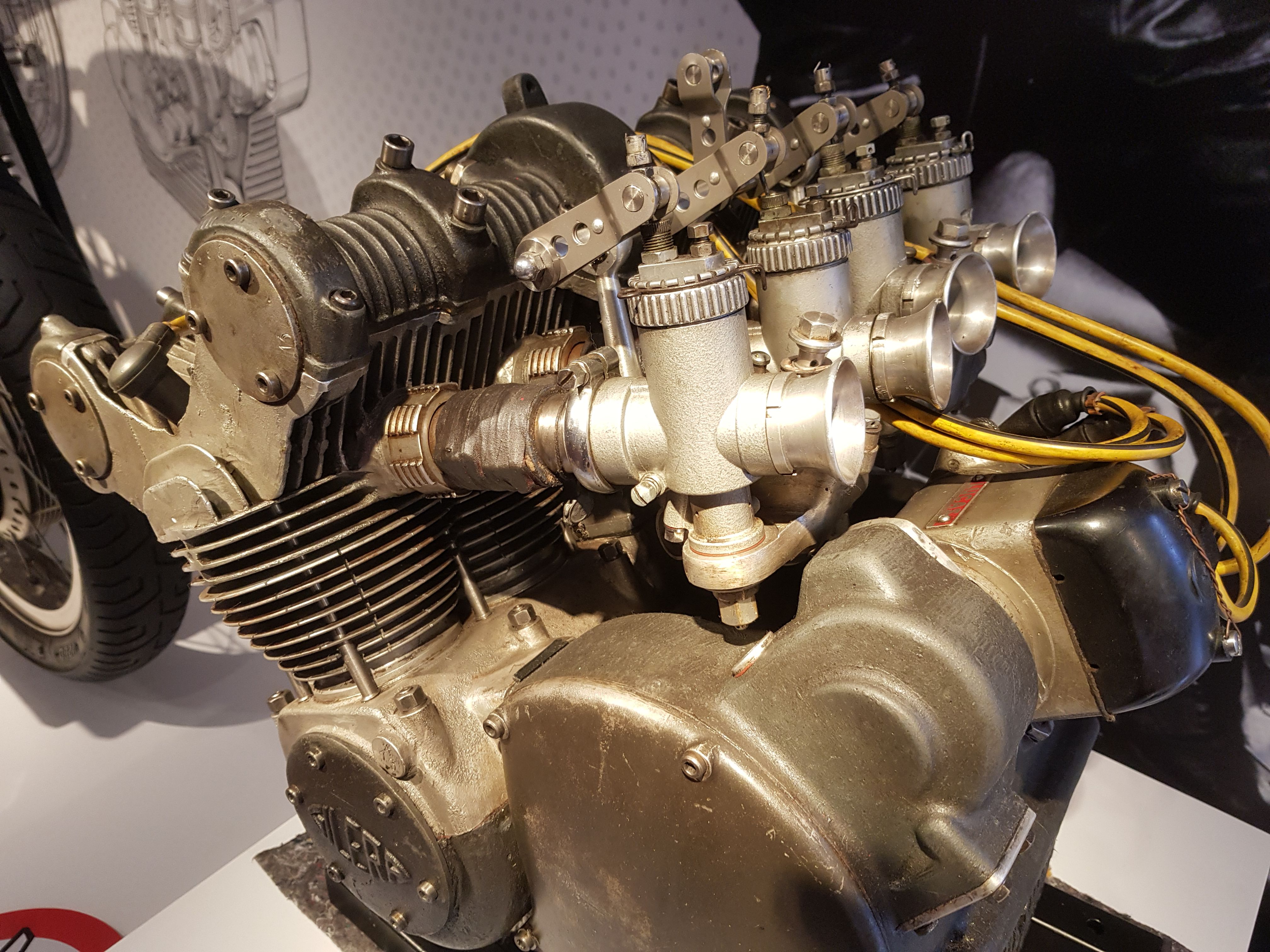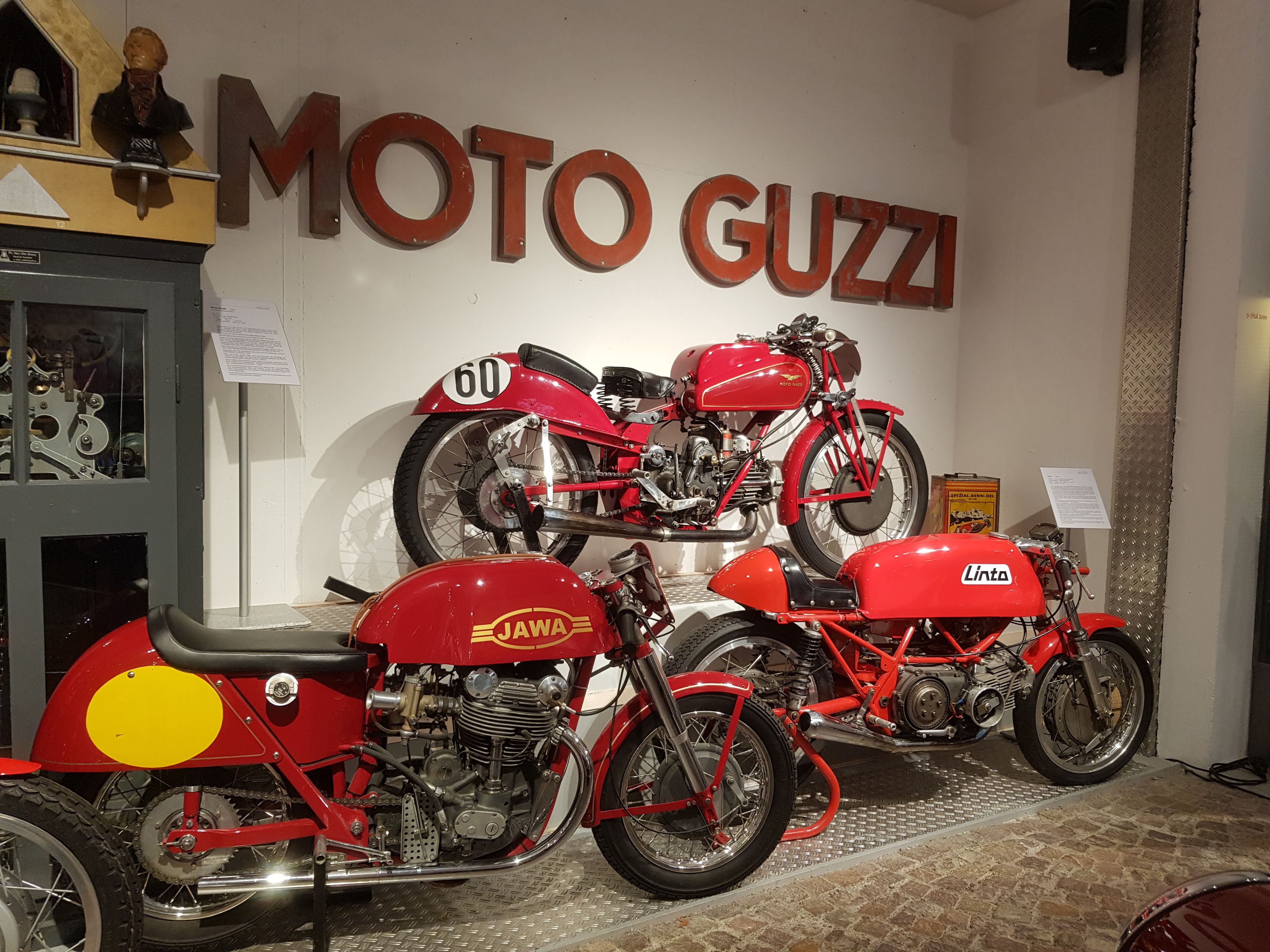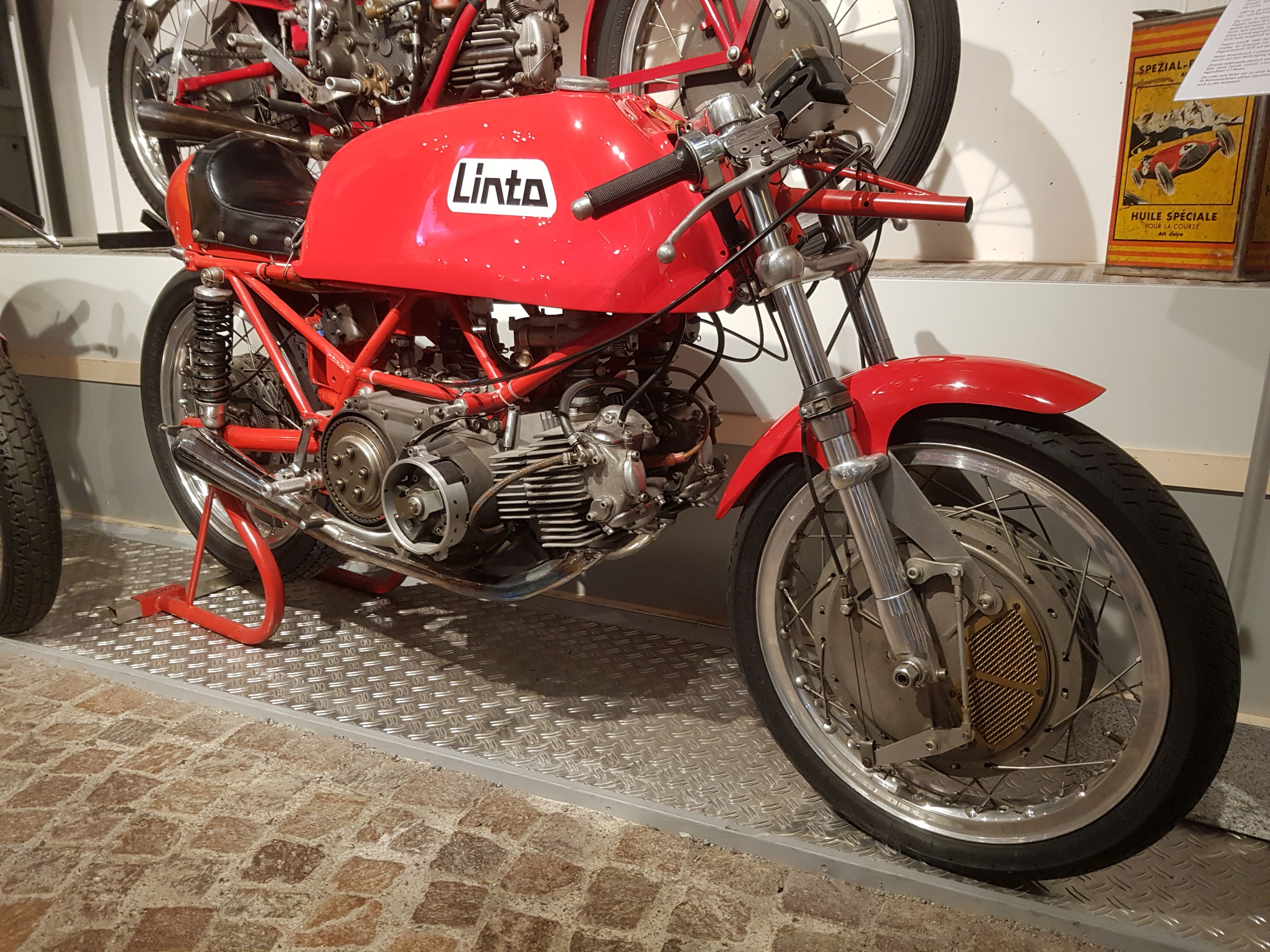Gleich zu Anfang zieht mich eine 500er Linto in ihren Bann. Konstruiert wurde sie von Lino Tonti, und nur in sehr geringen Stückzahlen gebaut. Es ist das erste Original das ich hier sehe, bislang kannte ich sie nur von Fotos. Tonti hat hier 1968 auf Basis zweier 250ccm-Aermacchi-Ala-d’Oro-Motoren einen waschechten Grand-Prix-Renner auf die Räder gestellt.