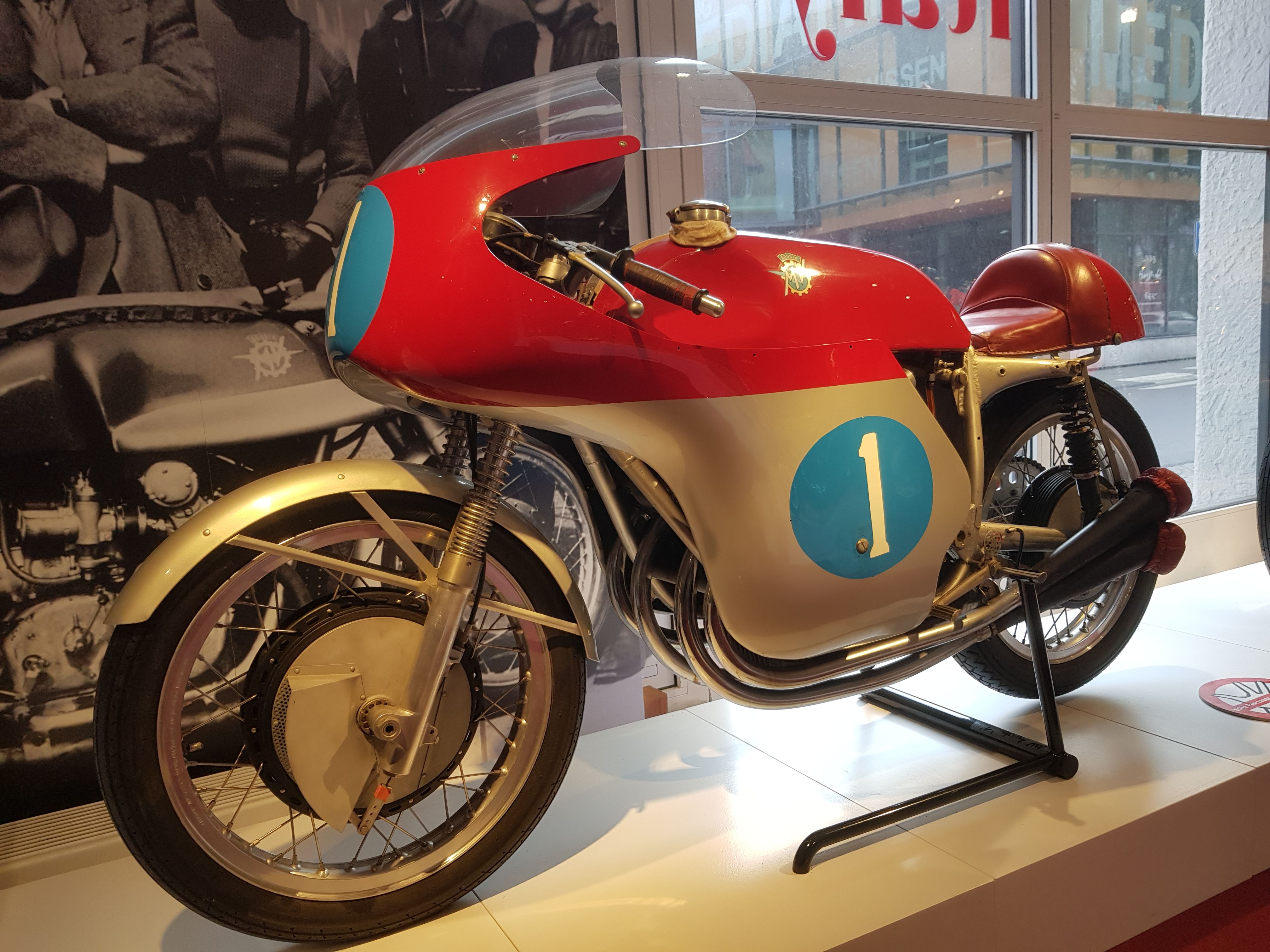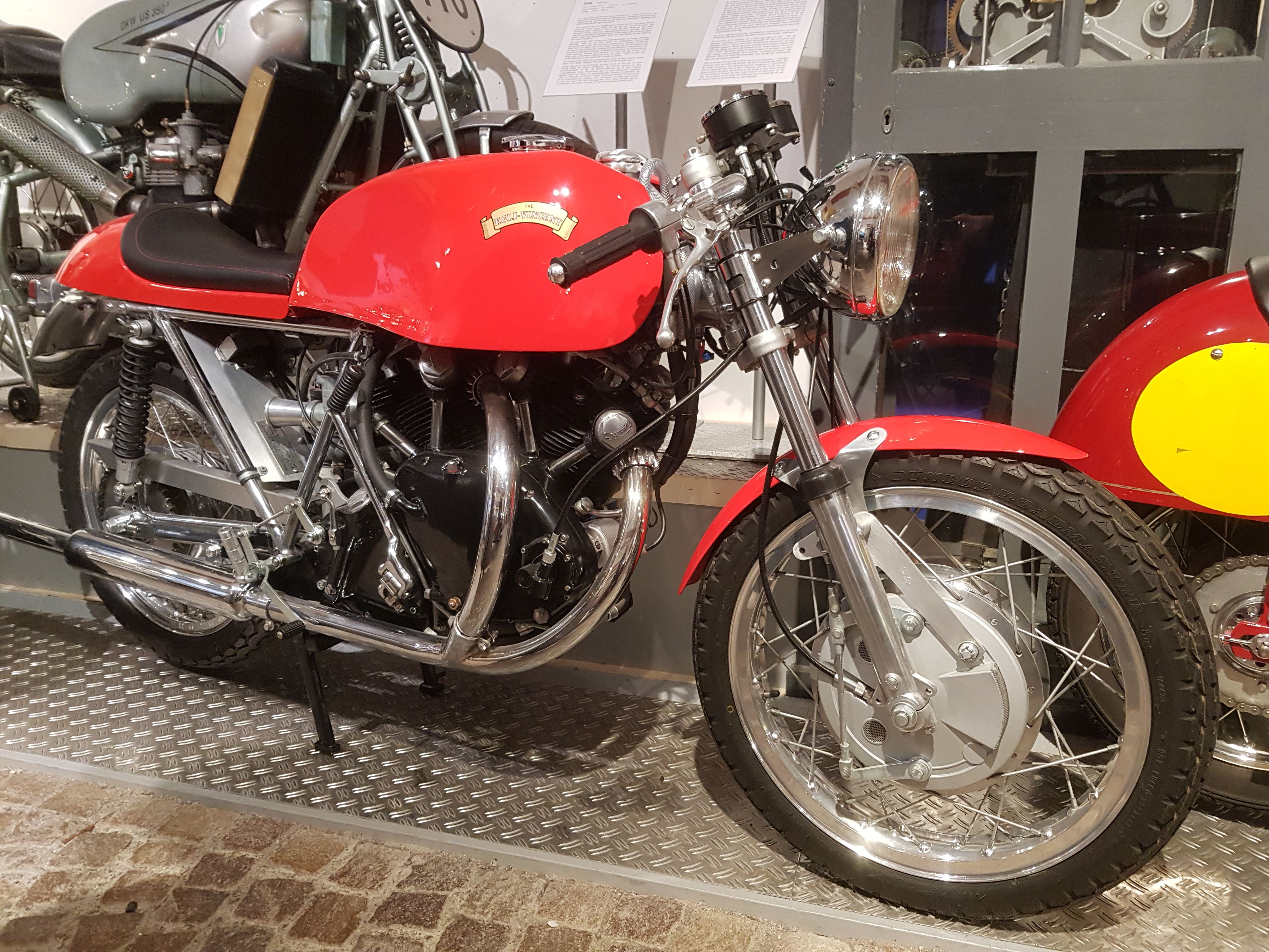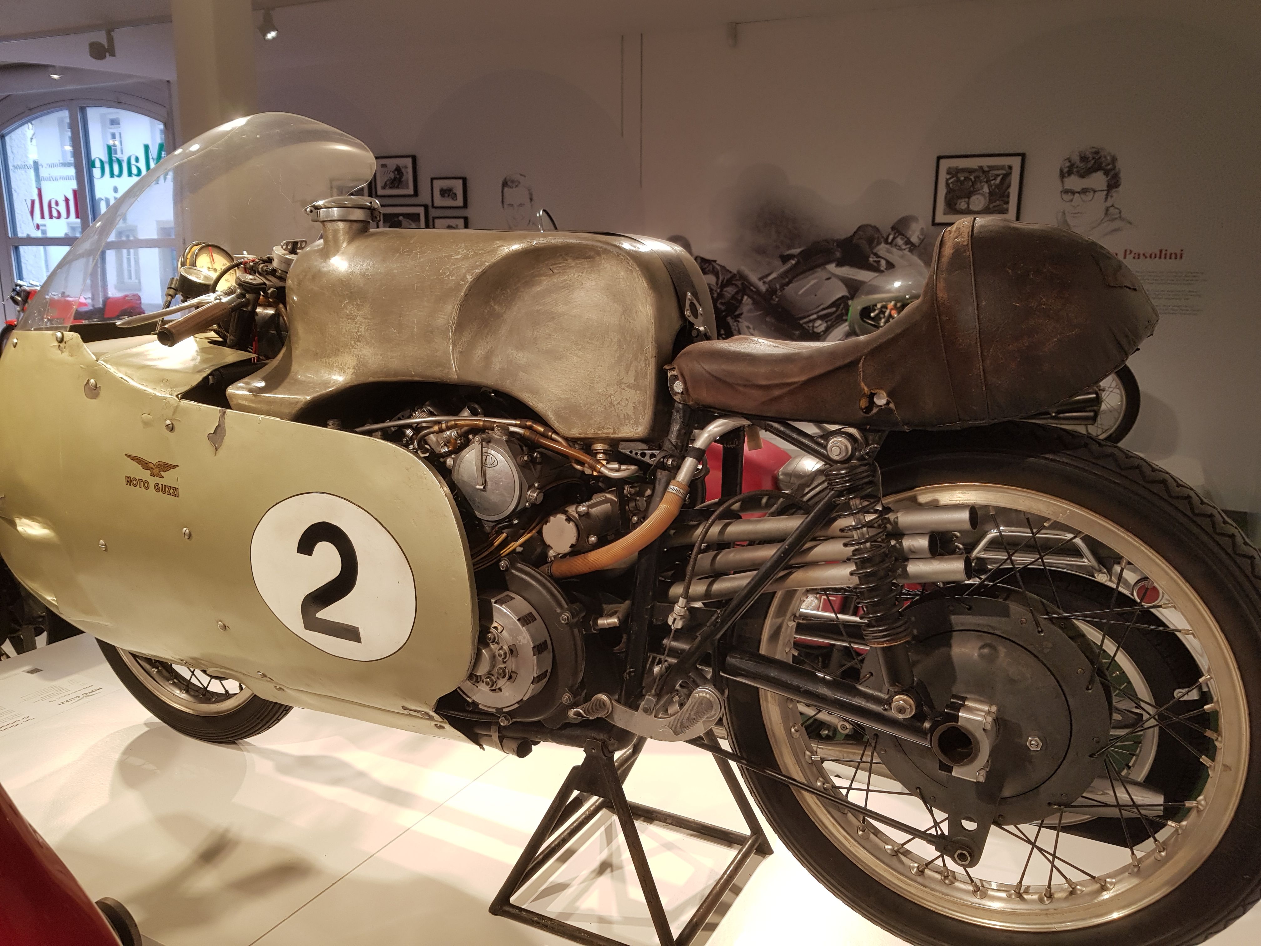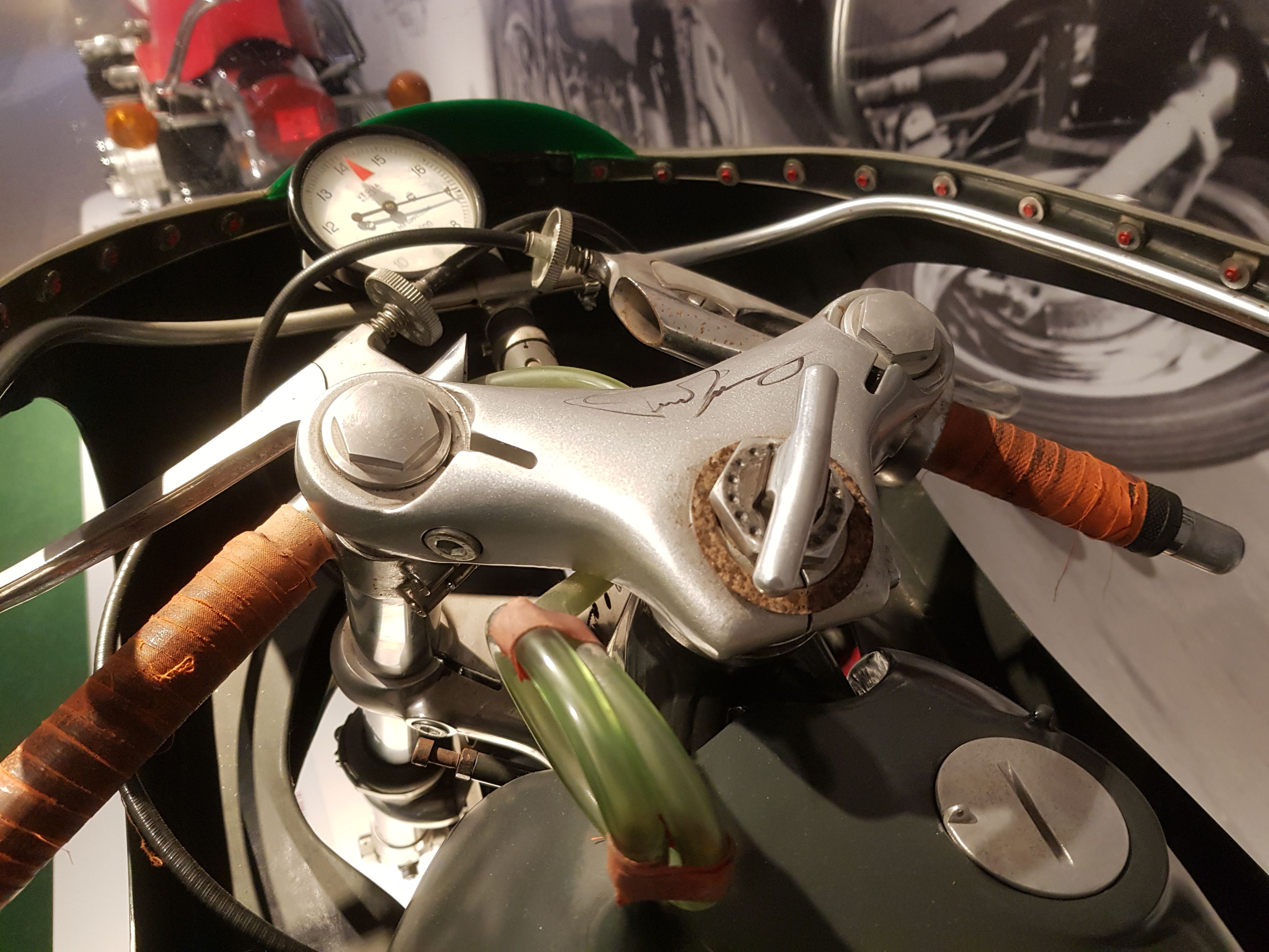 Gleich zu Anfang zieht mich eine 500er Linto in ihren Bann. Konstruiert wurde sie von Lino Tonti, und nur in sehr geringen Stückzahlen gebaut. Es ist das erste Original das ich hier sehe, bislang kannte ich sie nur von Fotos. Tonti hat hier 1968 auf Basis zweier 250ccm-Aermacchi-Ala-d’Oro-Motoren einen waschechten Grand-Prix-Renner auf die Räder gestellt.