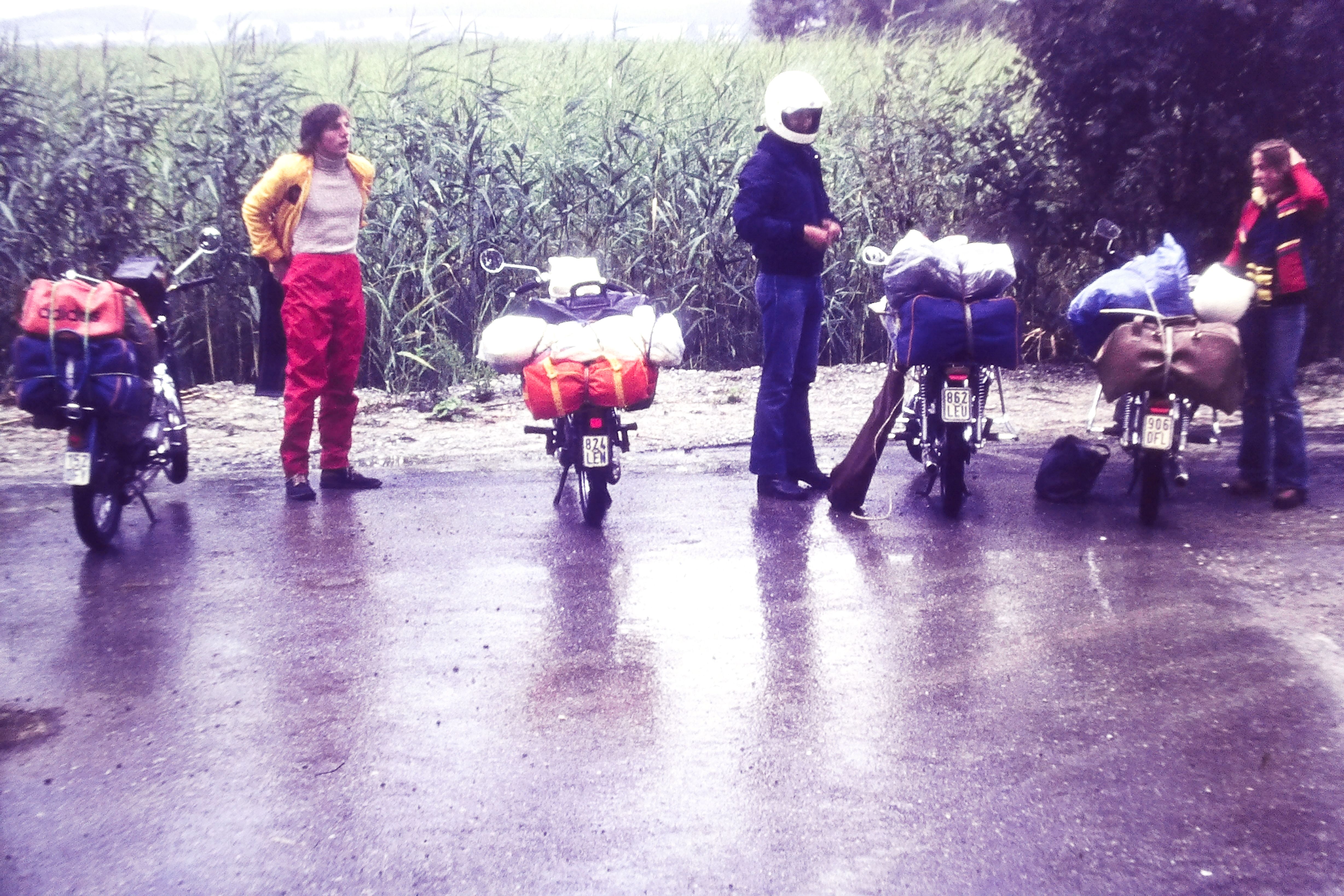 Irgendwann setzten dann aber doch ein paar Regenschauer ein. Die beiden Mitreisenden waren wie wir nur mit Jeans und leichtem Anorak unterwegs. Motorrad-Klamotten und Regenzeug waren finanziell noch unerreichbar. Nur Ingo hatte eine einfache Regenüberhose, die allerdings nicht viel genützt haben dürfte.