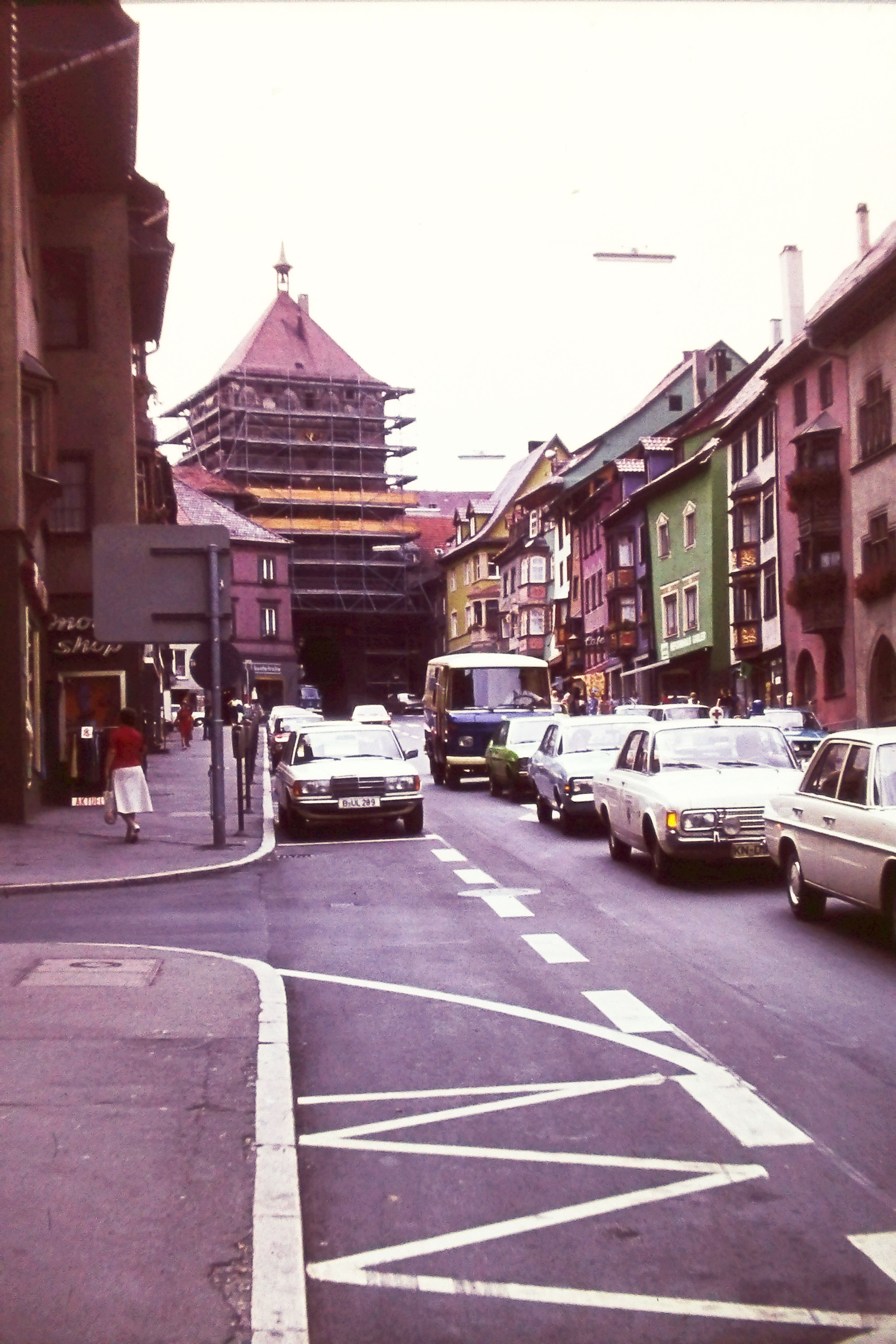 Wir nahmen von Tübingen die B27 über Rottweil und dann die B14 über Tuttlingen, um zügig an den Bodensee zu kommen. Wo heute Fußgängerzonen und oft mehrspurige Umgehungsstraßen die Innenstädte entlasten, rollte damals meist noch der gesamte Durchgangsverkehr durch die historischen Altstädte. Routenplanung machte man über entsprechende Straßenkarten, und wir wählten nach Möglichkeit die Hauptverkehrsadern, um zügig voranzukommen. Eine Woche mit zwei voll beladenen Mokicks, die offiziell nur vierzig Stundenkilometer schnell sein durften, war nicht viel Zeit.
