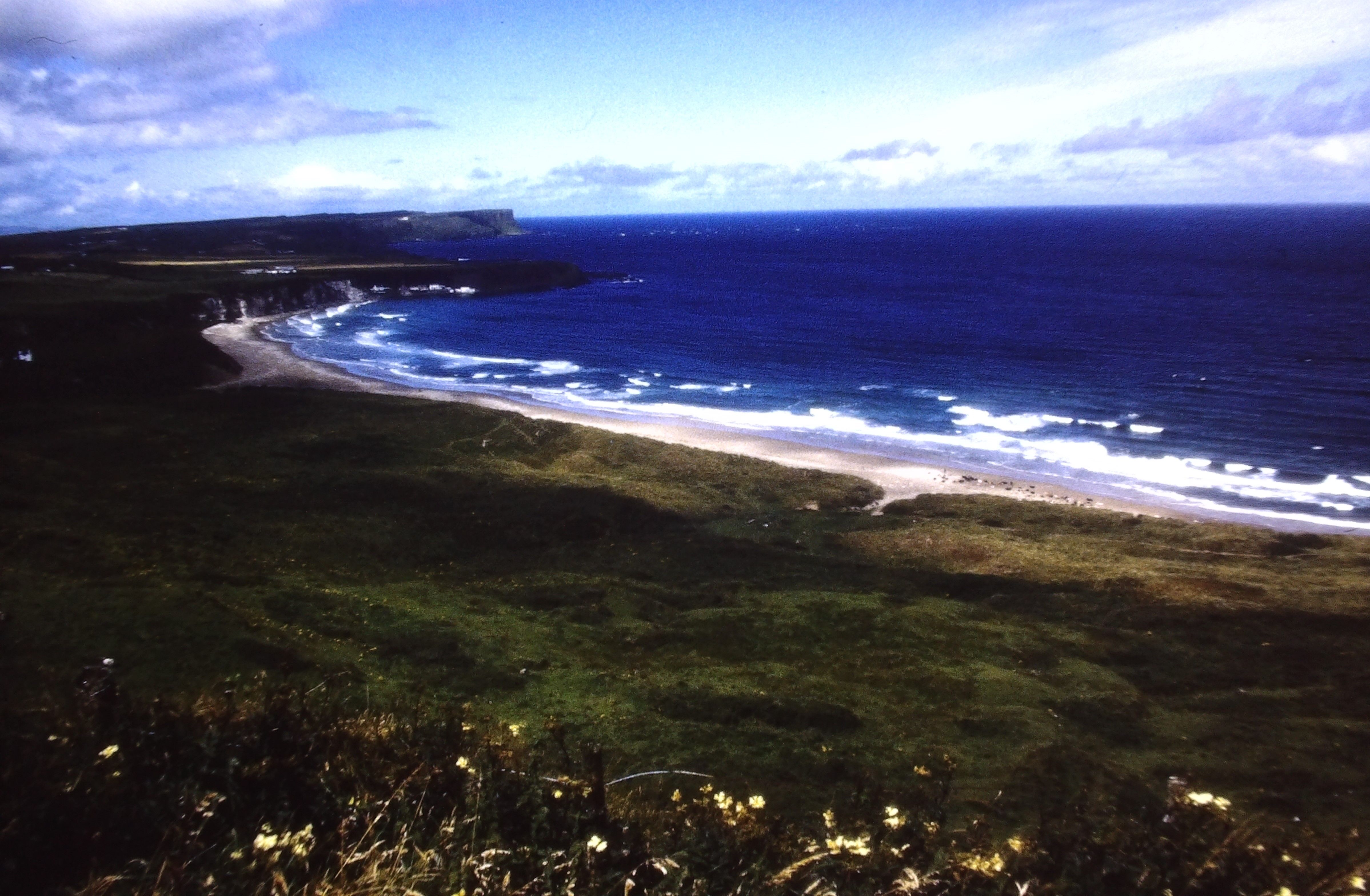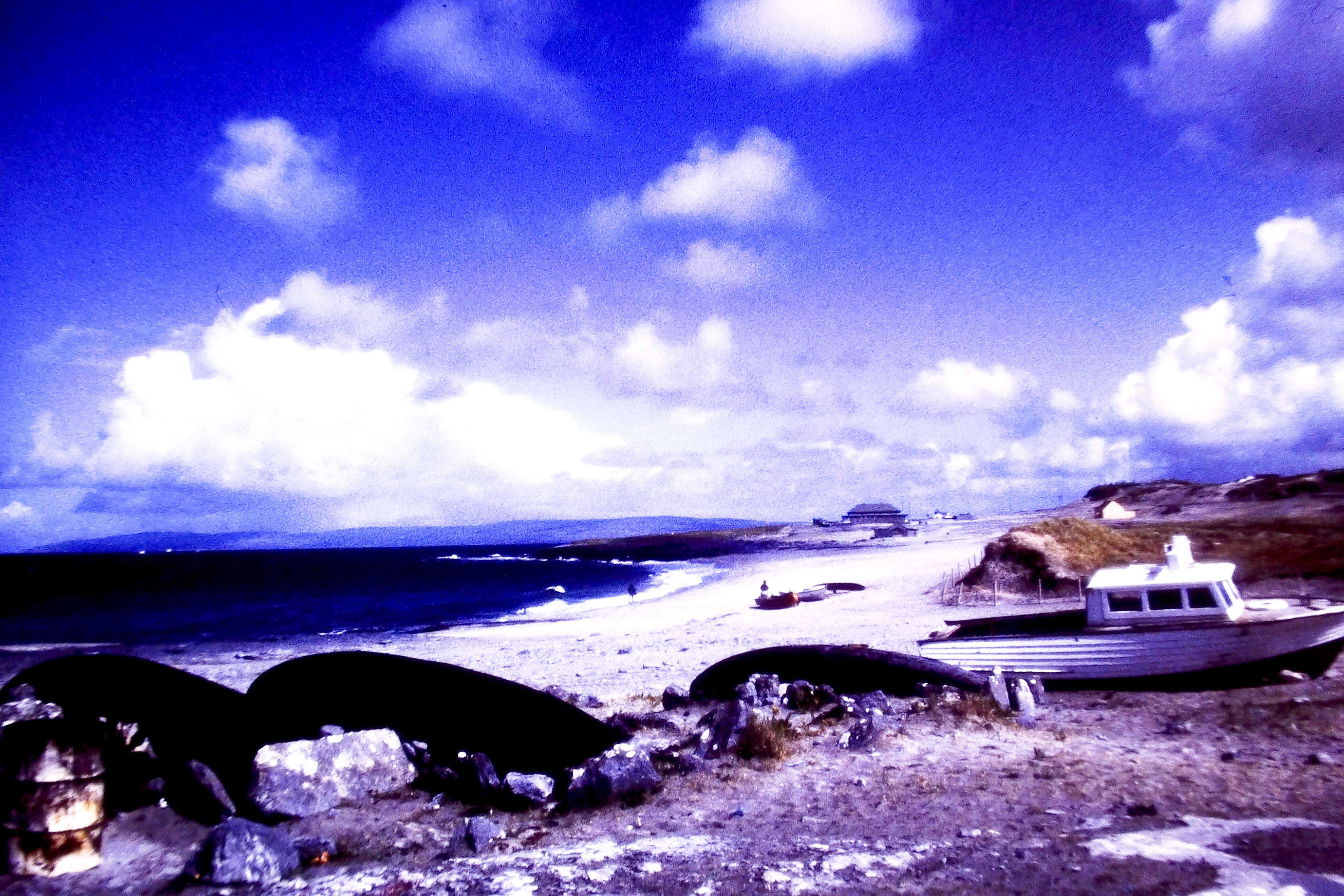 In Whitegate legten wir ein paar Ruhetage ein, unternahmen aber einen Tagesausflug zu den Aran-Islands. Schließlich gab es inzwischen eine Fähre von Doolin, nahe den Cliffs of Moher. Auch dies sollte ein unvergessliches Erlebnis werden, denn wegen Sturm waren zwei Tage keine Fähren gefahren. So stand am Pier eine einsame 650er Yamaha mit deutschem Kennzeichen. Das zugehörige Pärchen hatte notgedrungen auf der Insel übernachten müssen. Und alleine die Überfahrt mit dem Hochseekutter durch wahre Wellenberge war ein Erlebnis. Die Brecher gingen einfach über das Boot hinweg, ich war samt Lederkombi klatschnass. Aber der stürmische Wind blies alles in kürzester Zeit wieder trocken.