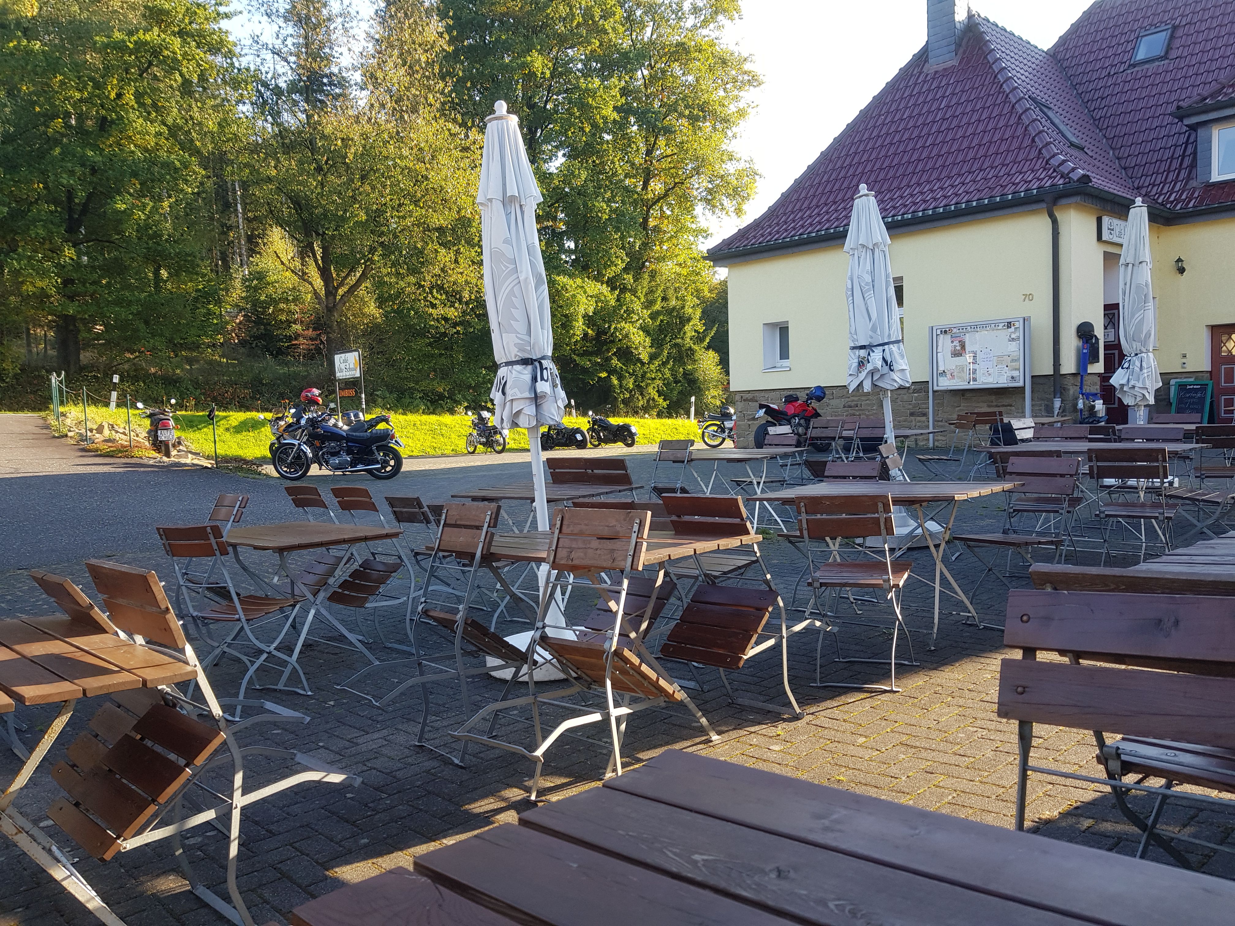 Wir sind nach unserer Kaffee-Pause gerade im Aufbruch, als eine BMW neben mir hält. Dank Helm und verspiegelter Sonnenbrille dauert es einen Moment, bis ich Rolf erkenne. Bevor ich die Honda zurück in die heimische Garage fahre, trinke ich noch etwas mit ihm. Aber bald schon wird es kühl, der Wirt macht den Laden dicht. Nur ein paar wenige Besucher sitzen noch an den Tischen.