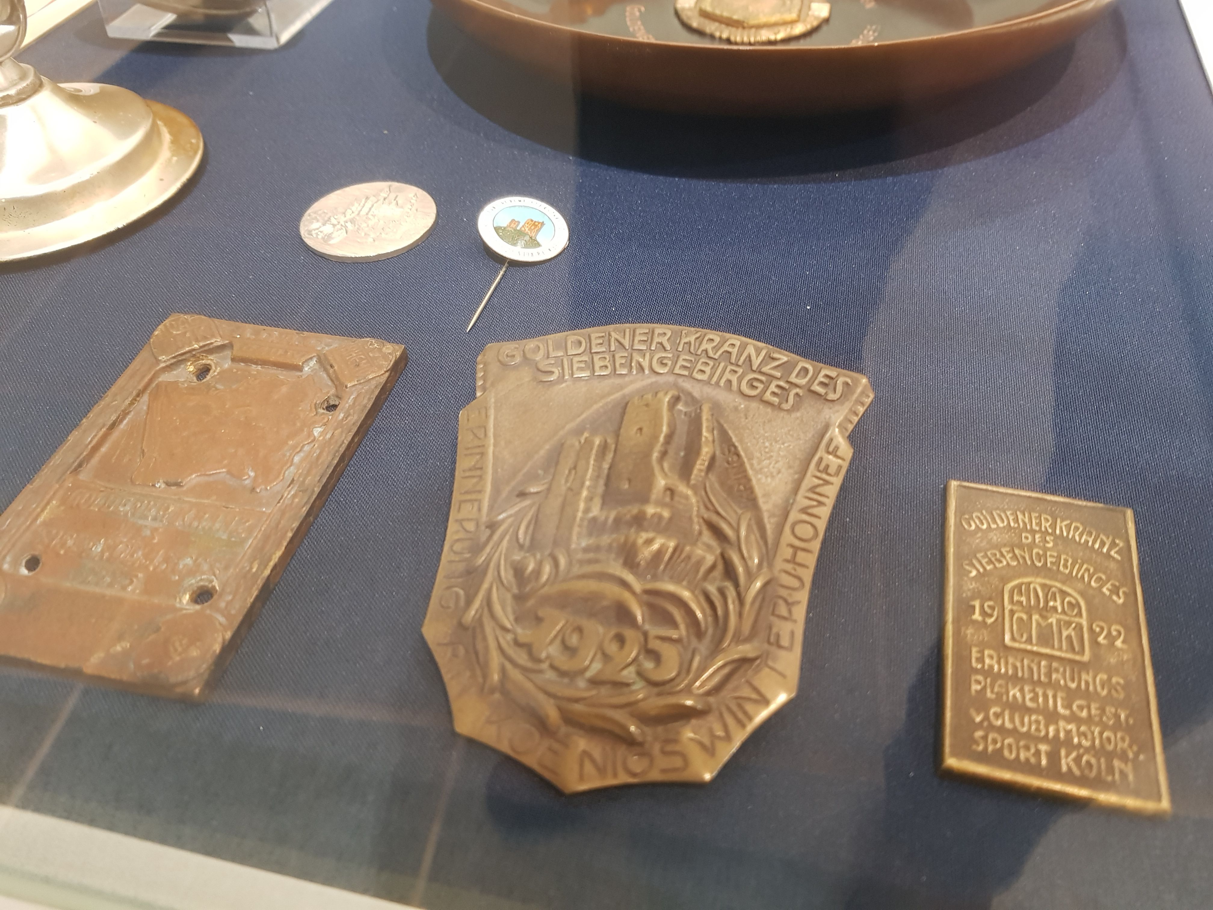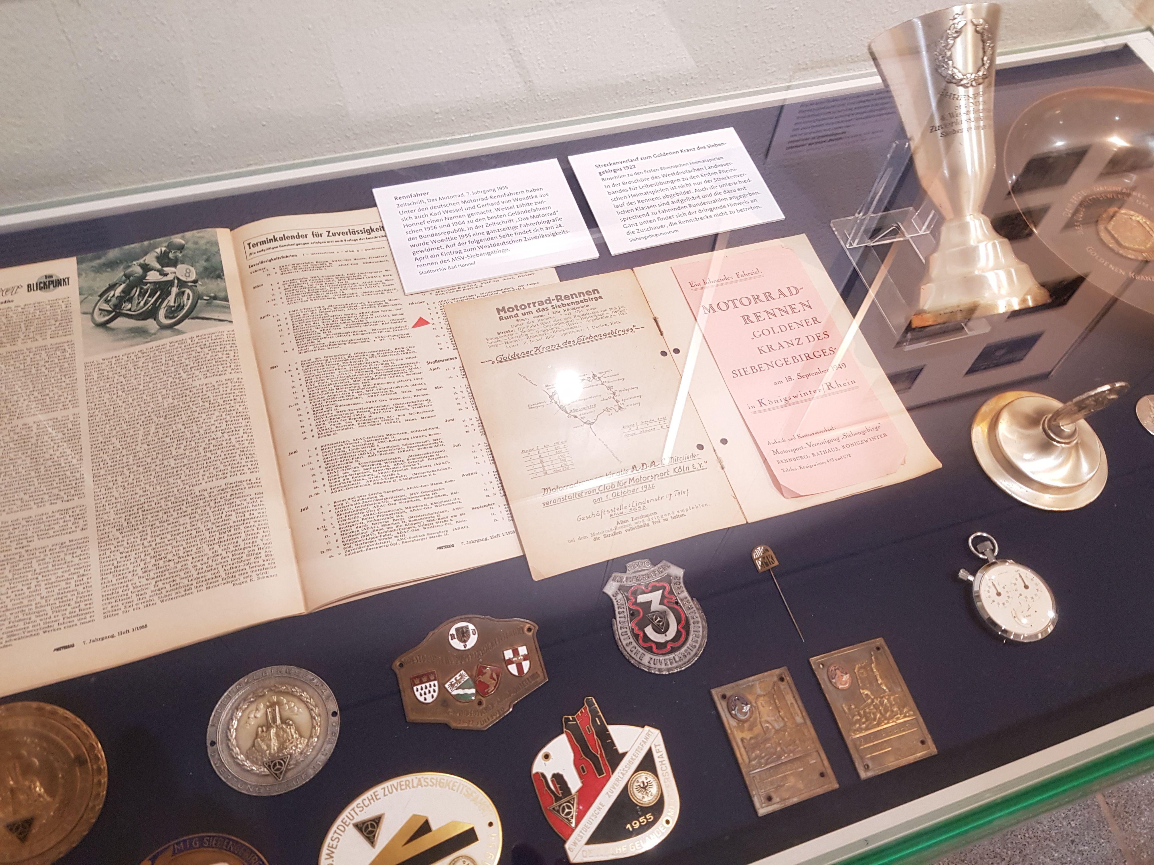 Eine der Annehmlichkeiten des Rentner-Daseins ist, dass man sich an einem verregneten Wochentags-Vormittag nach dem Frühstück einfach mal ins Auto setzen und in ein Museum fahren kann. Das Königswinter ist nicht weit, und das örtliche Siebengebirgsmuseum lockte mit der Ausstellung „Rasant durchs Siebengebirge“, die einen bunten Mix zum Thema Mobilität von 1870 bis 1970 zeigte. Interessant, aber leider war natürlich das Thema Motorrad eher knapp bemessen. Tatsächlich gab es bis in die 50er Jahre Motorradrennen im Siebengebirge. Am interessantesten waren eigentlich die beiden Filmdokumente, die man an einem Bildschirm starten konnte. In den 50ern ging es mit kaum modifizierten Serien-Maschinen an den Start, und ein erheblicher Teil der ‚Rennstrecke‘ ging über kaum befestigte Feld- und Waldwege. Insbesondere bei Regen war das schnell eine glitschige Schlammschlacht, die die Fahrer ziemlich forderte.
