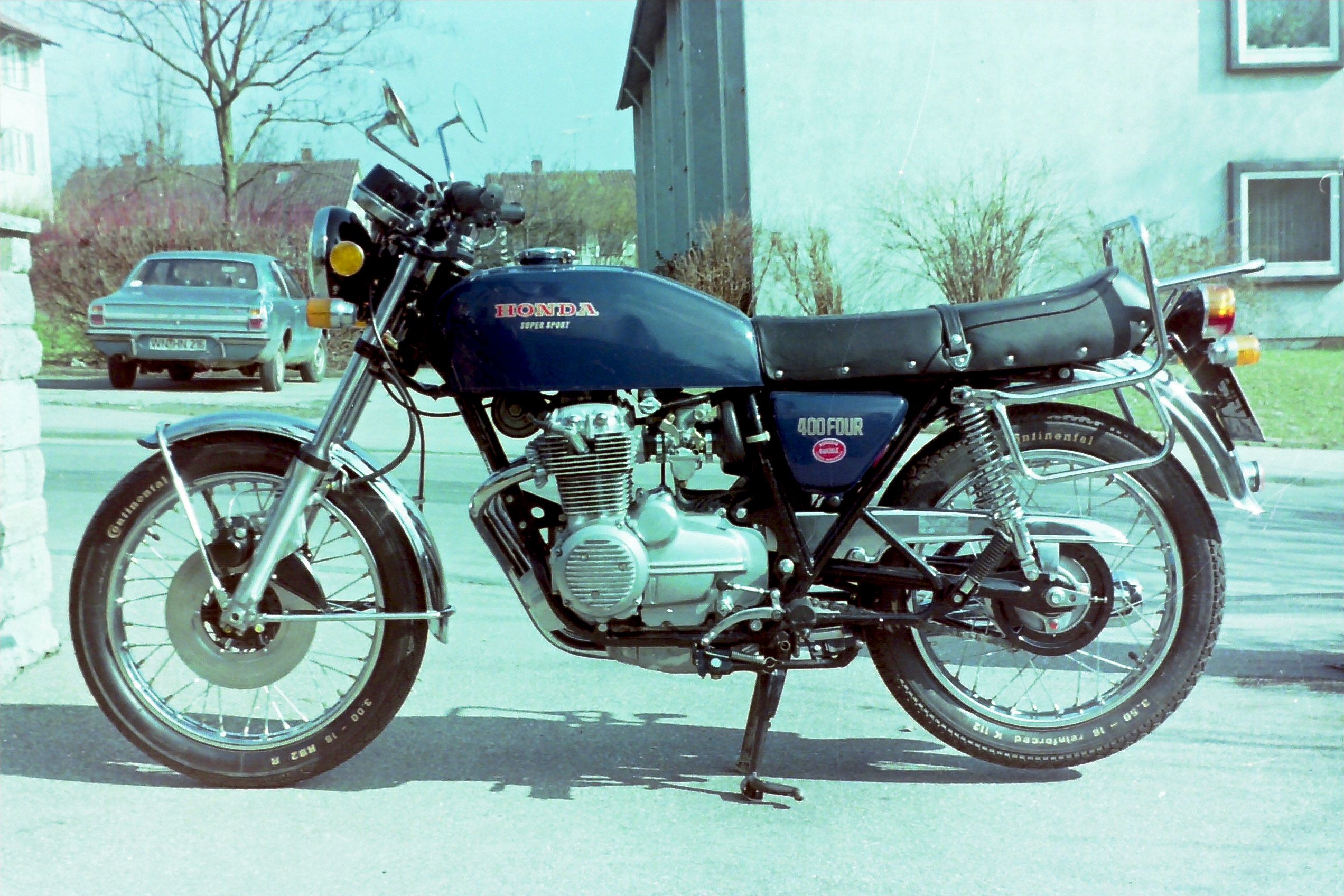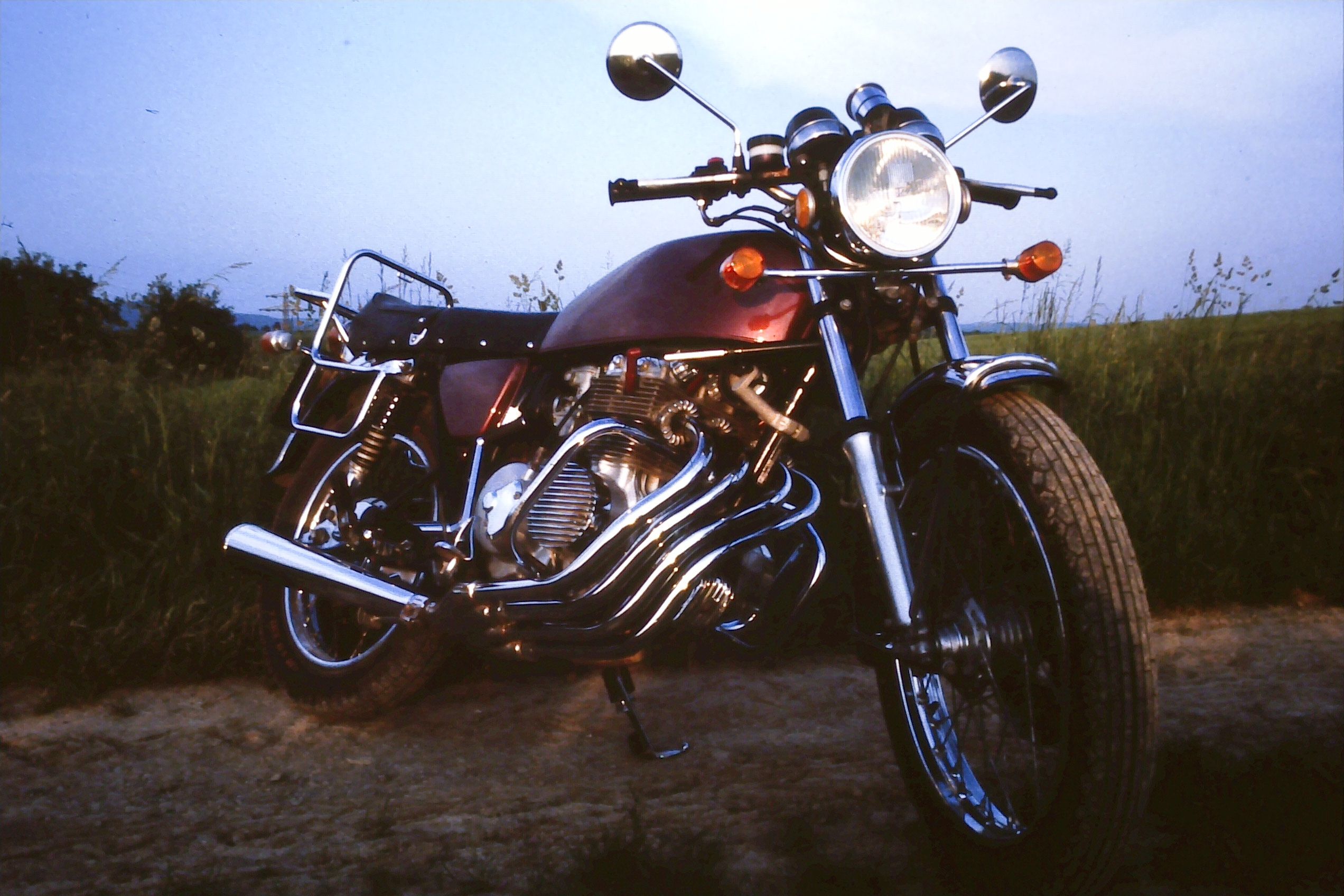 Andreas kann nicht mit, er ist ausbildungsbedingt verhindert. Seine Honda soll ich einige Tage später für ihn abholen. Ich stehe in der kleinen Werkstatt, in der der Mechaniker, ein Zwei-Meter-Mann, gerade seine Monkey abstellt. Ein kurioser Anblick, wie dieser Hüne sich auf der Monkey zusammenfaltet. Während ich warte, fällt mir ein riesiges schwarzes Plakat an der Werkstatttür auf. In großen goldenen Lettern steht da zu lesen: „Es gibt nur einen Ton! Norton!“ Als wollte sich Widerspruch erheben, höre ich in dem Moment schon von Weitem das Grollen eines großen Vierzylinders mit offenem Auspuff, der sich schnell nähert. Raichle sitzt im Ein-Mann-Höcker einer getunten CB 750 Four, lang über den Alu-Tank gestreckt, als er in die Einfahrt einbiegt. Ich habe gehörigen Respekt vor solchen Maschinen und kann mir nicht wirklich vorstellen, so was mal zu fahren. Doch das sollte nicht mein einziger Irrtum bleiben. Ziemlich geladen ist er, als er absteigt. Brummt etwas von einem Autofahrer, der meinte, ihn behindern zu müssen, dem er aber mit seinen stahlkappenbeschlagenen Stiefeln bei voller Fahrt im Überholvorgang gezeigt habe, „wo dr Bartl dr Moschd hold“. Ich schweige ehrfürchtig. Es tut schon weh, als ich ihm ein paar Minuten später die 4.000 Deutschen Mark in die Hand drücke. Der Ertrag aus der verkauften 125er, angespartes Taschengeld, Bargeschenke von den Omas zum Geburtstag und zu Weihnachten und vor allem sauer Selbstverdientes in jeglichen Ferien, die das Schuljahr so bot – zusammen hat’s gerade so gereicht. Aber da draußen in der Sonne steht eine nagelneue 400 Four, deren blauer Tank im Sonnenlicht mit der damals einmaligen verchromten Vier-in-Eins-Auspuffanlage um die Wette glänzt, da gibt es kein Zögern. Lebe Deine Träume! Die knapp vierzig Kilometer Heimweg schwebe ich auf Wolke sieben. Die ersten Kilometer noch etwas verunsichert durch das spürbar höhere Gewicht im Vergleich zur 125er, begeistert mich doch sofort die erstklassige Gasannahme und der seidenweiche Lauf des kleinen Vierzylinders, der mir damals doch ziemlich groß erschien. An jeder Ampel denke ich, der Motor wäre abgestorben, so ruhig und leise läuft er. Erst der Blick auf den Drehzahlmesser klärt mich über meine falsche Annahme auf.