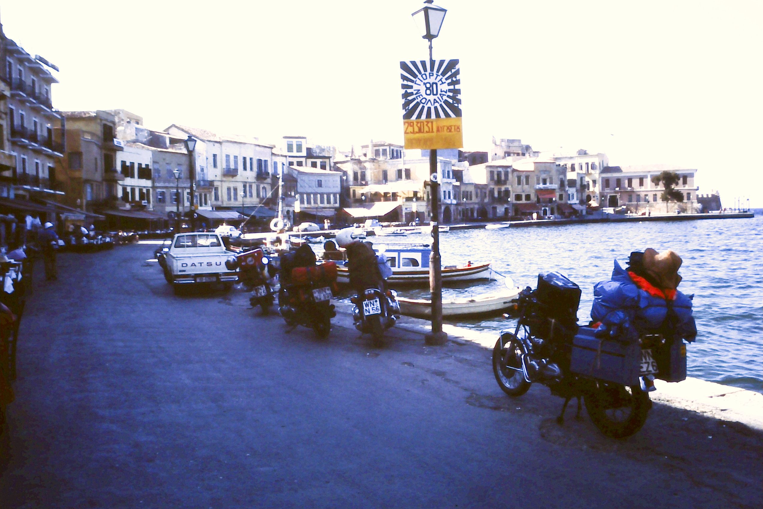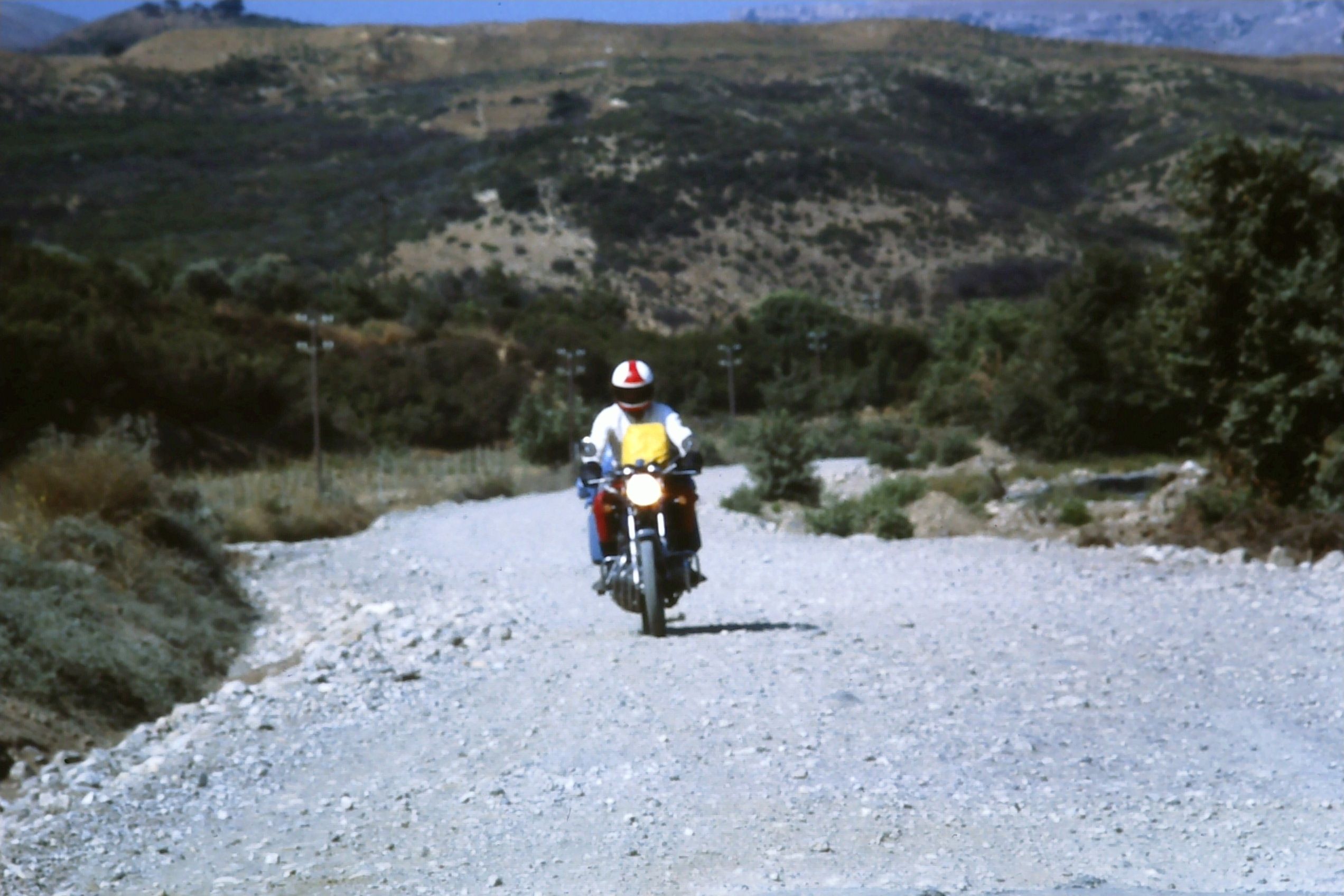 Von Patras geht es weiter nach Piräus, wo wir die Nachtfähre nach Kreta nehmen, die sich als furchtbarer Schüttelkahn erweist. Die Maschine versetzt das ganze Schiff in solche Vibrationen, dass an echten Schlaf kaum zu denken ist. Aber das Ganze erinnert uns sehr an Alexis Sorbas, was uns milde stimmt. Gerade als wir Kreta erreichen, entschädigt uns ein traumhafter Sonnenaufgang bei völliger Windstille für die schlaflose Nacht. Als wir an Land gehen, ist es noch so früh, dass nirgendwo ein Kaffee zu bekommen ist. Vier Wochen bereisen wir die Insel. Die Straßenverhältnisse sind unbeschreiblich. In den Bergen lauern hinter Kurven immer wieder kleine, sandige Wanderdünen, außerdem liegen auf den kleinen Bergstraßen oft überfahrene Schlangen.