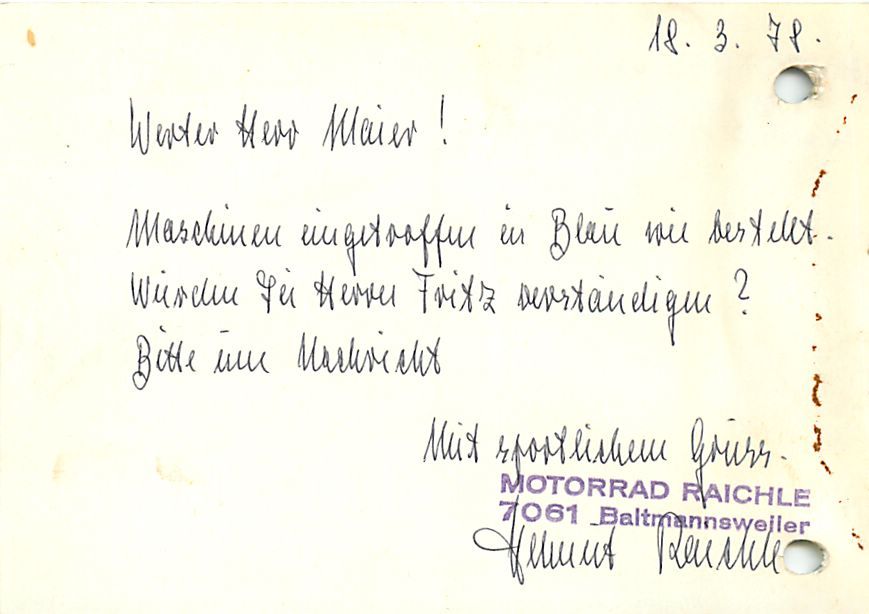 Endlich! Vor wenigen Tagen ist die Postkarte mit dem Stempel „Motorrad-Raichle“ eingetrudelt, deren kurze Mitteilung „Zwei 400 Four in blau eingetroffen.“ sofort fiebrige Erwartung auslöst.