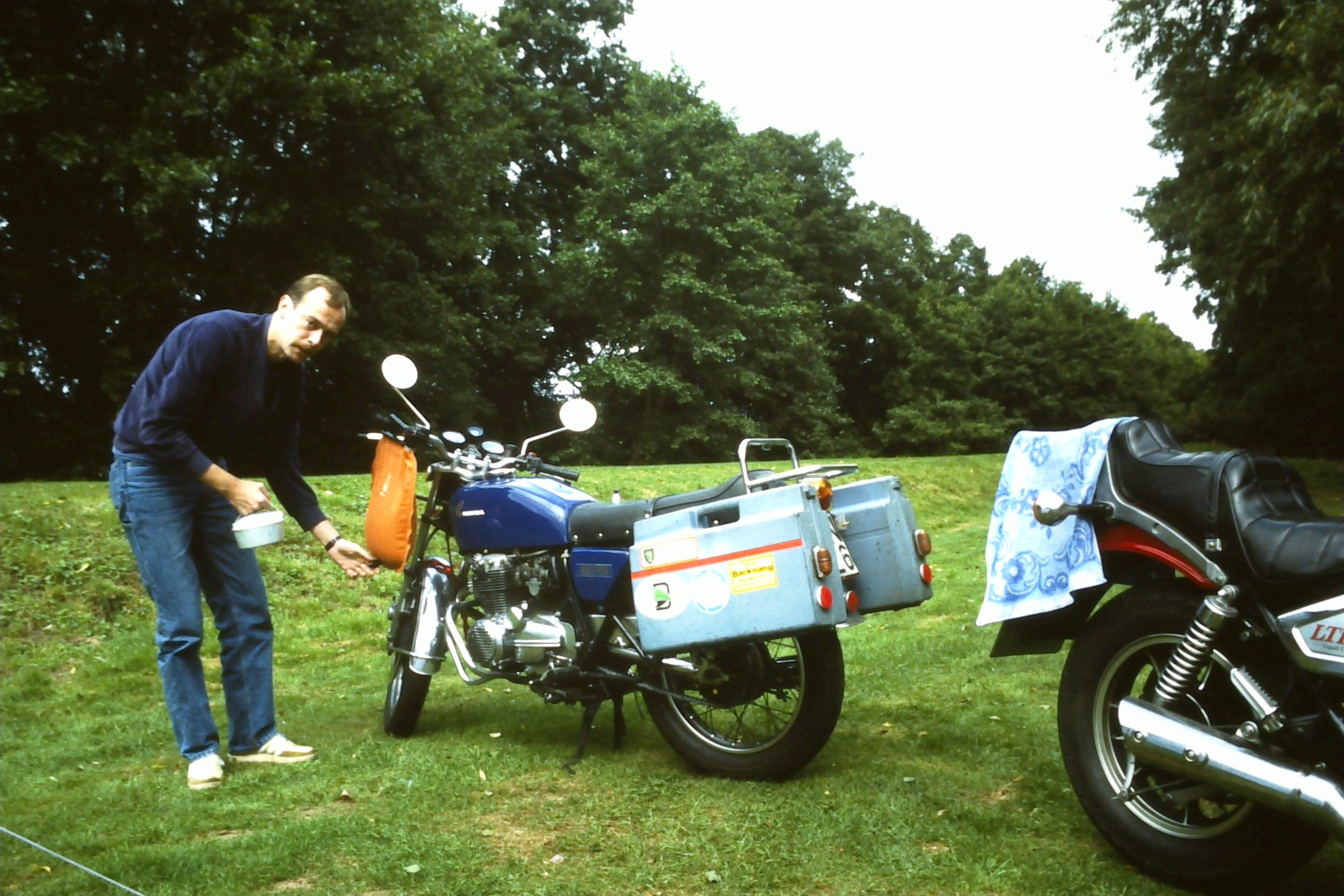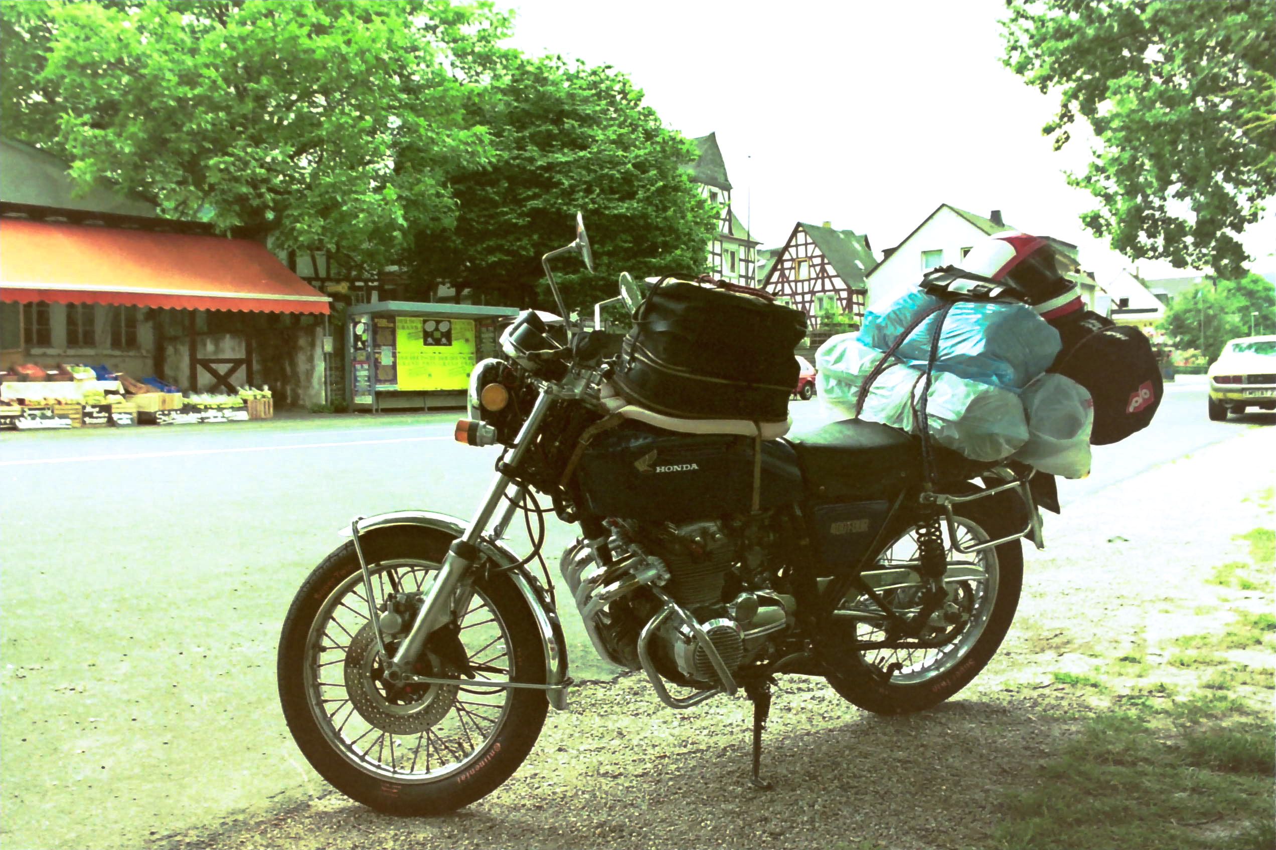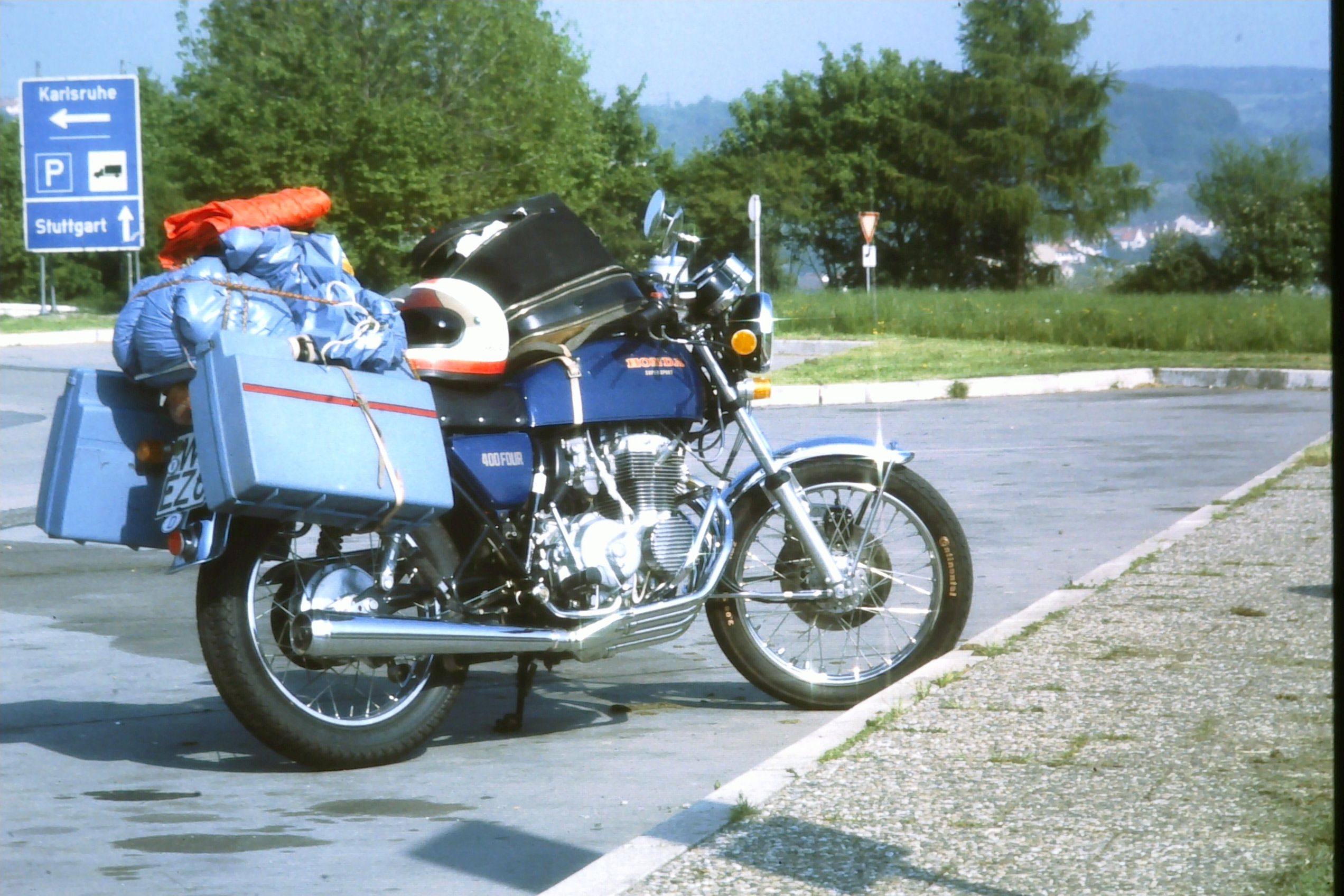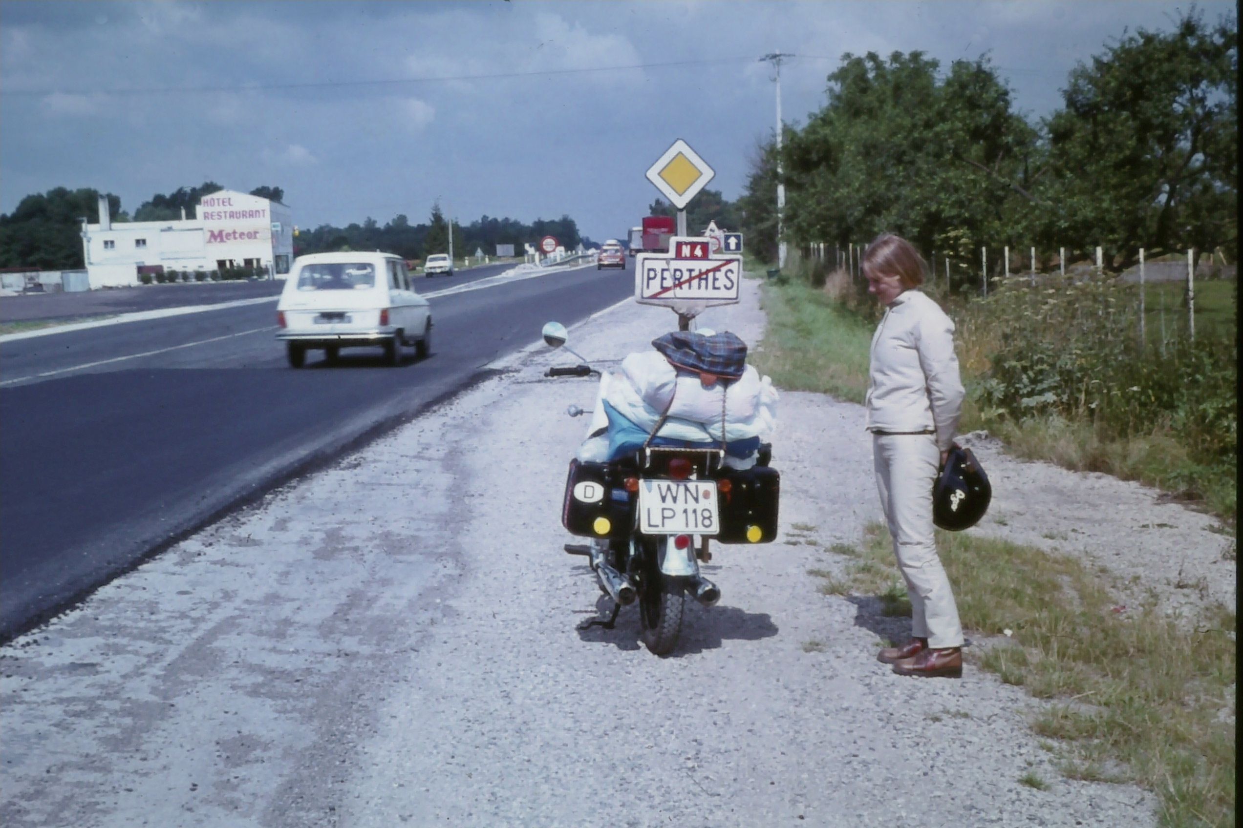 Aber beim Zwischenstopp in Paris erwischt uns eine heftige Schlechtwetterfront, die uns schließlich zur Umkehr zwingt. Nach einem Sechzehn-Stunden-Ritt in selbstgeschneiderten Kunstlederkombis und ohne Regenklamotten durch pausenlosen, strömenden Regen treffe ich zwei Entscheidungen: Erstens fahre ich nie wieder mehr als 350 Kilometer Motorrad an einem Tag, und zweitens muss eine andere Maschine her. Die Erinnerung, wie ich mit Urlaubsgepäck und Sozia auf französischen „Routes Nationales“ an Steigungen bei etwa 82 Stundenkilometern von Sattelzügen mit etwa 84 Stundenkilometern bei heftigem Regen überholt wurde, ist bis heute lebendig.