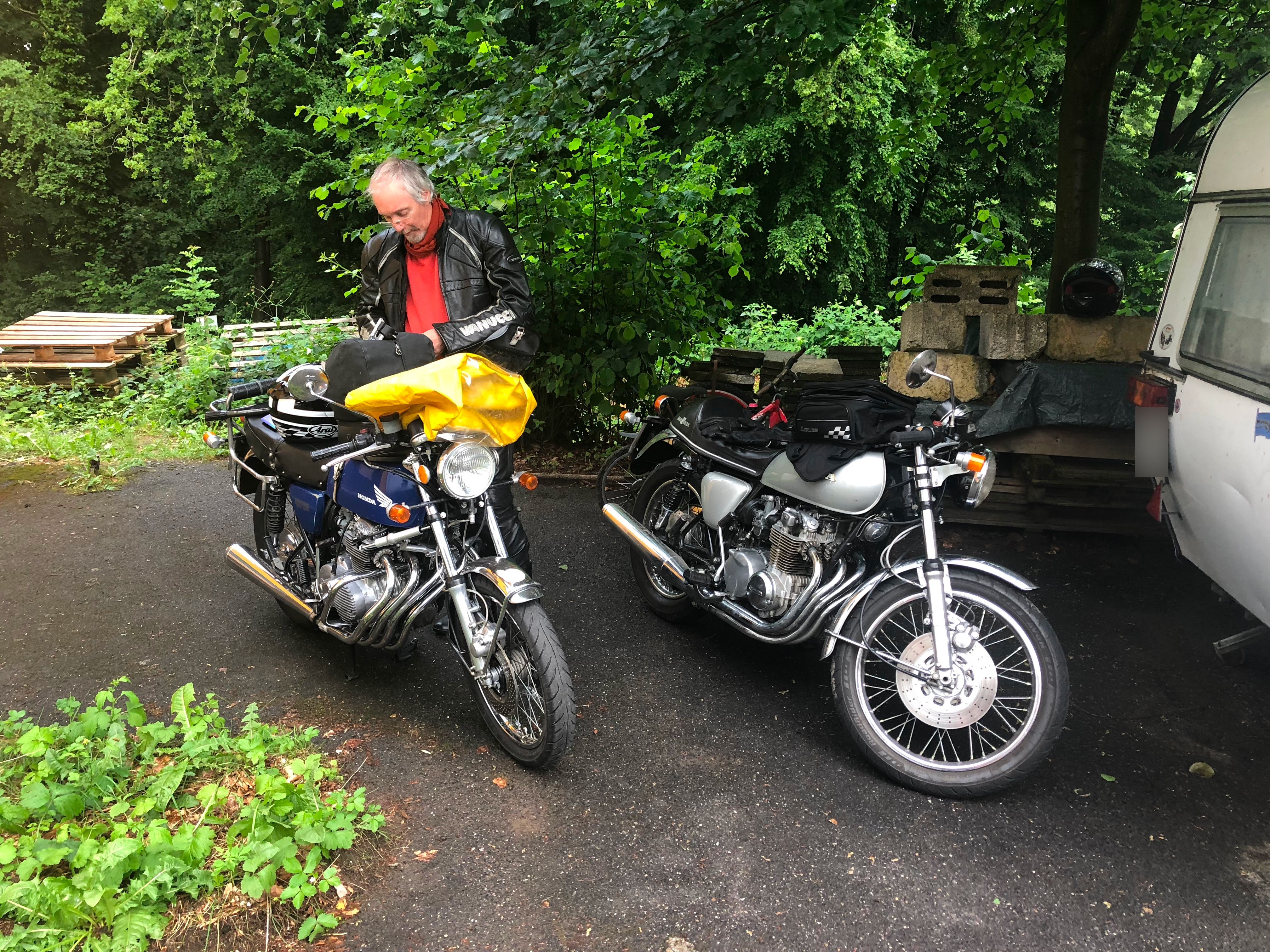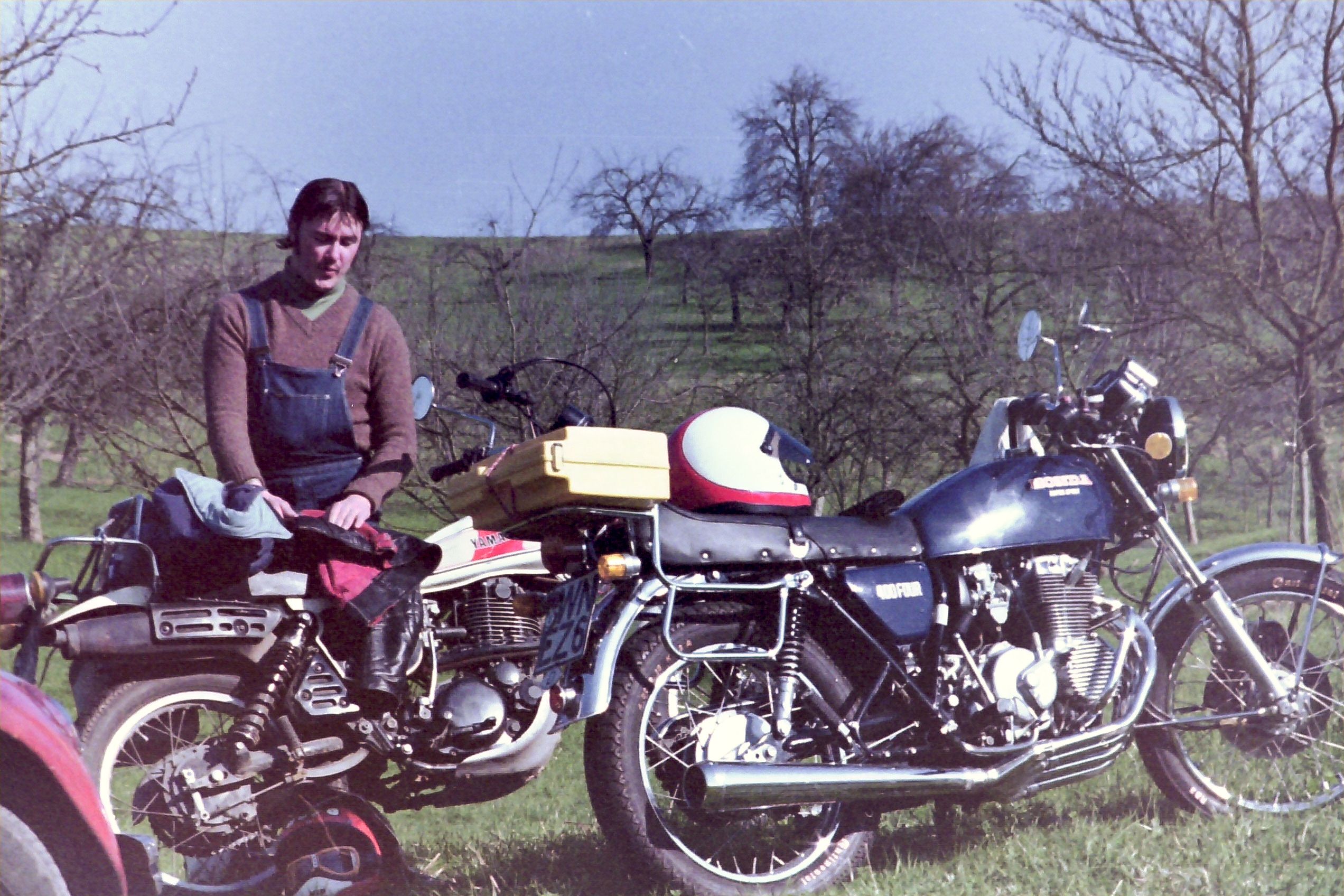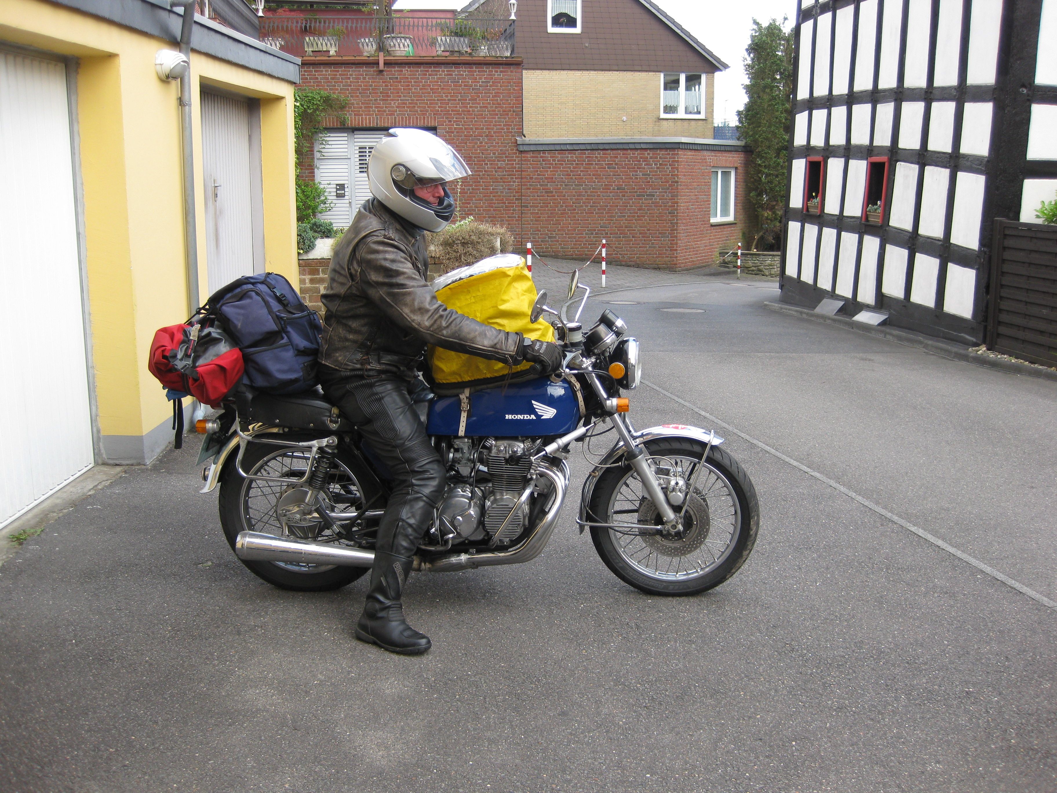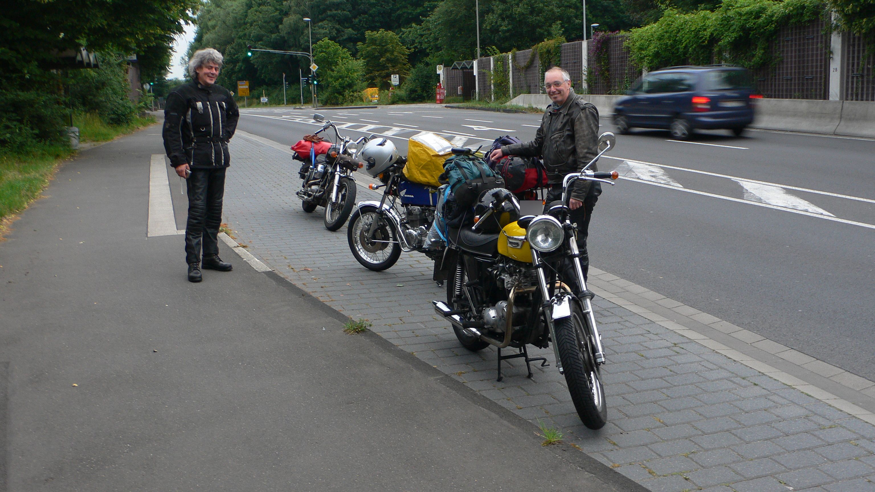 Aber beim Zwischenstopp in Paris erwischt uns eine heftige Schlechtwetterfront, die uns schließlich zur Umkehr zwingt. Nach einem Sechzehn-Stunden-Ritt in selbstgeschneiderten Kunstlederkombis und ohne Regenklamotten durch pausenlosen, strömenden Regen treffe ich zwei Entscheidungen: Erstens fahre ich nie wieder mehr als 350 Kilometer Motorrad an einem Tag, und zweitens muss eine andere Maschine her. Die Erinnerung, wie ich mit Urlaubsgepäck und Sozia auf französischen „Routes Nationales“ an Steigungen bei etwa 82 Stundenkilometern von Sattelzügen mit etwa 84 Stundenkilometern bei heftigem Regen überholt wurde, ist bis heute lebendig.