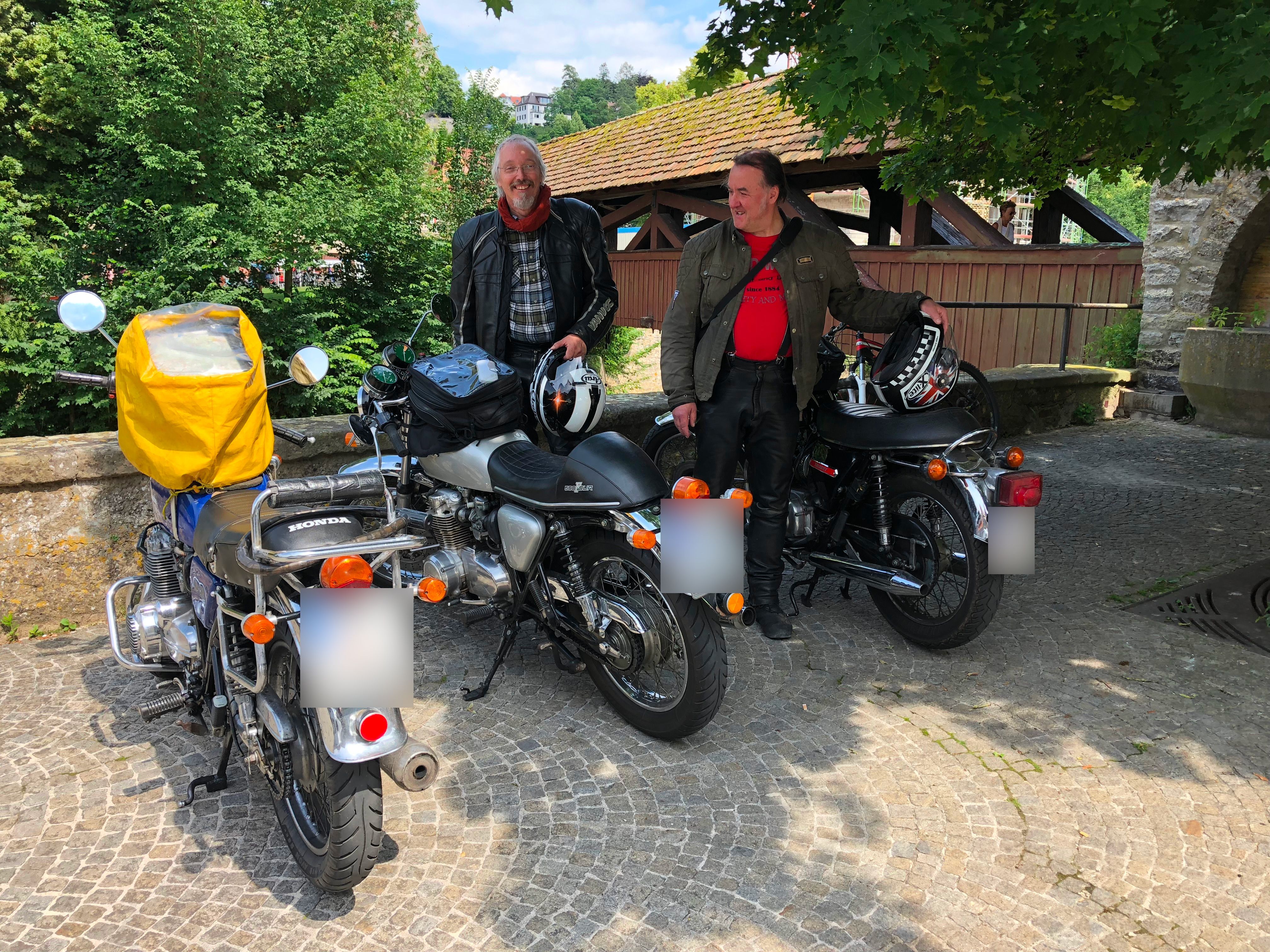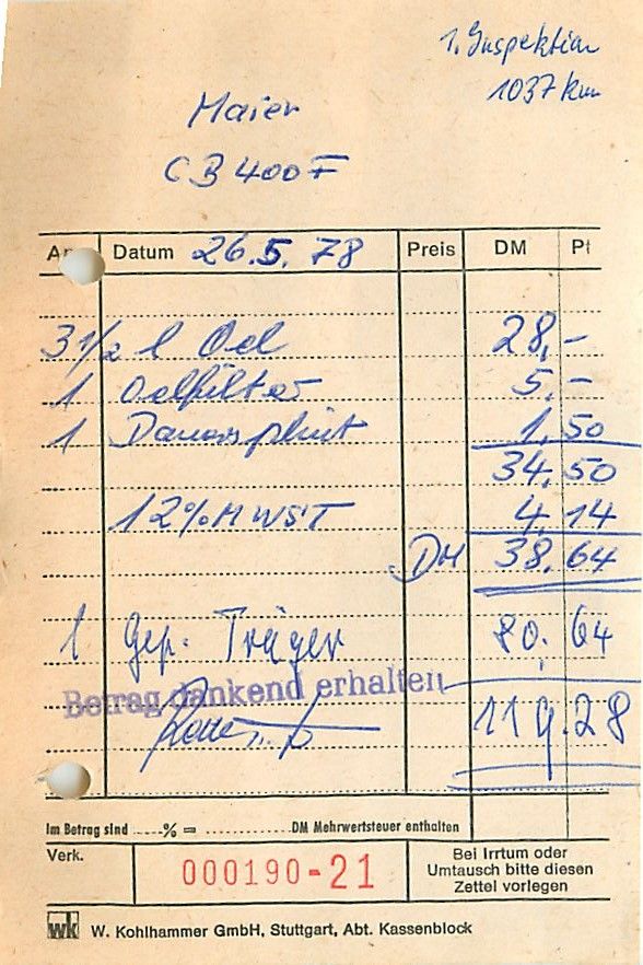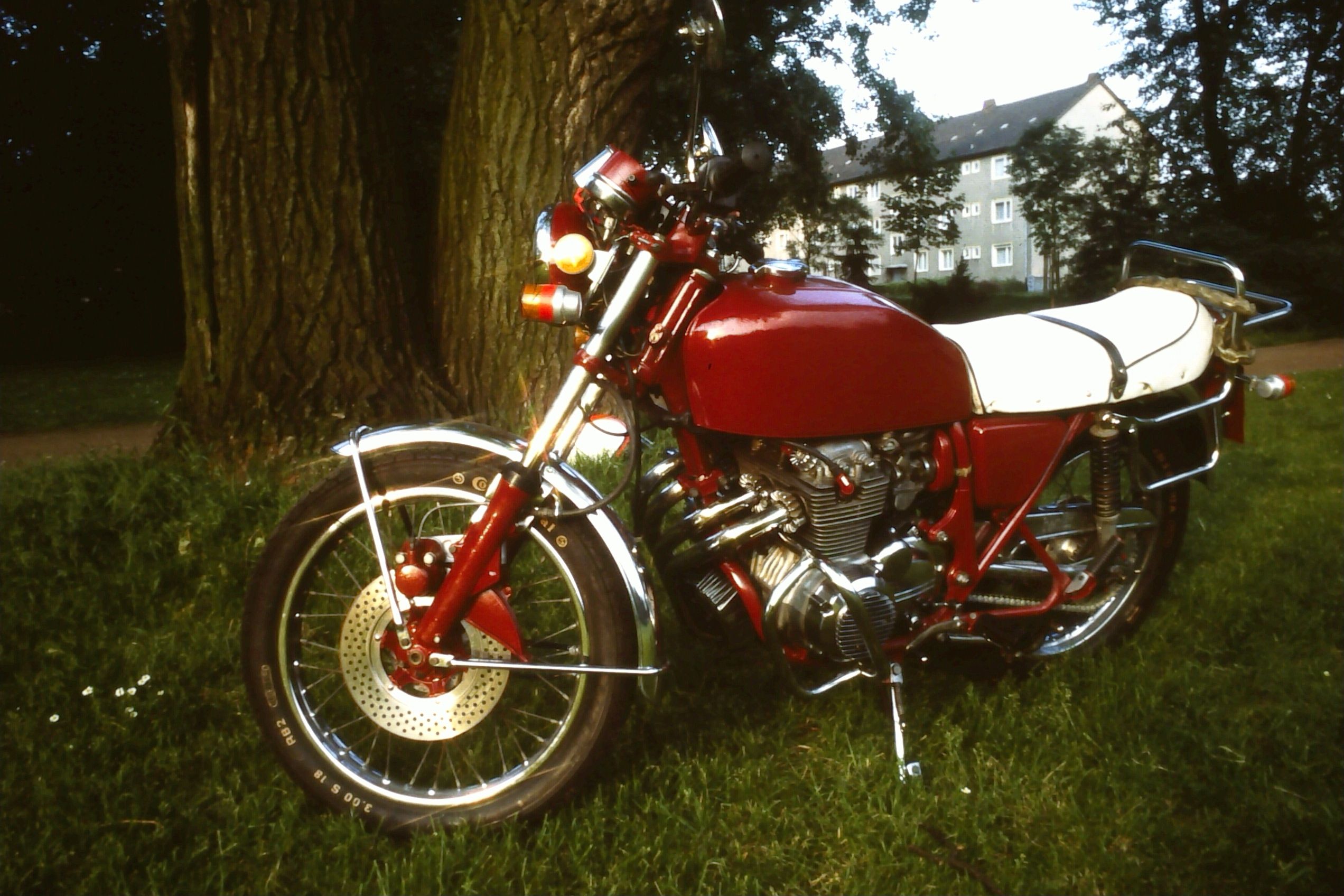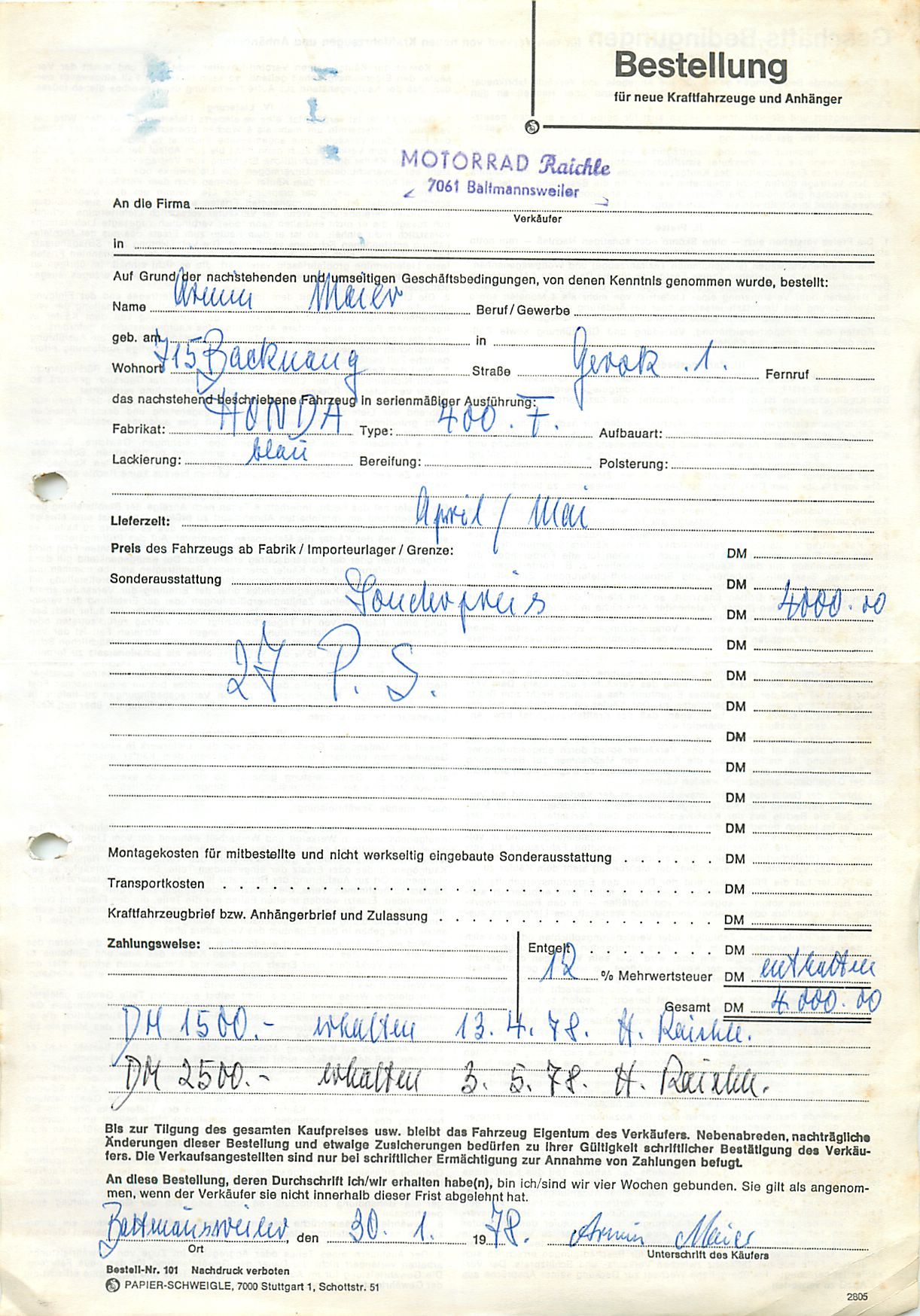 Andreas und ich stehen in dem kleinen Büro und Ausstellungsraum mit den Abmessungen einer Garage bei Helmut Raichle. An der Wand viele Fotos, die unter anderem ihn mit einer Norton Manx bei irgendwelchen Rennen zeigen. Als wir ihm gerade erklären, dass wir auf keinen Fall den Listenpreis für eine 400 Four bezahlen können, hält ein dicker Mercedes vor der Tür. Der Fahrer kommt herein und platzt mit der Feststellung in unser Gespräch, dass sein Sohn in zwei Wochen achtzehn werde und er ihm ein Motorrad schenken wolle. Er wolle also jetzt mal sehen, was es da so gebe. Der alte, brummelige Raichle ist von der großspurigen Art des Herrn sichtlich wenig angetan, aber der Kunde ist halt König. Und dieser Kunde verfügt offensichtlich über ausreichend Finanzen und Kaufwillen, da müssen die zwei Schulbuben erst mal warten. Nachdem der potenzielle Käufer sich zunächst mal über die 550er Honda hat informieren lassen, erklärt er, dass das Ding zu mickrig sei, es müsse schon die 750 Four sein. Die war auch mein Traum, aber damals schlicht unerreichbar. Schließlich fragt er nach dem Preis, und das auf eine Art, aus der deutlich wird, dass er einen erheblichen Preisnachlass erwartet. Raichle dreht sich um, zieht eine Honda-Preisliste aus dem Regal und zeigt mit dem Kommentar „Hier steht der Preis.“ darauf. Kurz danach verlässt ein ziemlich erboster Fast-Kunde den Ausstellungsraum. Raichle wendet sich wieder uns beiden zu und fragt: „So, jetzt erzählt mal, was macht ihr denn? Schule? Lehre?“ Das Gespräch endet damit, dass wir zwei blaue CB 400 Four zum Preis von je 4.000 Deutschen Mark statt des Listenpreises von 4.800 Deutschen Mark bestellen.