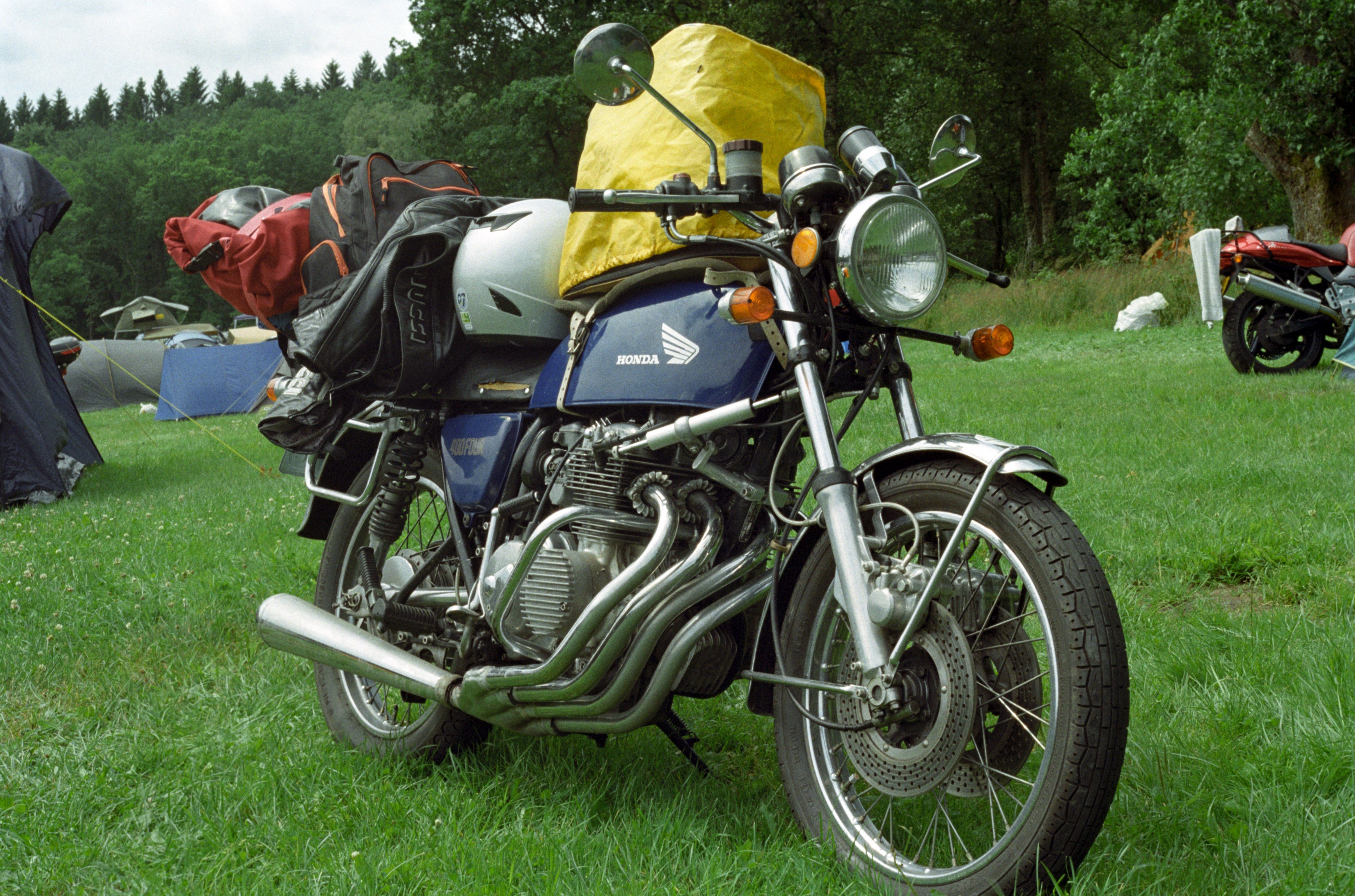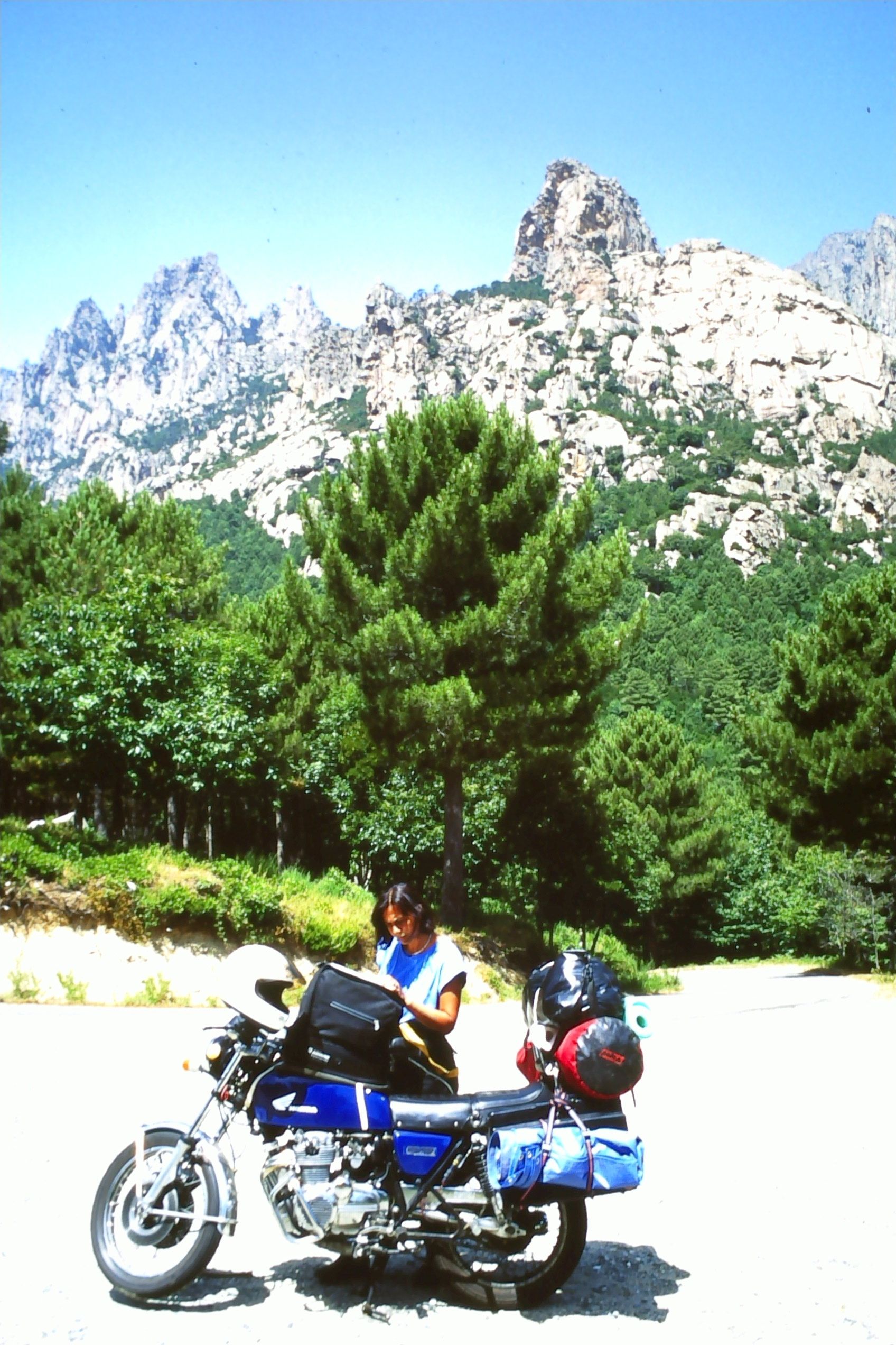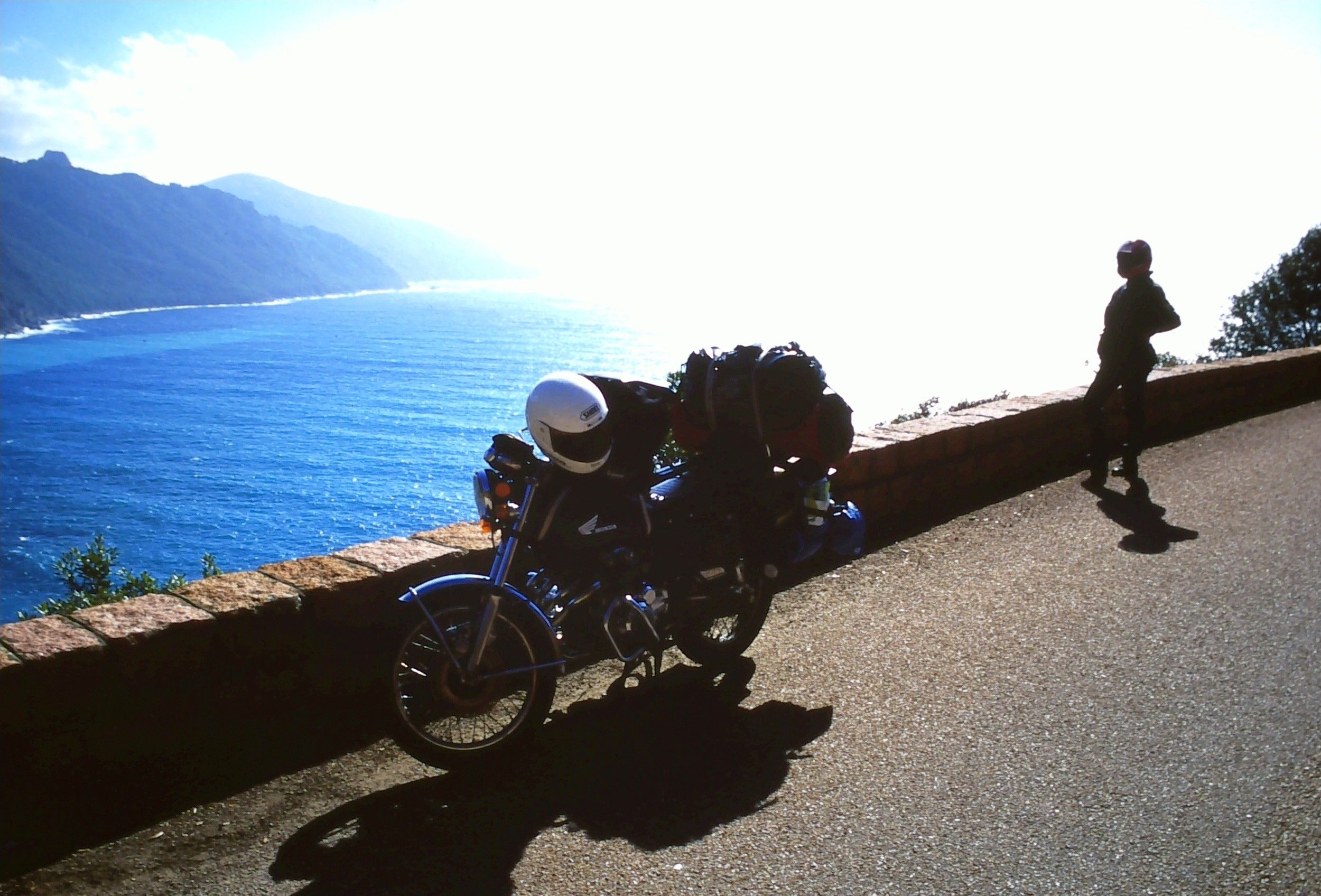 Es sollte die bislang letzte größere Urlaubstour mit der 400 Four werden. Zwei Kinder, ein altes Haus und ein eher mäßig bezahltes Sozialberufler-Dasein schränken die Möglichkeiten nun mal ein. Noch einmal wird die Honda mit dem kompletten Camping-Equipment für zwei Personen beladen. Um ihr die lange Autobahn-Etappe zu ersparen, haben wir den Autoreisezug nach Brindisi gebucht. Keine gute Entscheidung, wie sich zeigen sollte, Murphys Gesetz schlägt mit allem zu, was es zu bieten hat: Verspätung, hektisches Beladen, Transportschäden, ausgefallene Klimaanlage bei Gluthitze, miserabler Service, unfreiwilliger mehrstündiger Aufenthalt, verpasste Fähre. Irgendwie gelingt es uns trotzdem, nach dem Entladen die wunderschöne Strecke durch die Berge zu genießen. Stundenlang fahren wir bei herrlichem Wetter auf verschlungenen Bergstraßen in Richtung Fährhafen. Auf einem kleinen Campingplatz oberhalb des Hafens übernachten wir, um am anderen Morgen zu unchristlicher Zeit einen der wenigen freien Fährplätze zu ergattern. Aber Korsika entschädigt uns mit allem, was es zu bieten hat, es wird ein wunderbarer Urlaub. Wie immer ist auf die Honda absolut Verlass, und die kleinen Bergstraßen der Insel sind das ideale Revier für sie.