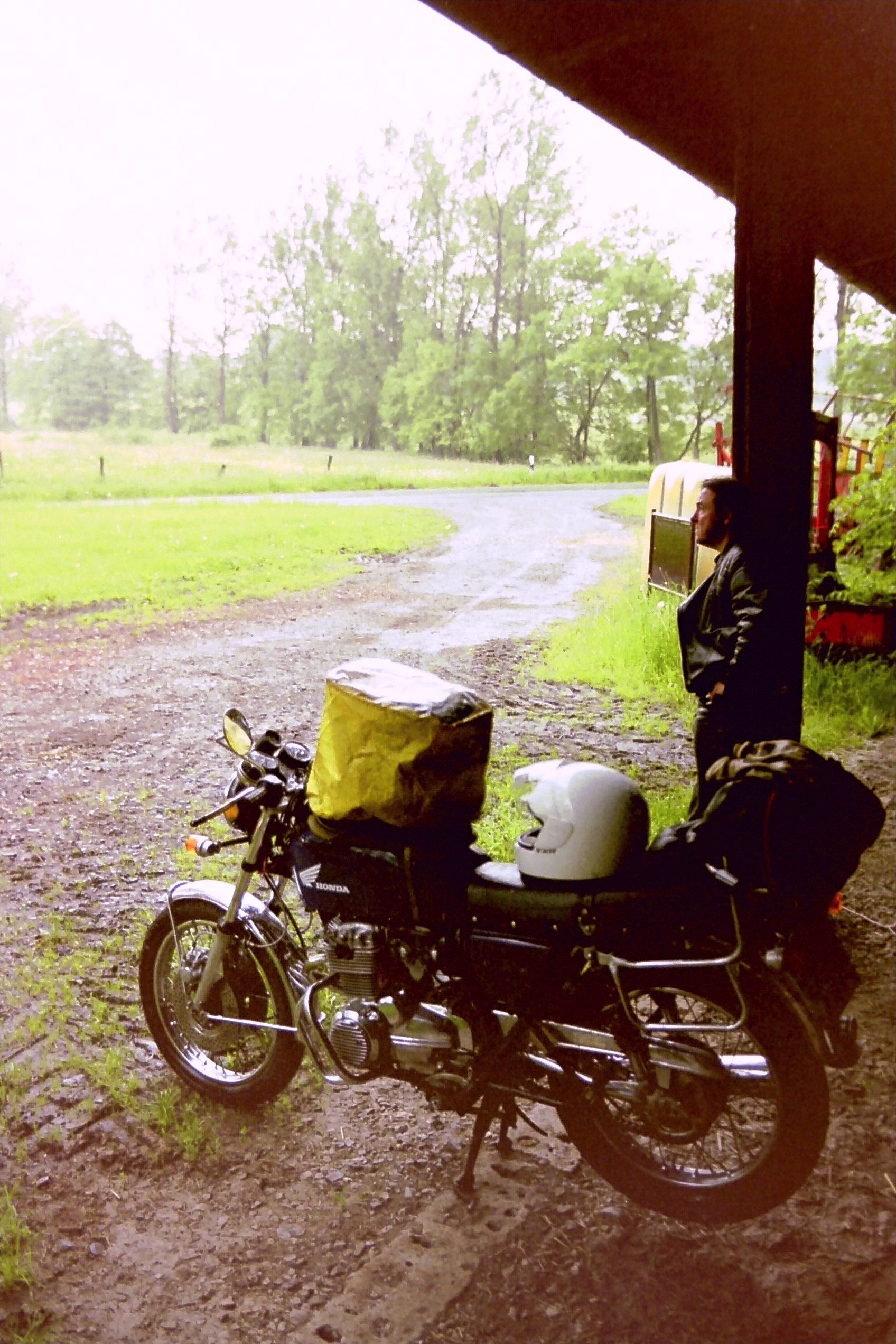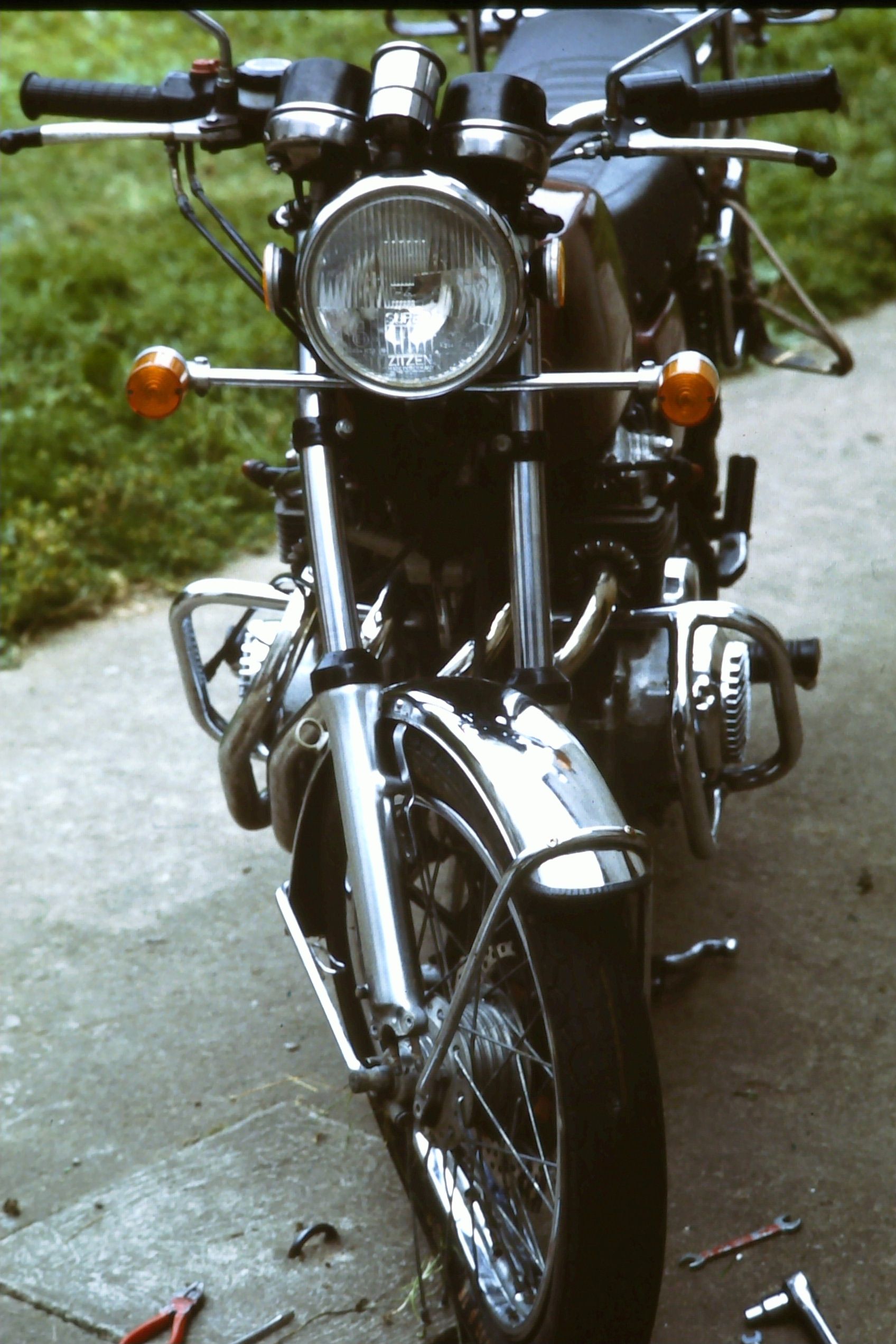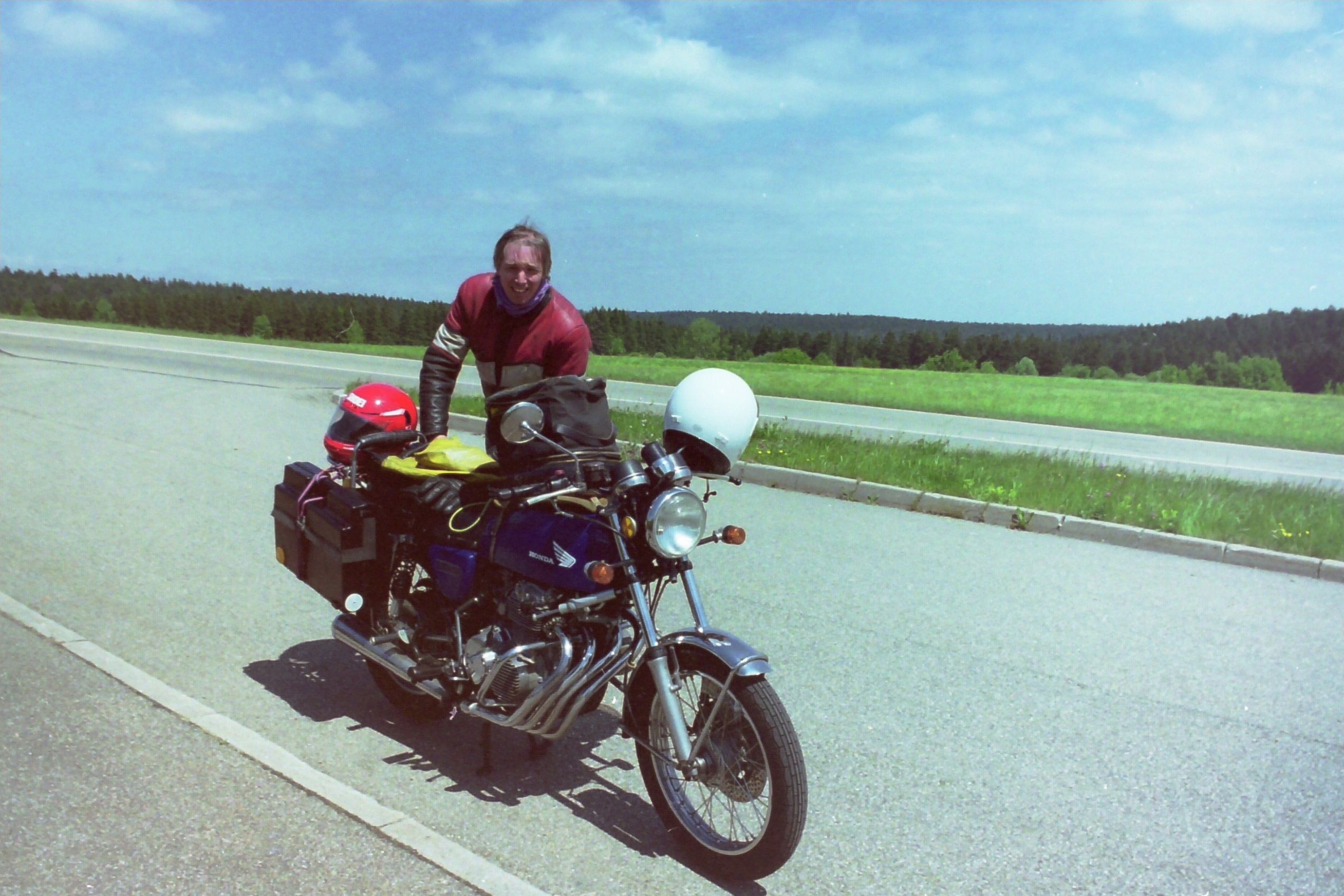 Die Suche nach Ersatzteilen stellt sich als problematisch dar, Honda Irland hat zwei Wochen Betriebsferien. Und mangels Materialnachschub schließen sich die Werkstätten dieser Urlaubsplanung an. Nach einiger Suche bekommen wir aber dank der freundlichen Hilfe eines Jaguar-fahrenden Werkstattkunden, der seinen Rasenmäher reparieren lassen will, telefonischen Kontakt mit dem Werkstattbesitzer, der gerade in Schottland weilt. Am Telefon verhandeln wir den Preis für die gebrauchten und dringend benötigten Teile und bekommen den Standort der Schlachtmaschine genannt. Mit den ausgebauten Teilen machen wir uns auf den Rückweg. Nachdem alles montiert ist, stellt sich heraus, dass die Gabelbrücken verzogen sind. Da ich nur noch wenig Zeit für die Rückreise habe, entschließen wir uns einfach alles grade zu biegen. Mangels Schraubstock wird ein Tor zur angrenzenden Weide kurzerhand umfunktioniert, ein Standrohr wird in das untere Stahlrohr des Tors gesteckte, dann die Gabelbrücke drauf geschraubt, anschließend kommt das zweite Standrohr verkehrt rum rein. Dann steige ich auf das herausragende Standrohr und wippe vorsichtig, Albert liegt auf dem Bauch und peilt. Alles wird nach Augenmaß gerichtet, nach einigen Stunden ist die Honda startklar und beladen. Die Zeit ist knapp, in drei Tagen muss ich den Zivildienst wieder antreten. Sehr „zügig“ geht es zur Fähre nach Rosslare, die wir gerade noch rechtzeitig erreichen. Von Cherbourg fahren wir dann so schnell wie möglich weiter und spulen mal wieder 1.000 Kilometer in gut zehn Stunden fast ausschließlich auf „Routes Nationales“ ab, aber da die Honda die unsägliche Drossel los ist, nimmt sie’s gelassen. Den Zivildienst trete ich etwas übermüdet, aber pünktlich wieder an.