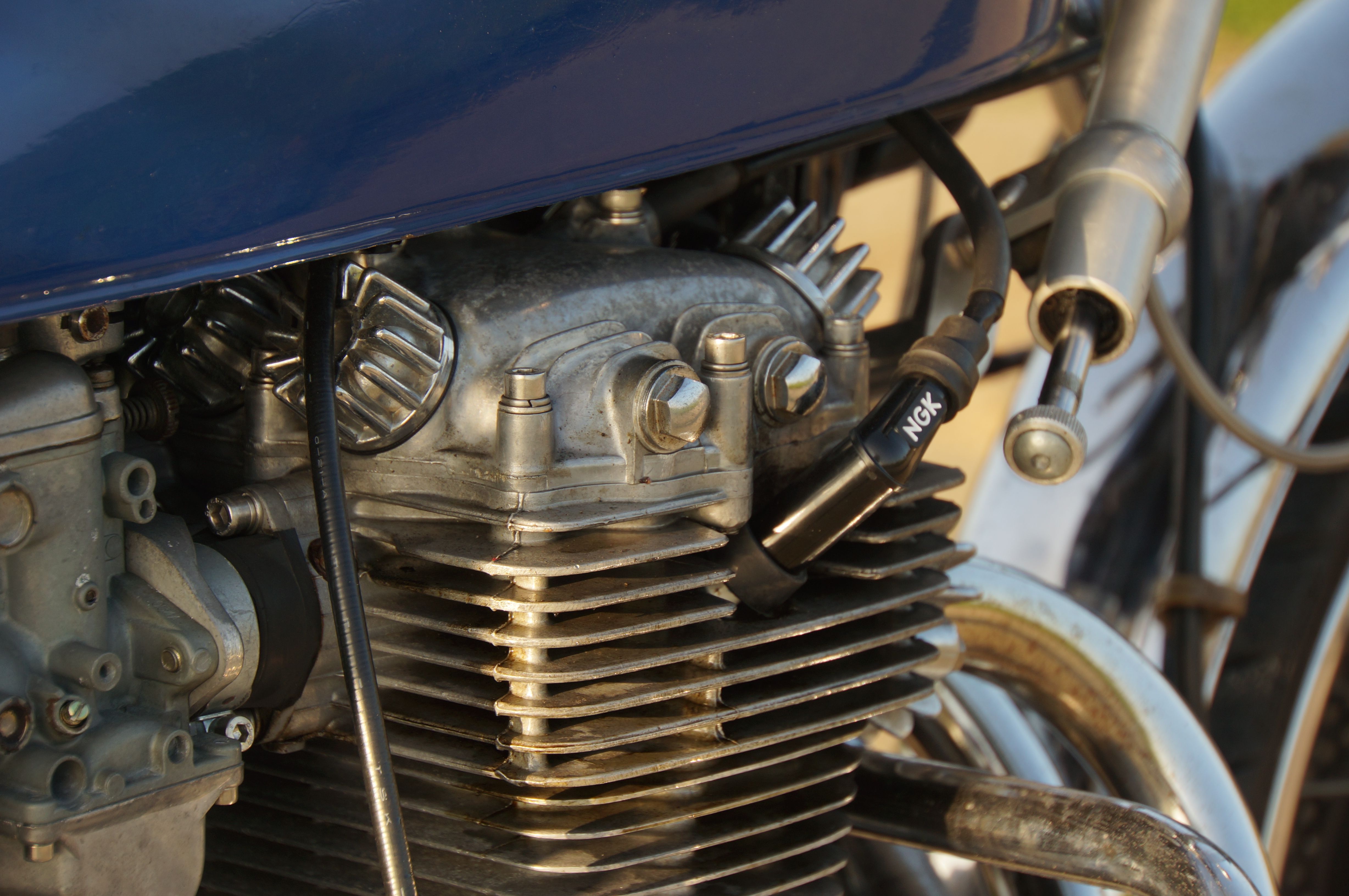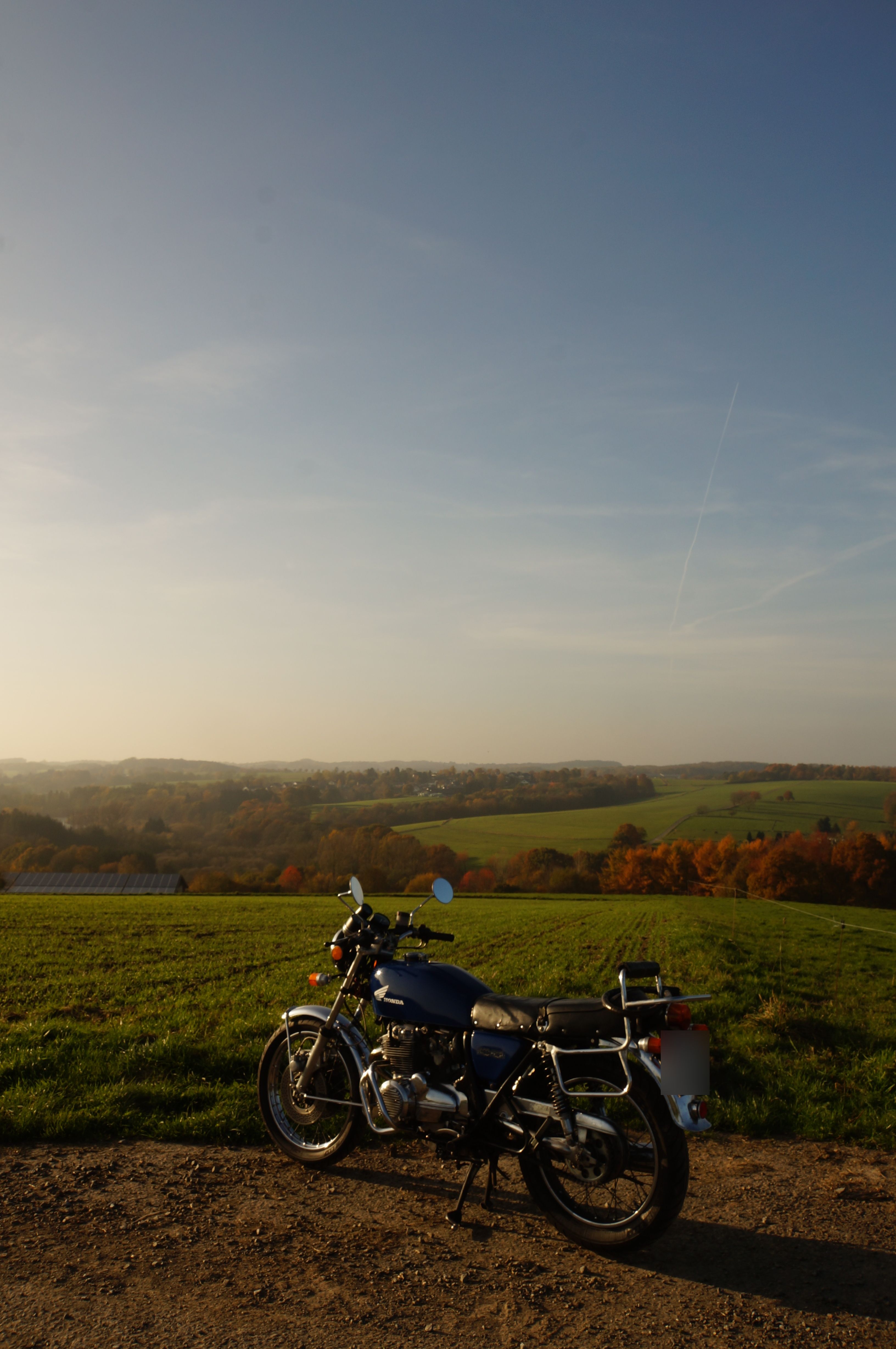 In einer der Kurven liegt der erste umgekippte Baum, zum Glück ragt nichts in die Fahrbahn. Unten geht’s über die Agger-Brücke, der kleine seichte Fluss ist über Nacht zum reißenden Strom geworden. Ich entscheide mich, lieber nach links auf die Hauptverkehrsader abzubiegen und die sonst von mir bevorzugten Sträßchen durch Felder und Wälder diesmal zu meiden, man muss ja keine unnötigen Risiken eingehen. Ich fahre durch Overath und stelle fest, dass die positive Wirtschaftslage und die niedrigen Bauzinsen auch hier für eine rege Bautätigkeit sorgen. Die lange, gut ausgebaute Steigung nach dem Ortsausgang bietet die Möglichkeit, den Motor endlich mal auf Drehzahl kommen zu lassen und alle sechs Gänge durchzuschalten. Die ausgesprochene Drehfreudigkeit – der rote Bereich beginnt erst bei 10.000 Umdrehungen pro Minute – und das Sechsganggetriebe sind der ergänzenden Modellbezeichnung „Super Sports“ geschuldet. Mitte der siebziger Jahre reichten eben noch 400 Kubikzentimeter zum Supersportler. Umso erstaunlicher, dass dieses Motorrad sich trotz des kleinen Hubraums auch als Tourer so gut schlägt.