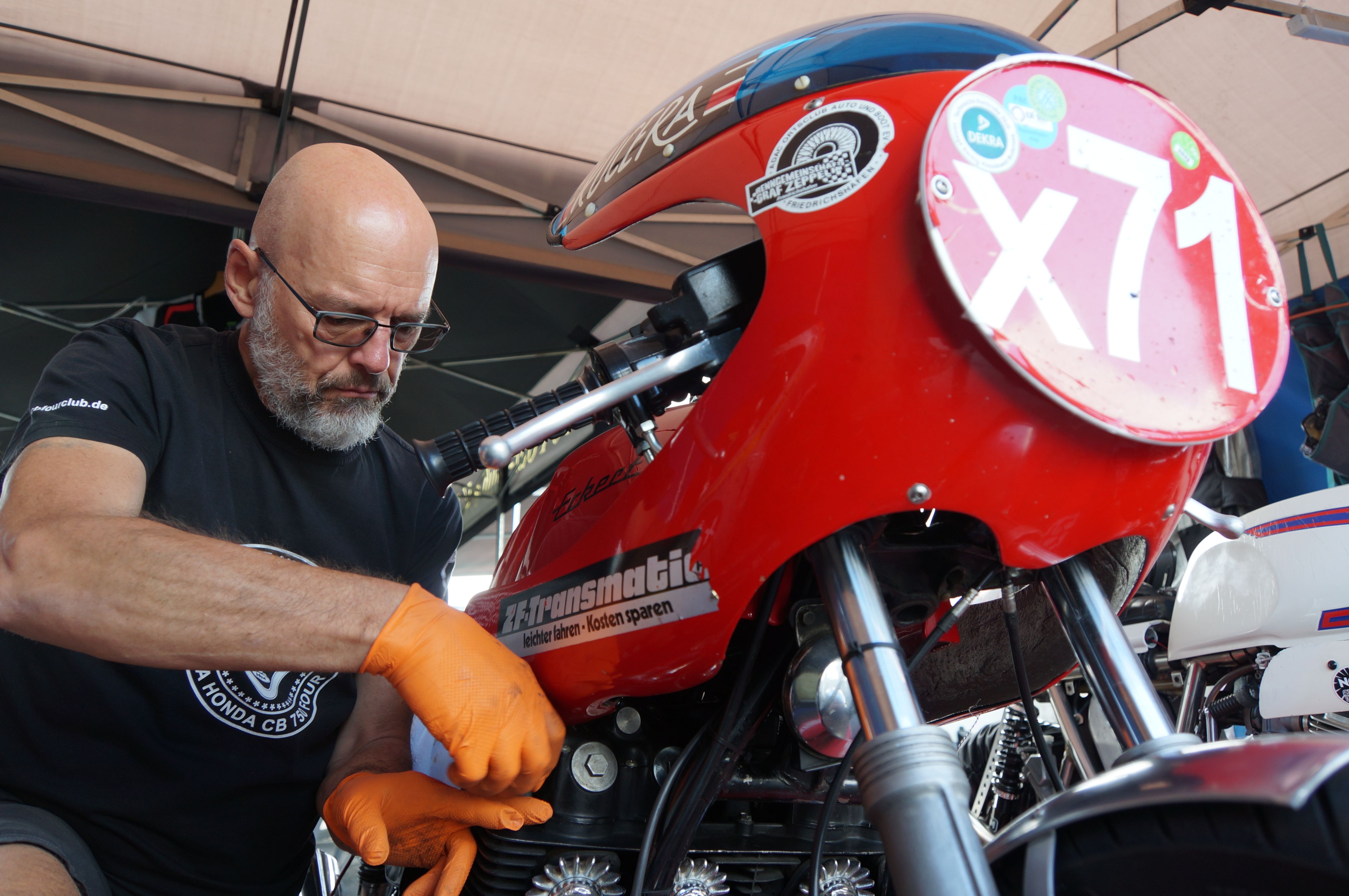 So sollte im Juli der ‚Kölner Kurs‘ am Nürburgring mein erster Start in diesem Jahr sein. Da passte es gut, dass die Veranstaltung dieses Jahr nicht schon im Mai lag, und statt einem Tag zwei Tage zur Verfügung standen. Es hat schon fast Tradition, dass ‚Ago‘ schon am Donnerstag zu mir kommt und wir nach einem netten Abend am Freitag dann zusammen in die Eifel fahren. Diesmal hatte ich noch einen kleinen Auftrag von Guido Kupper (Redakteur der MOTORRAD-CLASSIC). FOUR-Club-Mitglied Peter S. hat eine Eckert-HONDA mit Historie erworben und startklar gemacht. Für einen entsprechenden Artikel wurden noch Fotos gebraucht. Um die Fahrfotos kümmerte sich Guido Urfei, Pressemann der DHM, und seine beiden Fotografen.