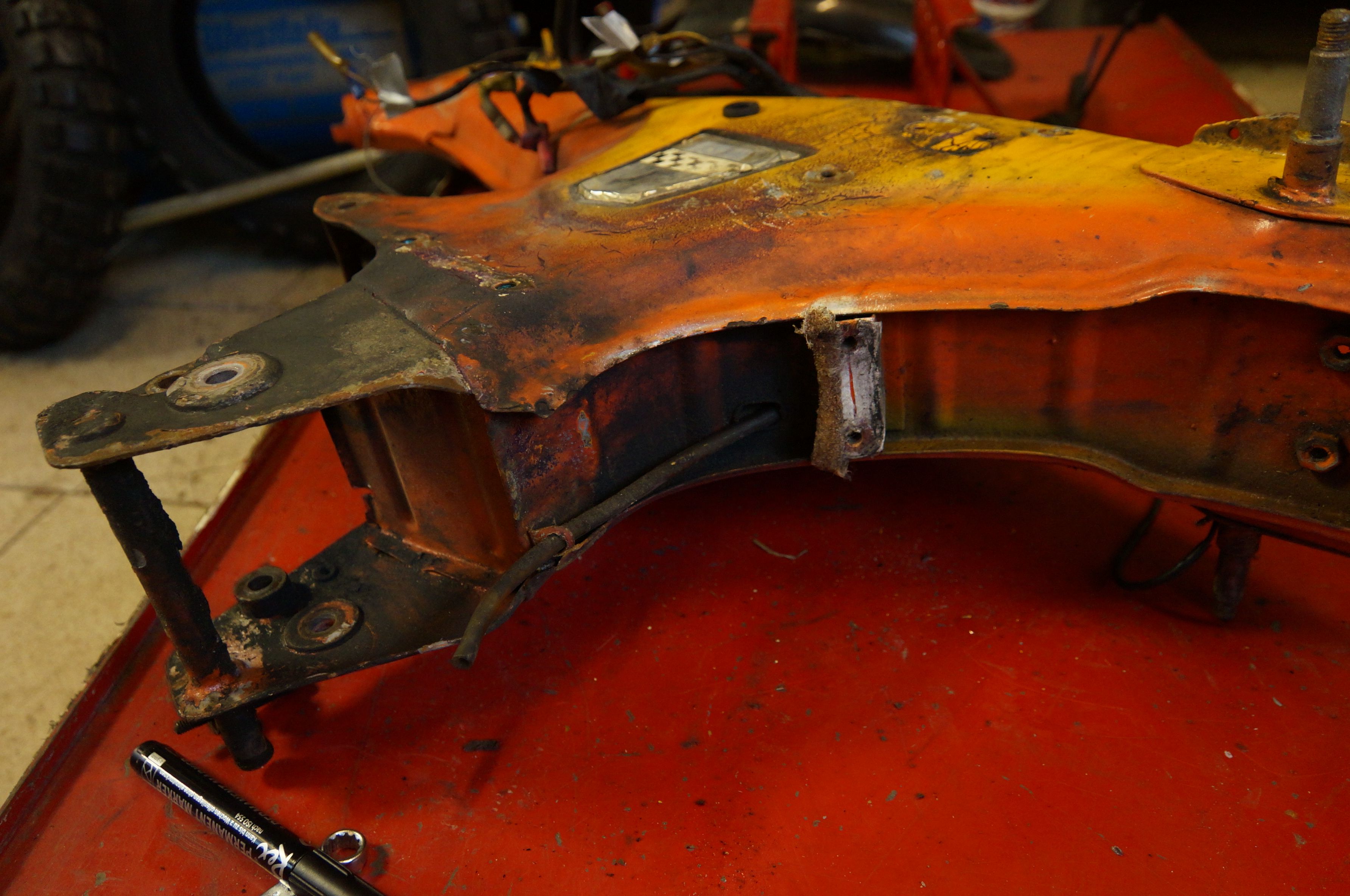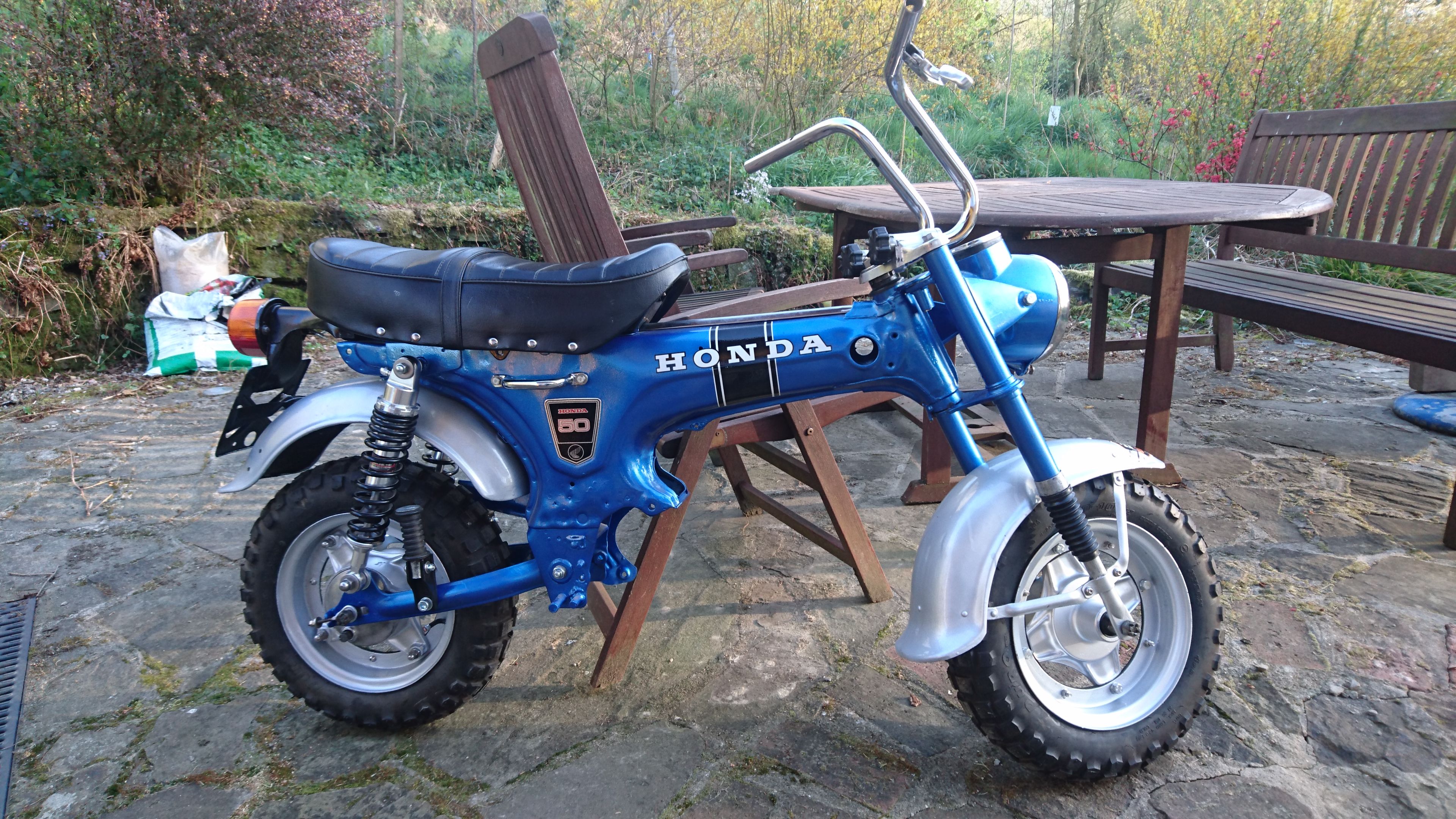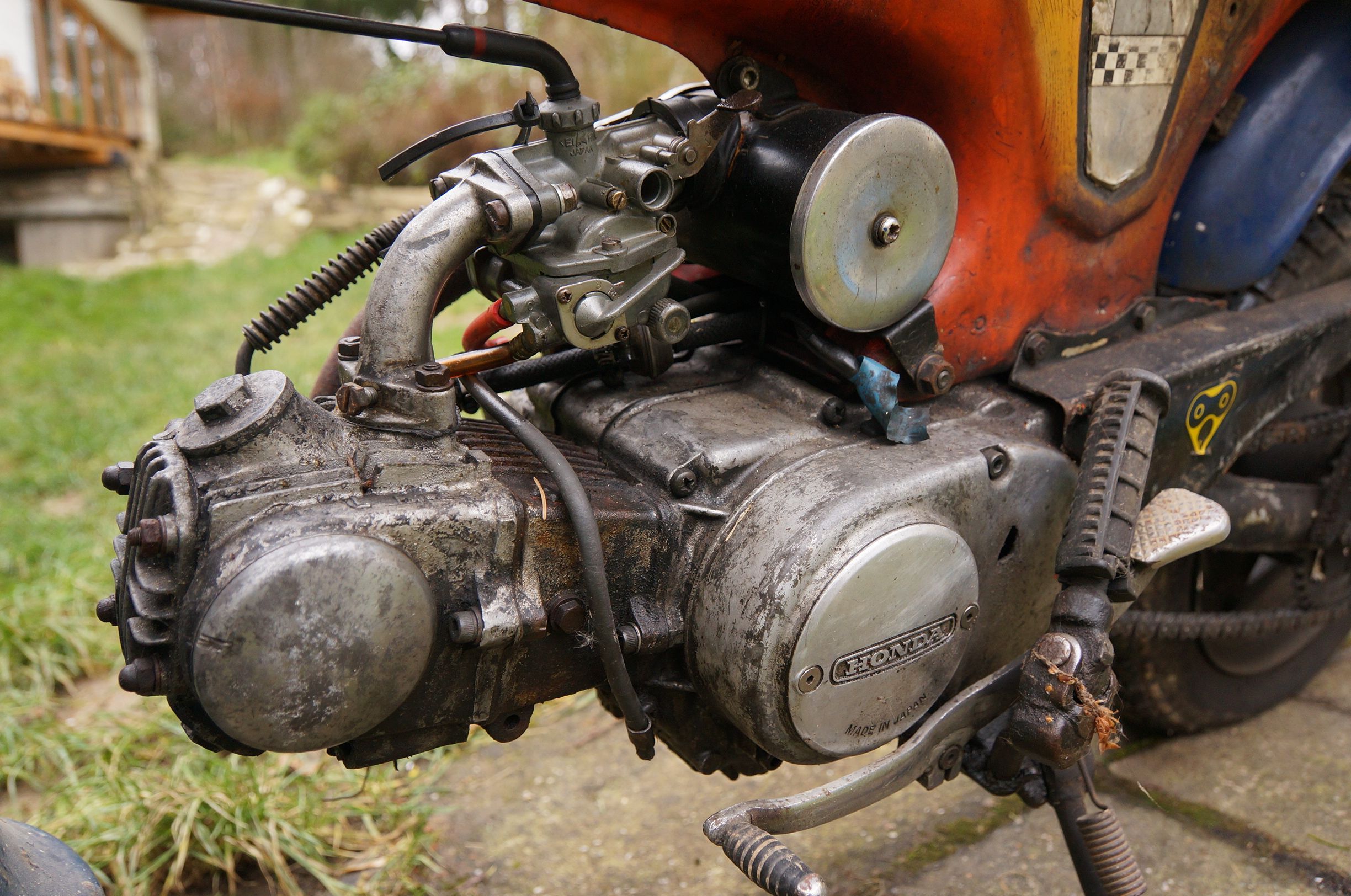 Eines davon ist ein Honda-Dax-Modell. Ein Sechs-Volt-Modell, also aus den frühen siebziger Jahren. Mit sechzehn mein Traum, aber nicht bezahlbar. Praktisch, weil’s in den Kofferraum passt, ideal für kleine Einkaufsfahrten in der näheren Umgebung und für’s Fahrerlager. Wird aber einfach zu teuer gehandelt. Irgendwann ist mir dann eine Anzeige bei ebay-Kleinazeigen aufgefallen. Eine völlig runtergerittene Dax, eigentlich ein Fall für den Schrott, kein Versand, nur an Selbstabholer. Standort: Am Arsch der Welt. Das war meine Chance, da ich selbst ziemlich abseits wohne, war’s für mich eine nicht ganz so lange Anreise. Den Preis konnte ich wegen des üblen Zustands und mangels laufendem Motor noch mal etwas drücken.