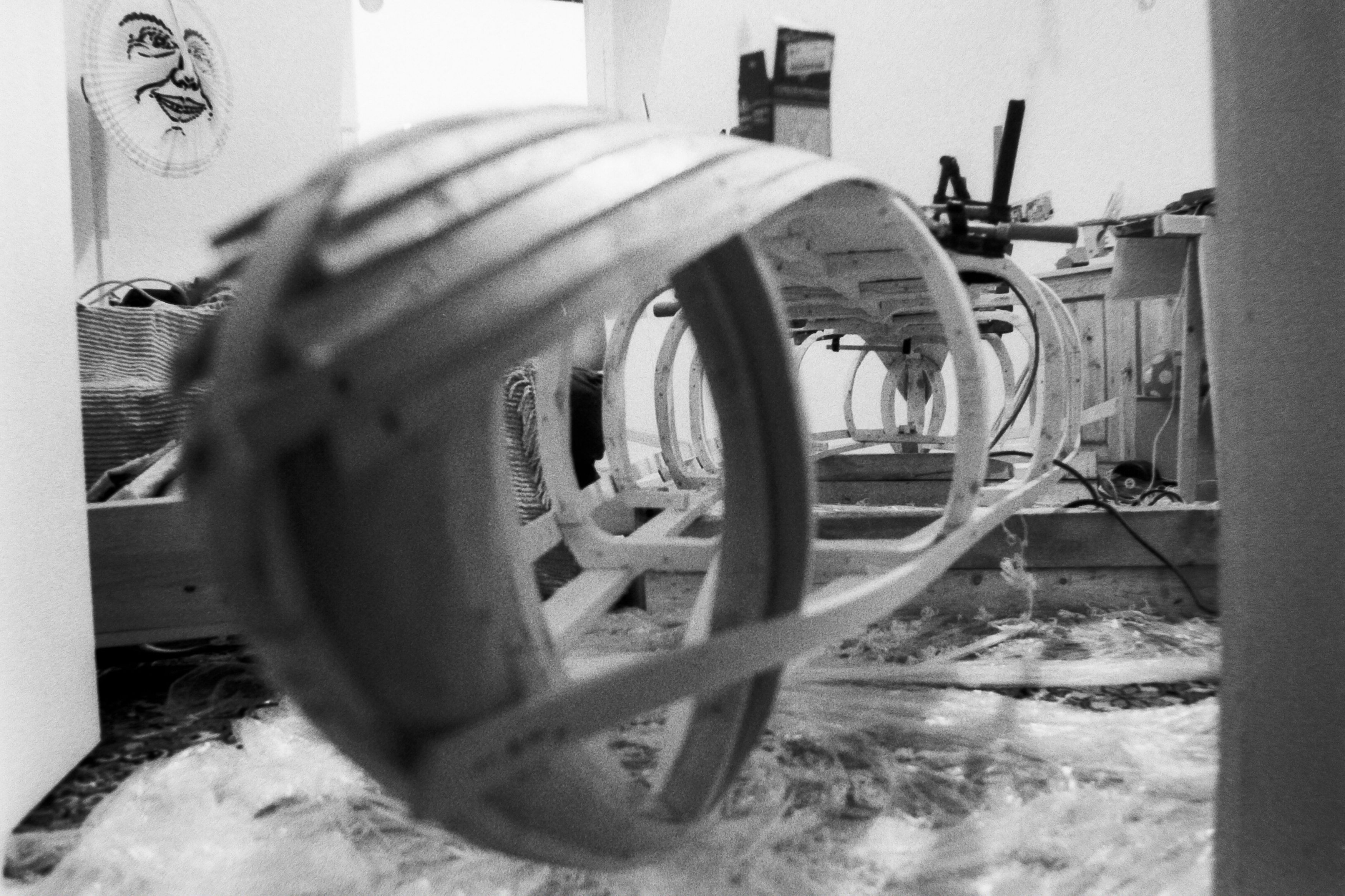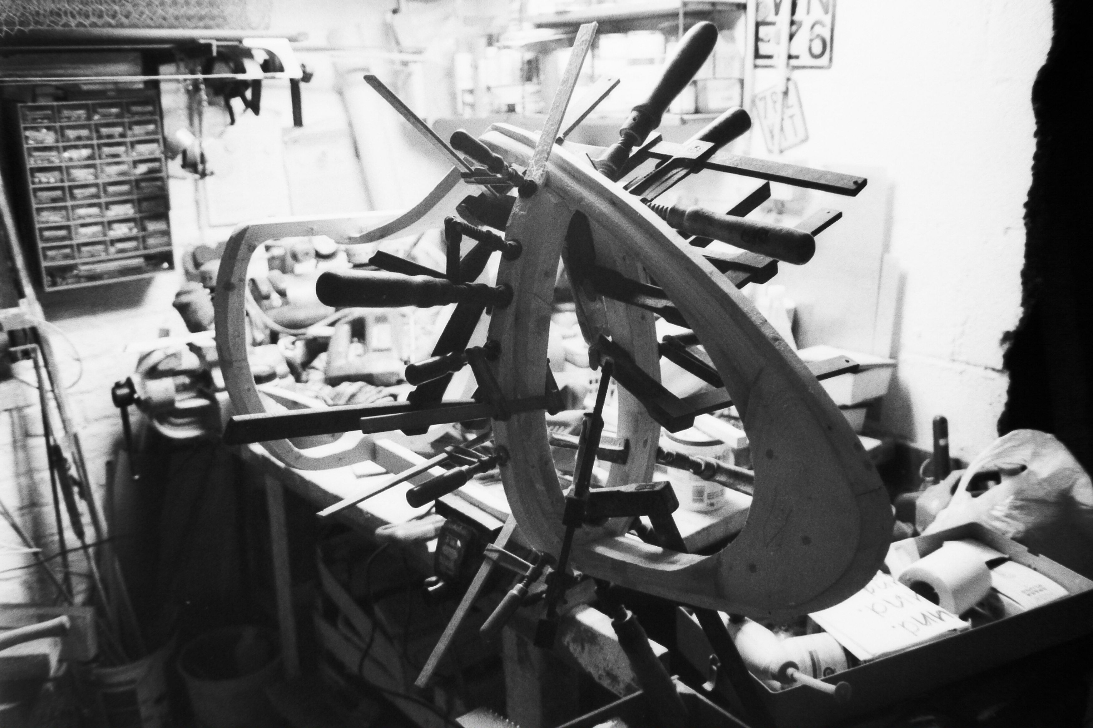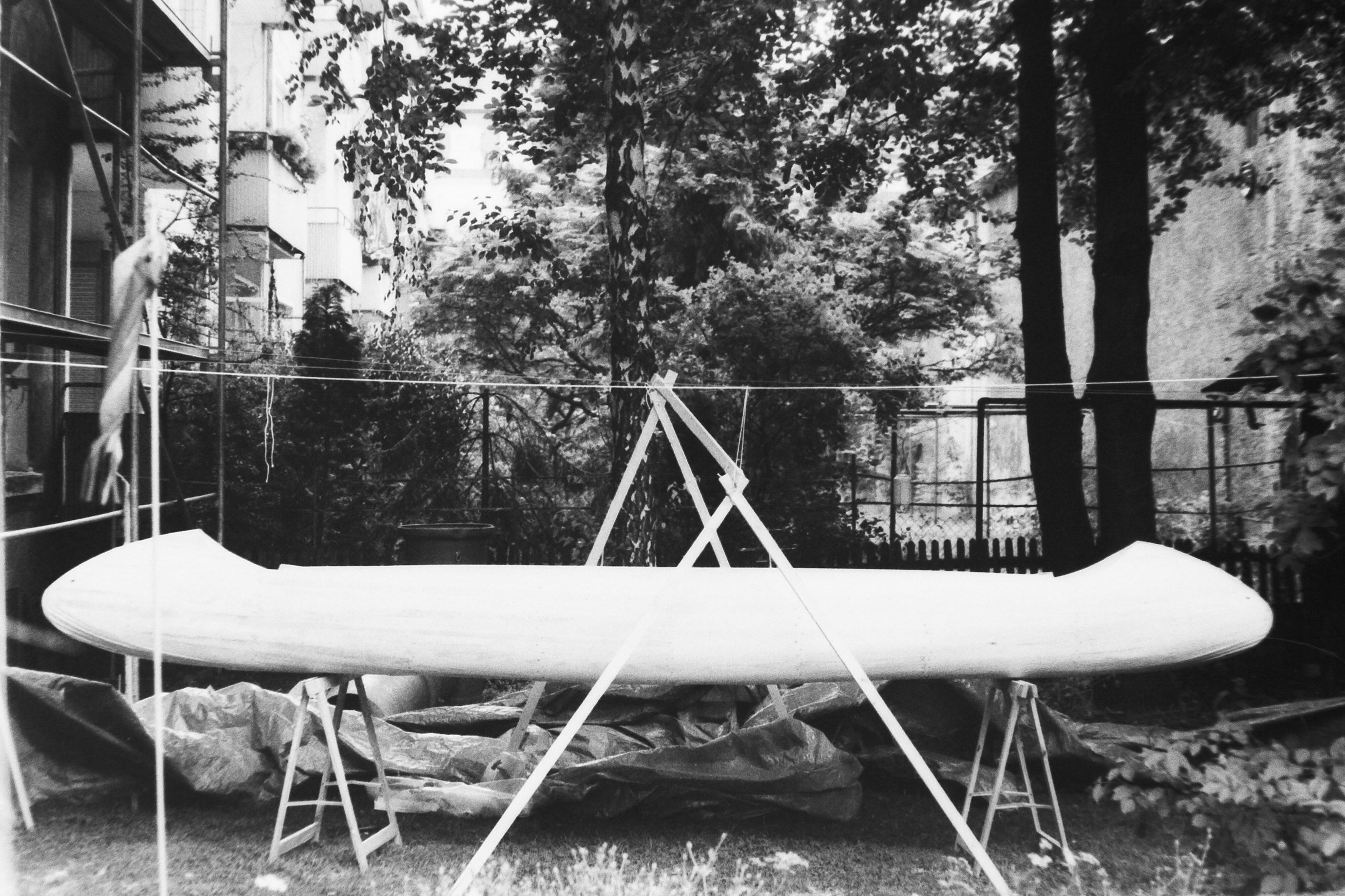 Der Nippeser Altbau wurde vom neuen Eigentümer gerade saniert und der Dachstuhl ausgebaut. Ich nutzte die günstige Gelegenheit und plante den Materialkran am Gerüst für den Kanubau mit ein. Der fertige Boots-Rohbau schwebte daran aus dem Fenster und aus dem dritten Stock runter auf die Straße. Die Restarbeiten wie Schleifen und Lackieren erledigte ich im Hinterhof, das wäre in der Wohnung auch nicht so angenehm gewesen.