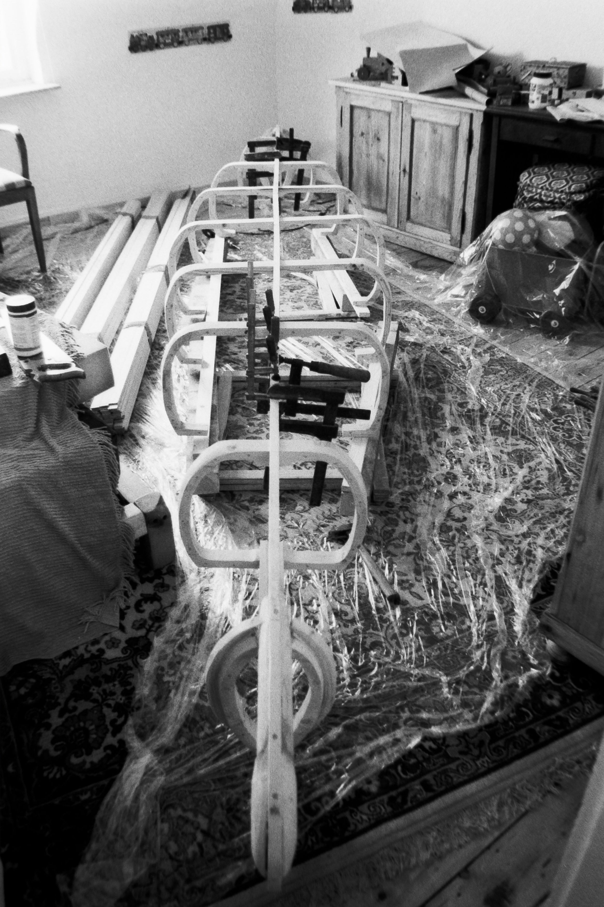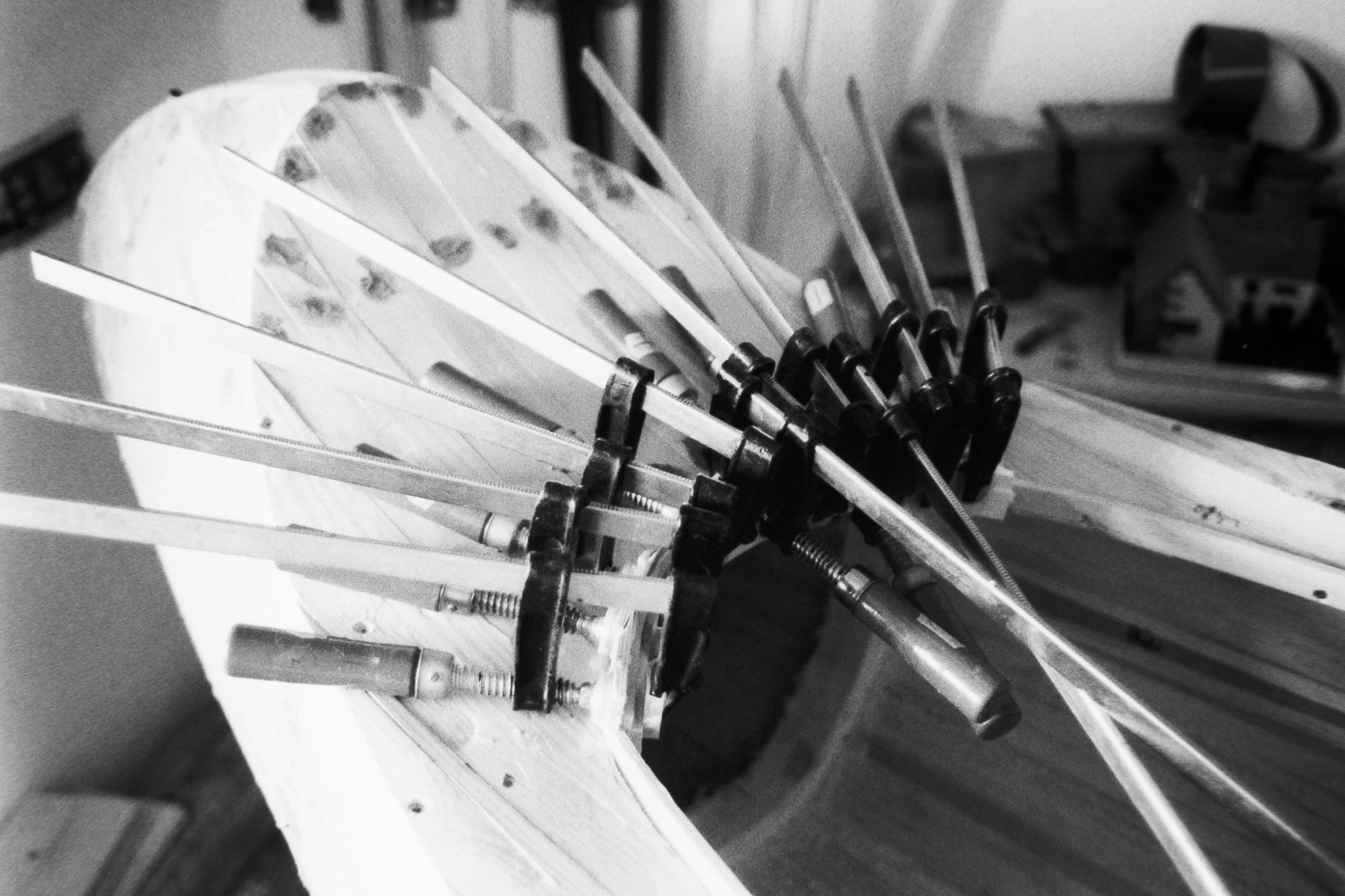 Also den Gatz-Katalog genommen, die Maße aus dem A-4-Foto genommen und hochgerechnet, und los ging es. Bug- und Heck-Rahmen konnte ich noch in meiner kleinen Kellerwerkstatt bauen, ebenso den Mittelteil. Hätte ich diese drei Teile aber da unten miteinander verleimt, wäre ich nicht mehr um die Ecken im Flur und die Kellertreppe hoch gekommen. Also wurde im dritten Stock weiter gebaut, da passte es diagonal in eines der Zimmer. Über die Spanten wurden insgesamt etwa 500 Leisten überlappend in zwei Lagen verleimt und verschraubt.